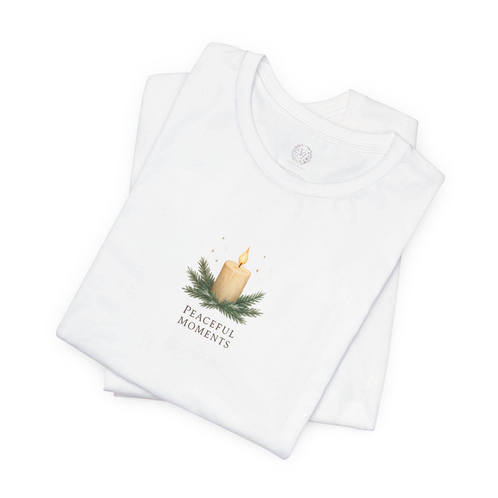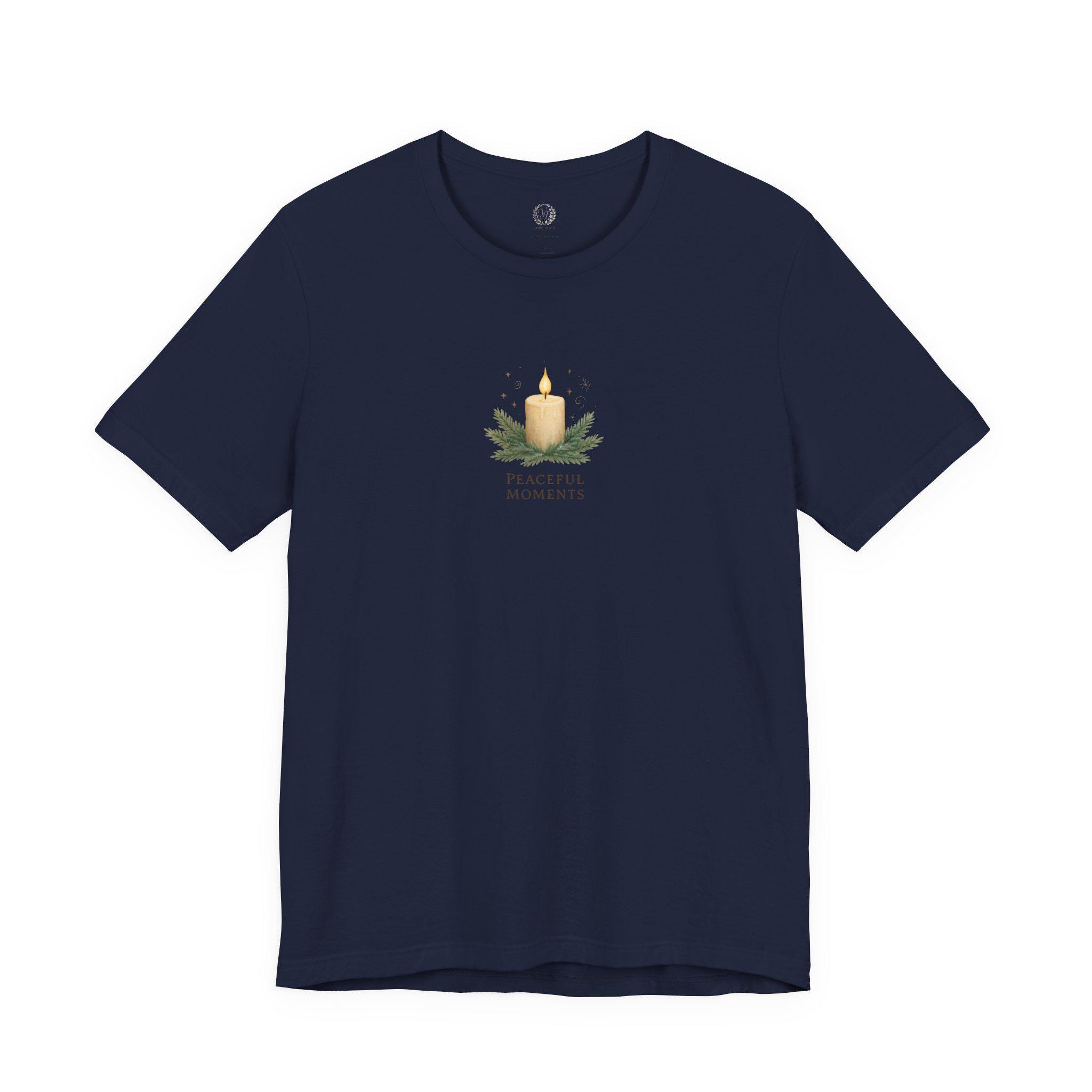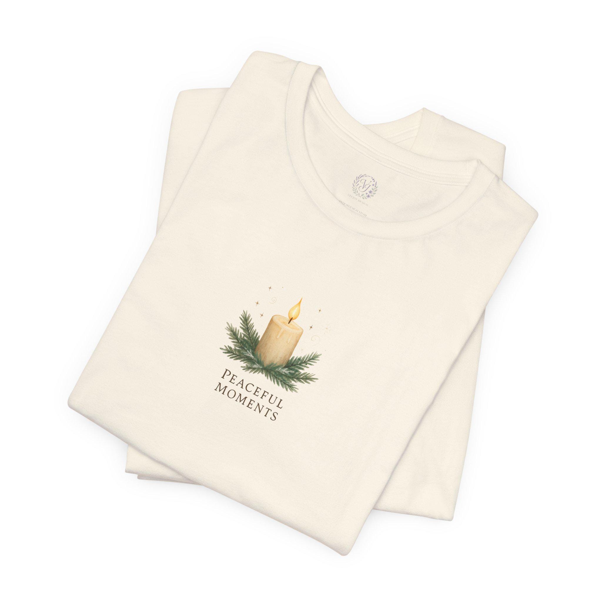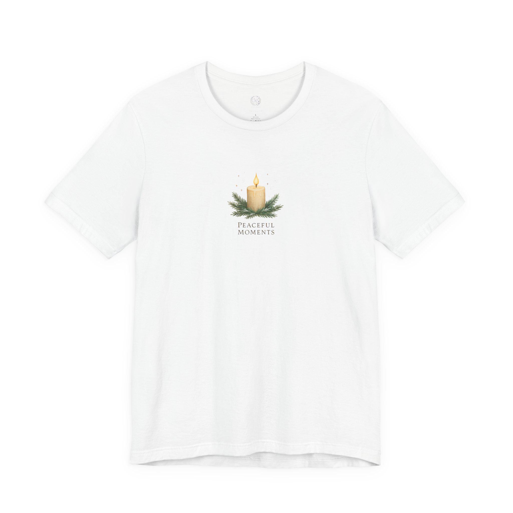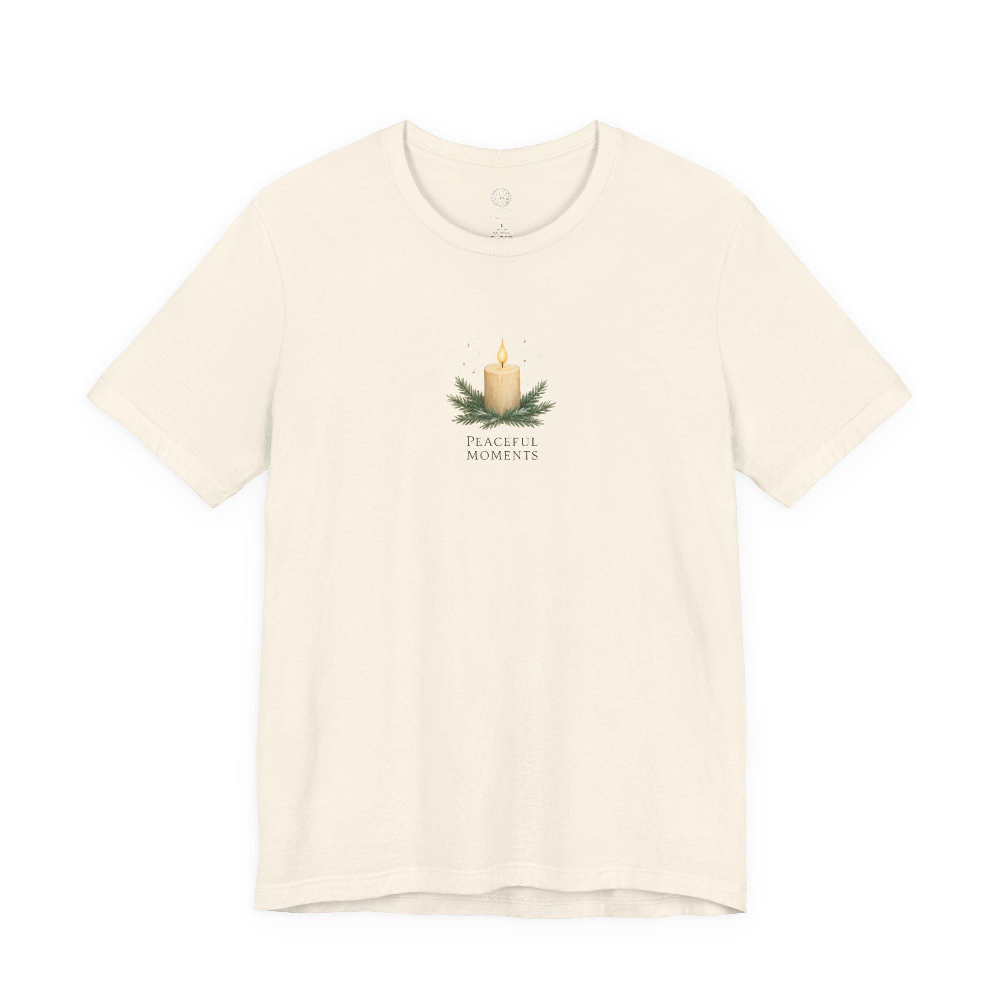 A soft, breathable tee that channels quiet, reflective moments. The lightweight Airlume combed cotton feels gentle against skin while the ribbed crew neck and shoulder tape keep the silhouette neat after repeated wear. A hand-painted candle and evergreen sprig sit at the center, accompanied by the understated words “Peaceful Moments.” It reads like a quiet pause — a shirt for slow mornings, candlelit evenings, and small rituals that slow time. Wear it layered under a cardigan for mellow afternoons, or alone when you want a simple reminder to breathe and be present.