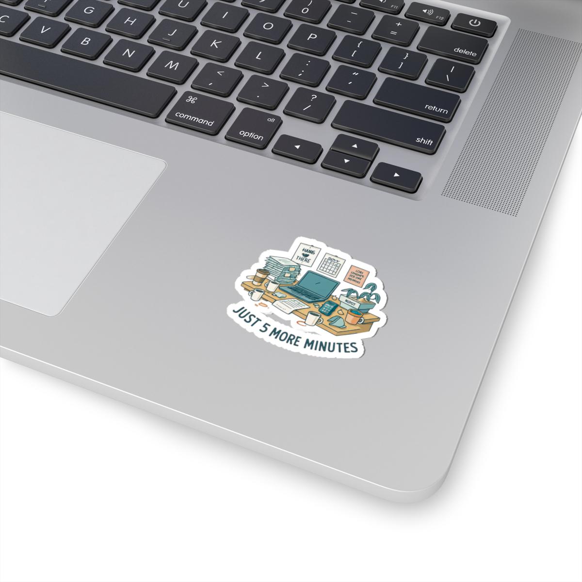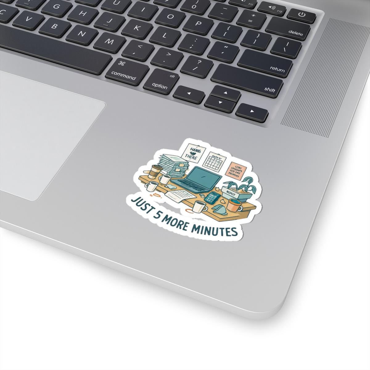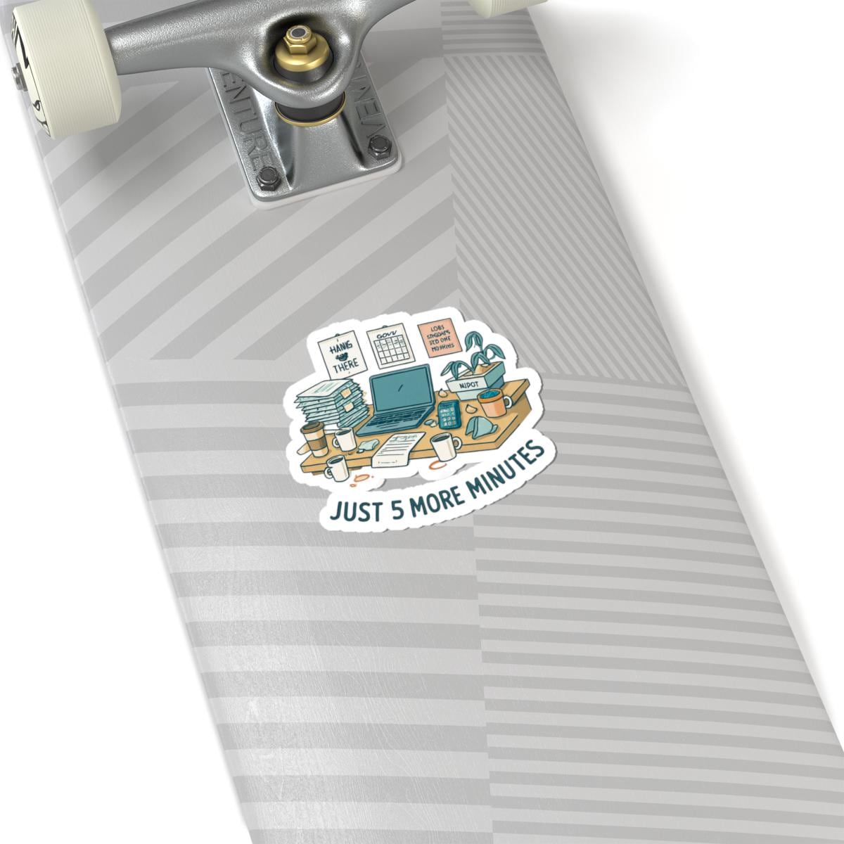 A cozy, tongue-in-cheek sticker that captures the chaotic calm of a busy desk: stacks of papers, a laptop mid-task, overflowing coffee cups, and little motivational notes — all beneath the wry line “Just 5 More Minutes.” The glossy kiss-cut vinyl brings out soft greens, warm neutrals, and pastel accents for a cheerful yet lived-in look. Stick it to a laptop, journal, planner, or water-resistant surface to add personality to your everyday gear and remind you (with a smile) that productivity doesn’t always look tidy.