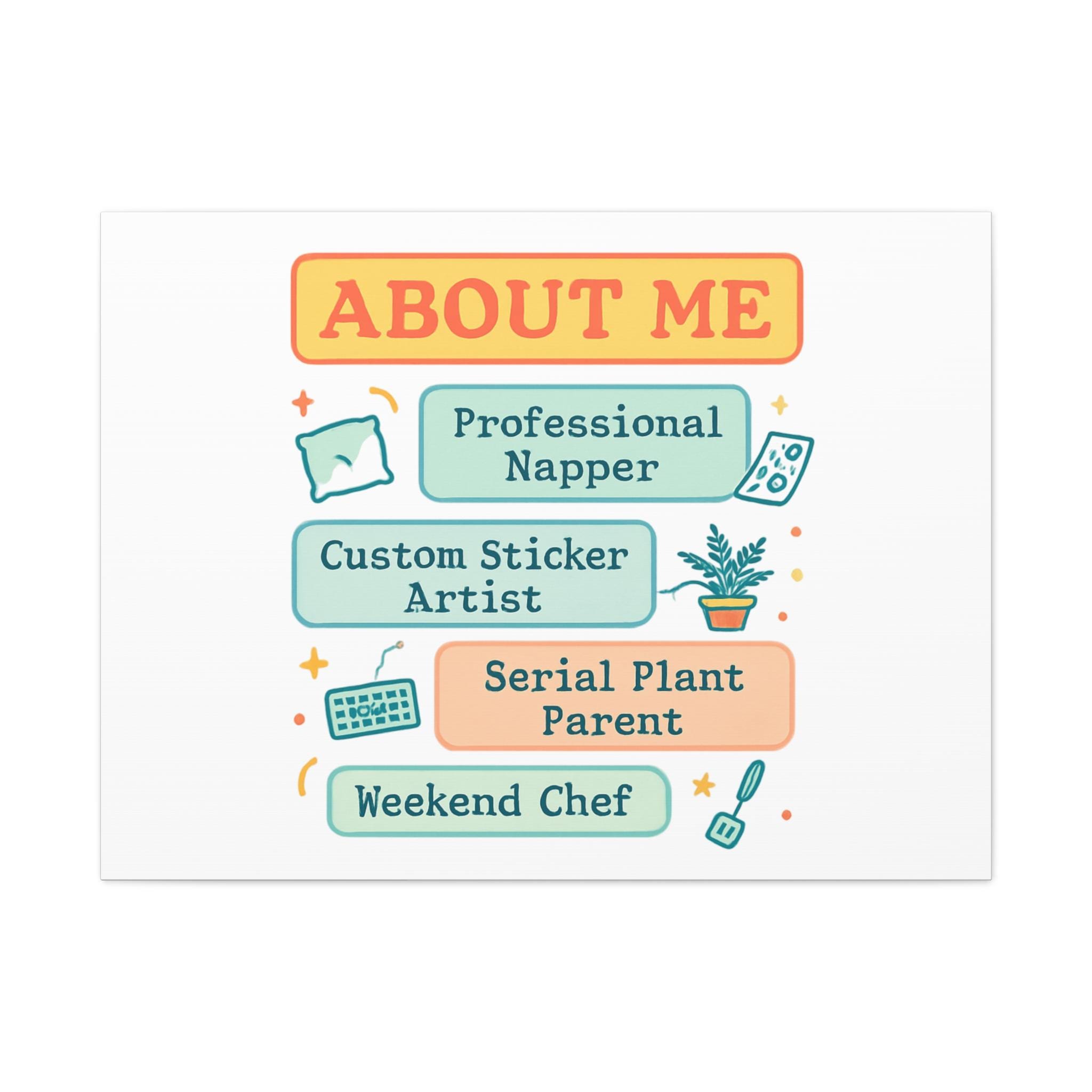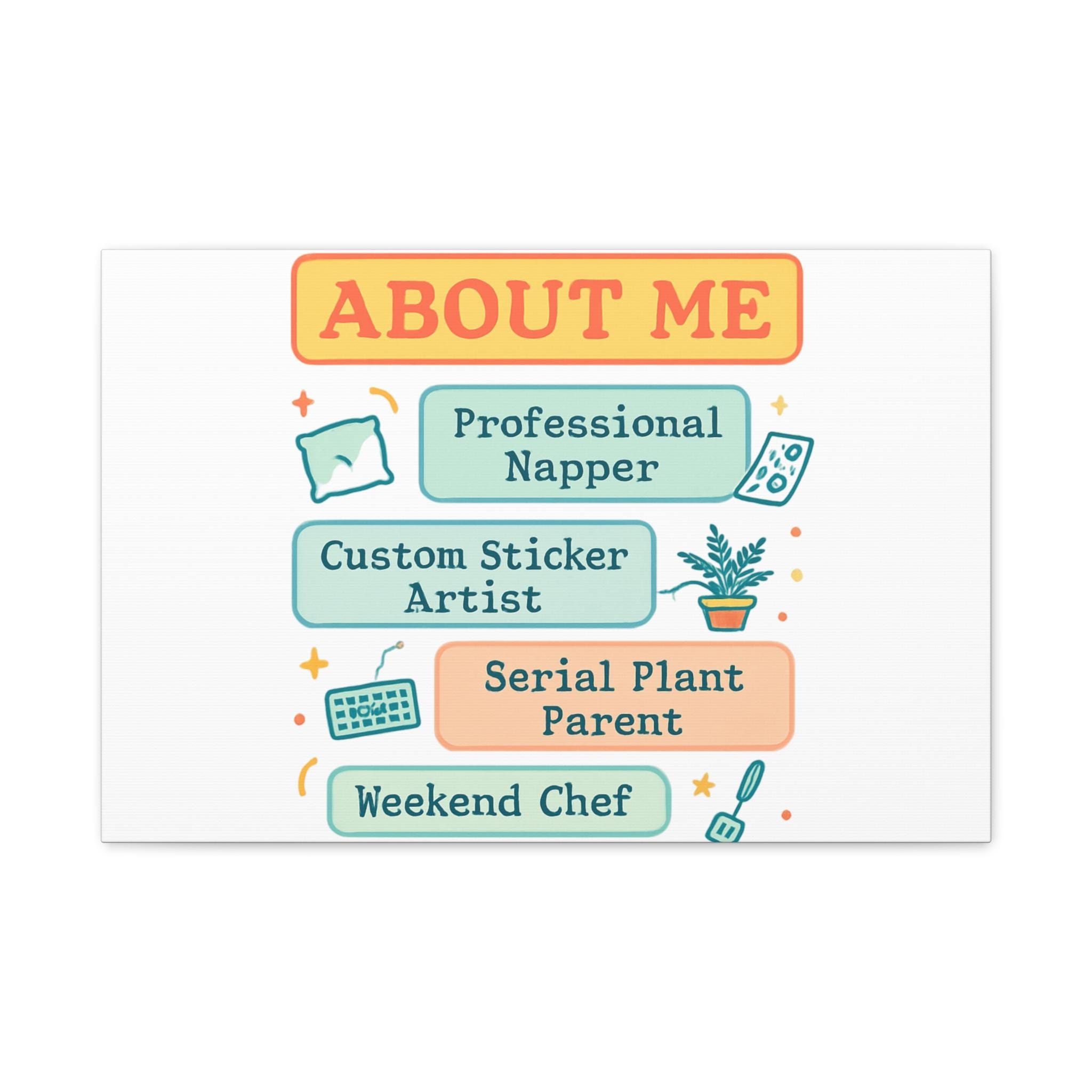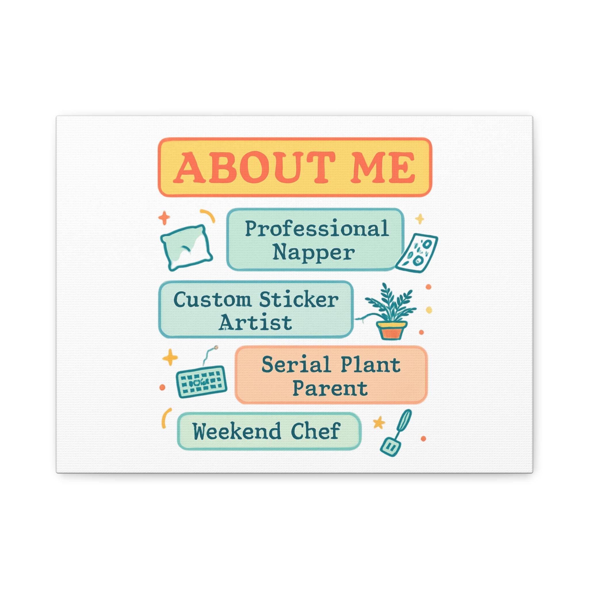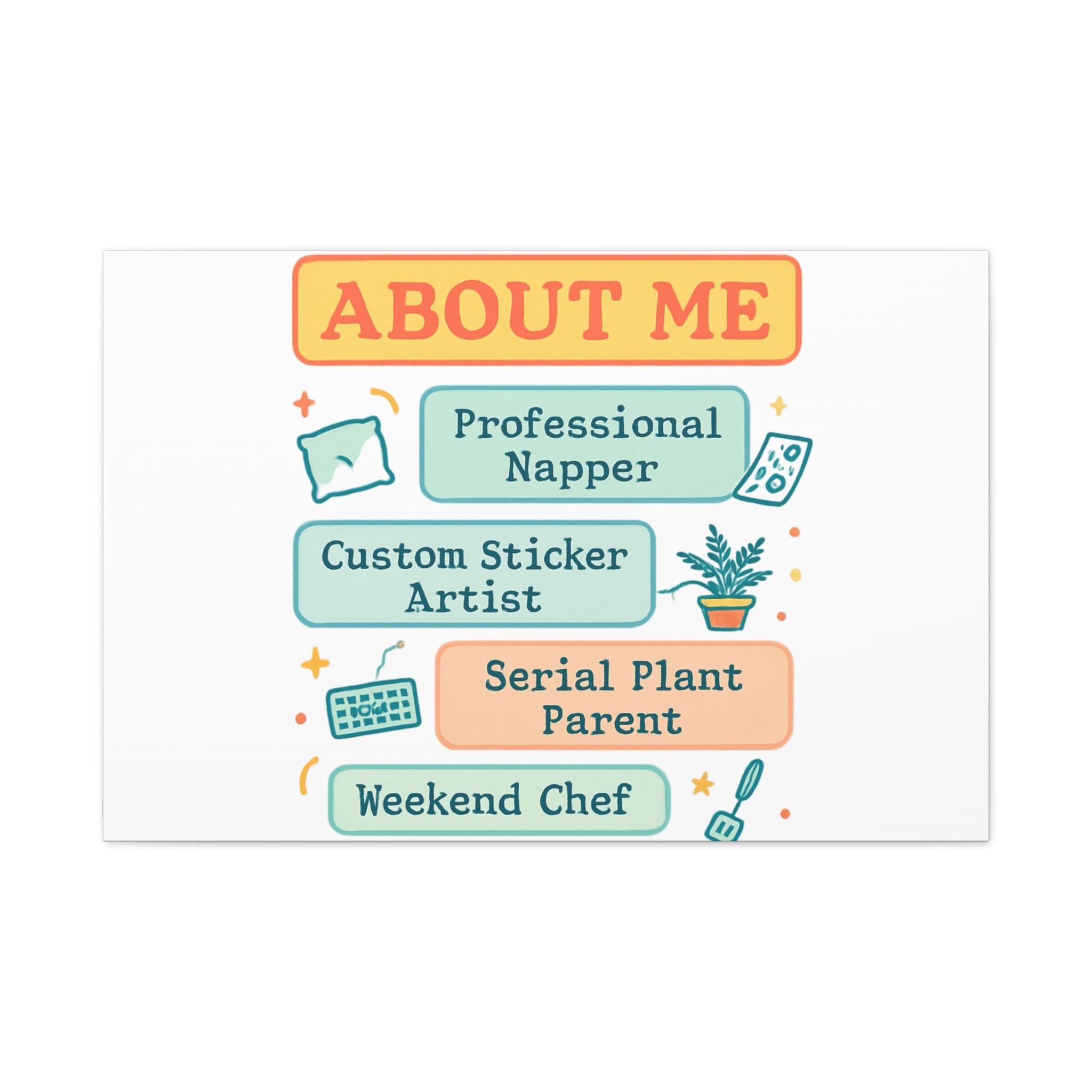Bright, playful wall art that speaks with personality. This matte stretched canvas features a cheerful “About Me” layout in warm pastels—bubbly headers, tiny icons (pillow, keyboard, plant, spatula) and stacked labels like “Professional Napper,” “Serial Plant Parent,” and “Weekend Chef.” The soft matte finish mutes glare and emphasizes the hand-drawn, sticker-like feel. Hung in a studio, bedroom, or kitchen, it adds a lighthearted, personal touch that invites a smile and sparks conversation.