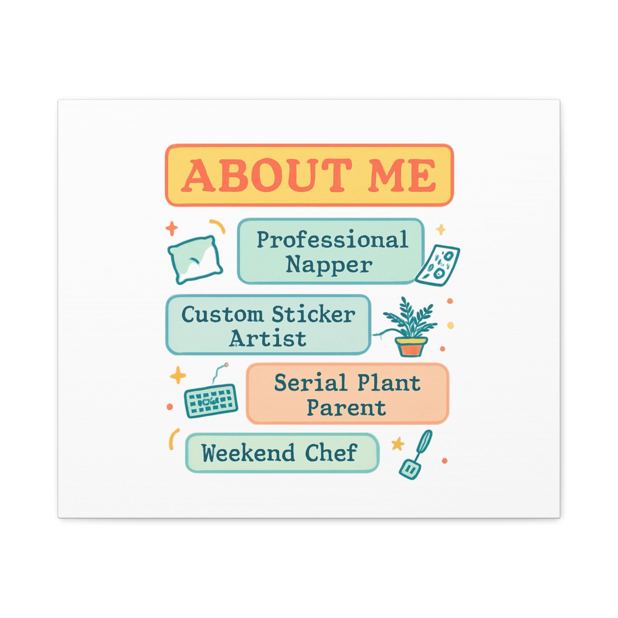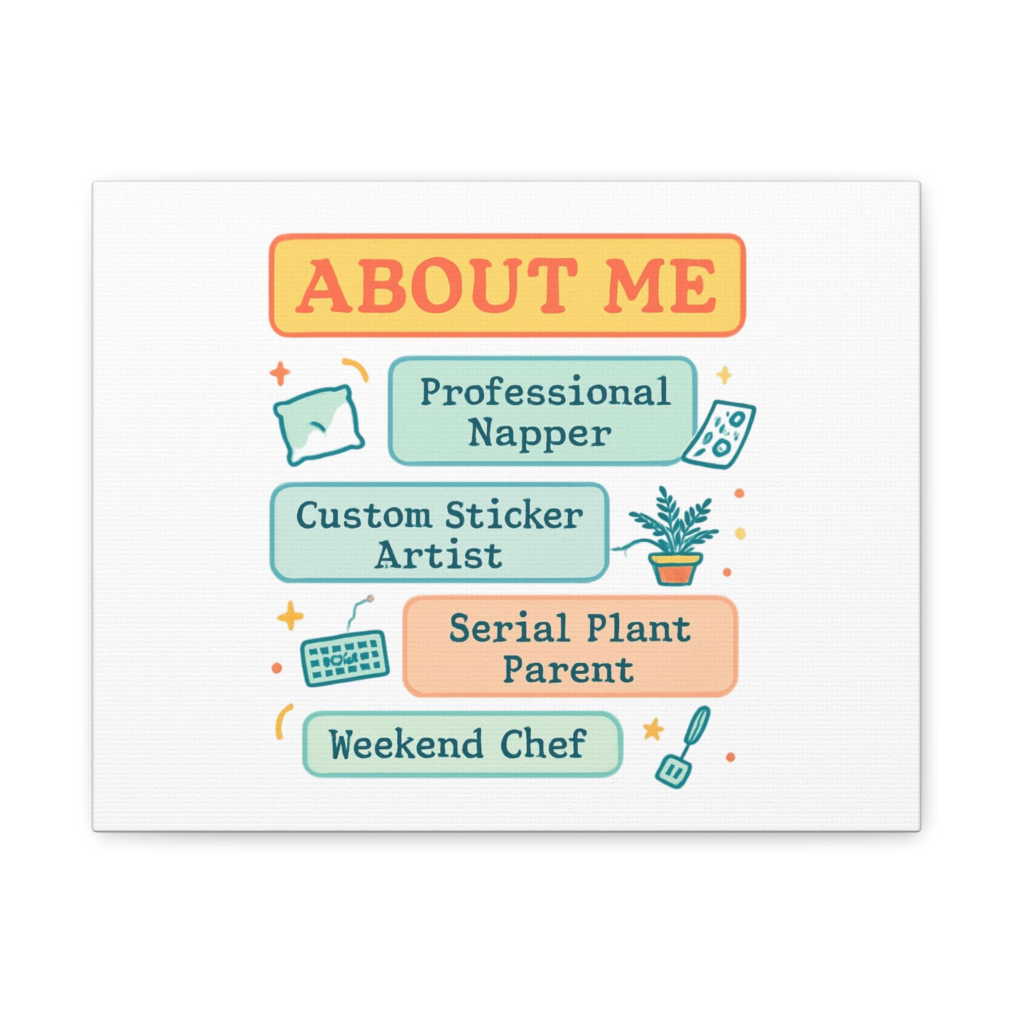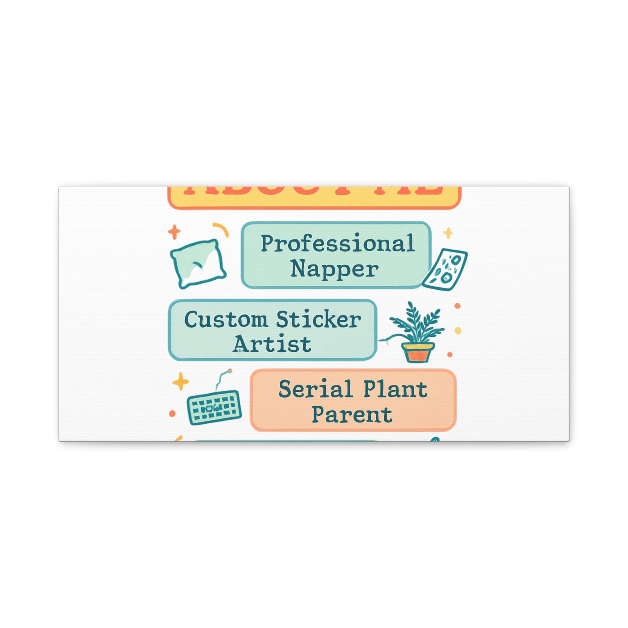 Bright, playful wall art that speaks with personality. This matte stretched canvas features a cheerful “About Me” layout in warm pastels—bubbly headers, tiny icons (pillow, keyboard, plant, spatula) and stacked labels like “Professional Napper,” “Serial Plant Parent,” and “Weekend Chef.” The soft matte finish mutes glare and emphasizes the hand-drawn, sticker-like feel. Hung in a studio, bedroom, or kitchen, it adds a lighthearted, personal touch that invites a smile and sparks conversation.