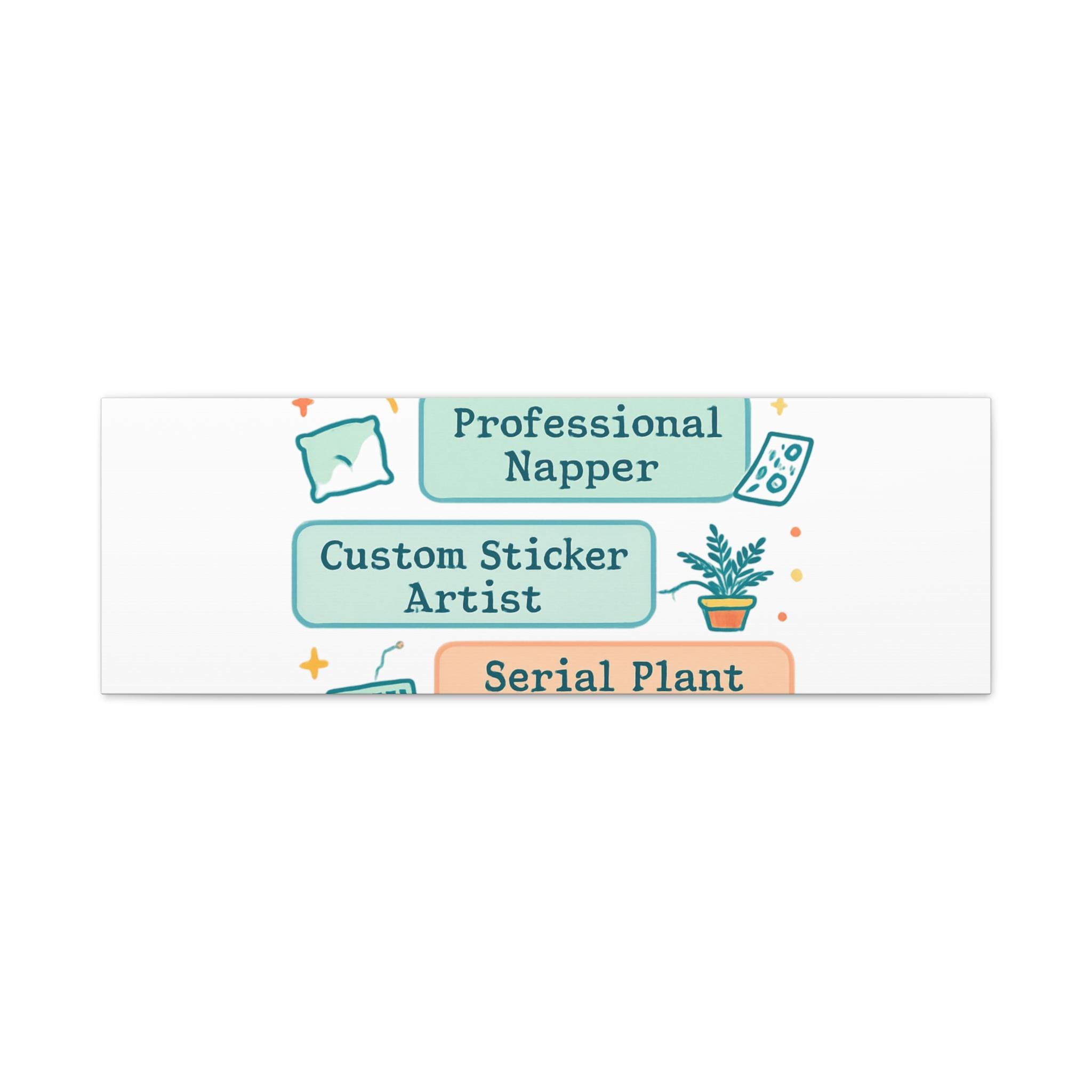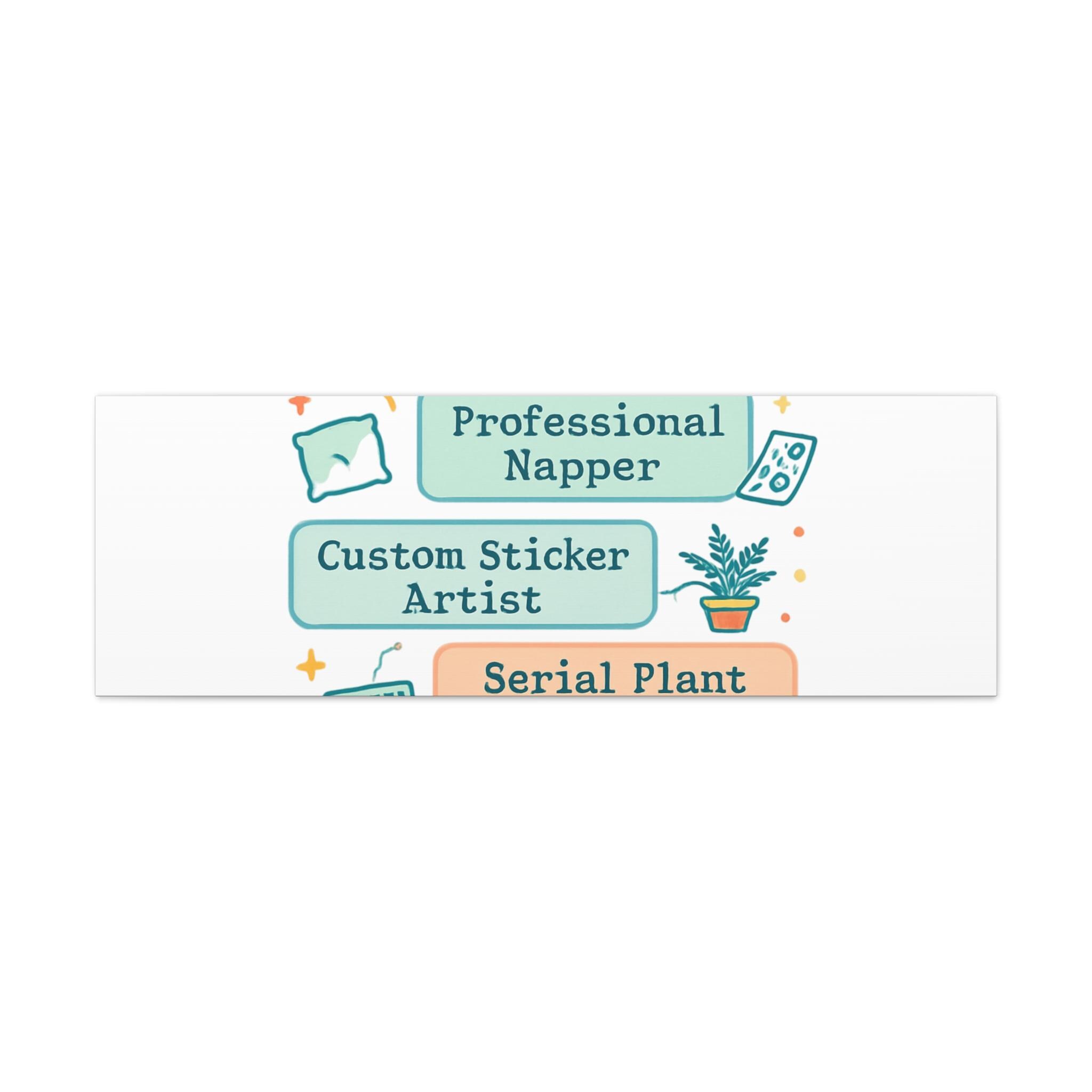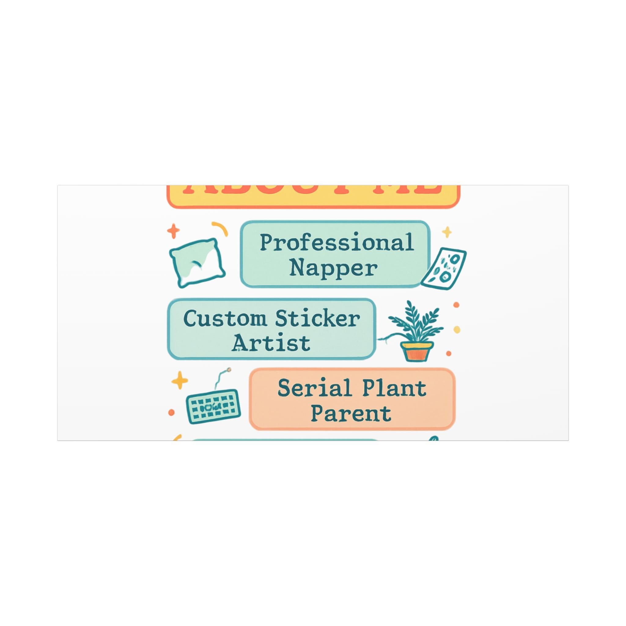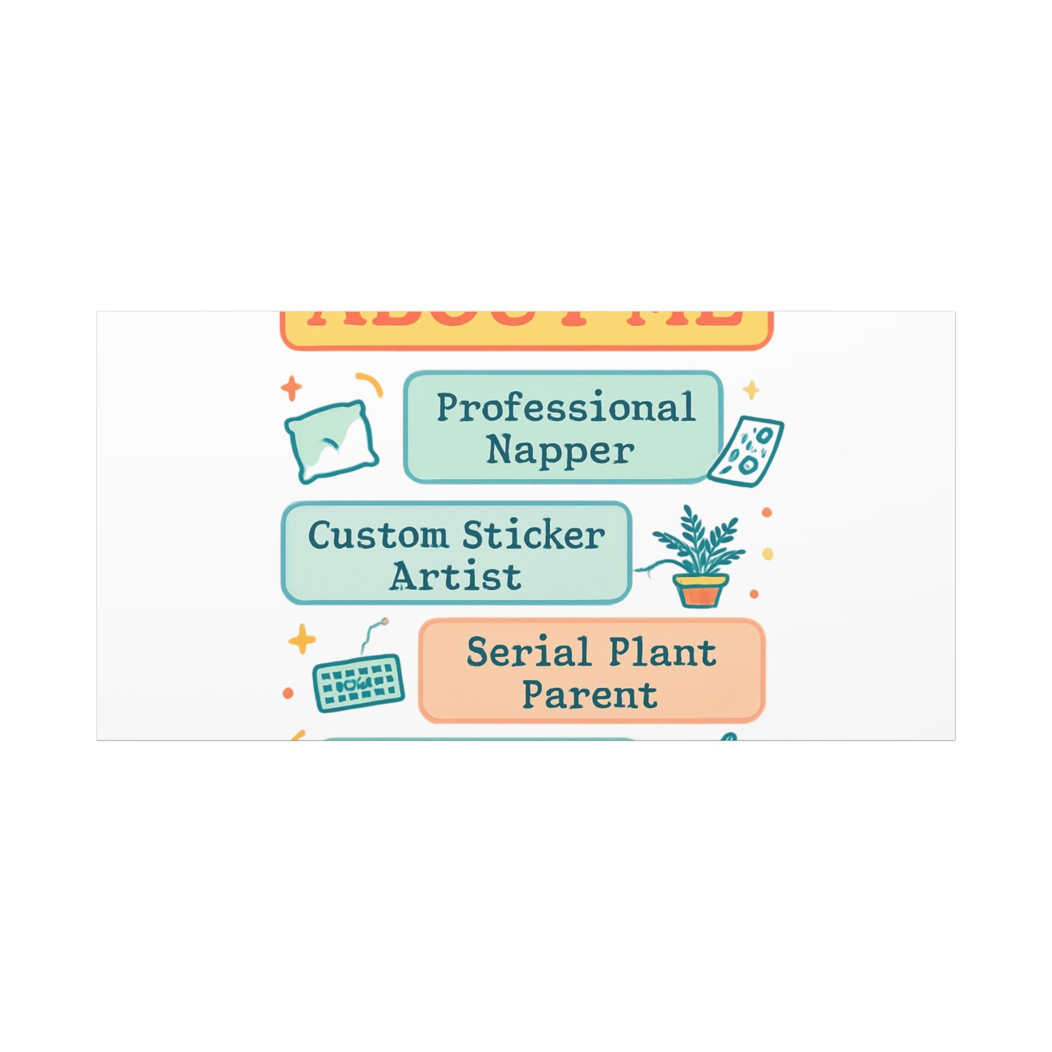 Bright, playful wall art that speaks with personality. This matte stretched canvas features a cheerful “About Me” layout in warm pastels—bubbly headers, tiny icons (pillow, keyboard, plant, spatula) and stacked labels like “Professional Napper,” “Serial Plant Parent,” and “Weekend Chef.” The soft matte finish mutes glare and emphasizes the hand-drawn, sticker-like feel. Hung in a studio, bedroom, or kitchen, it adds a lighthearted, personal touch that invites a smile and sparks conversation.