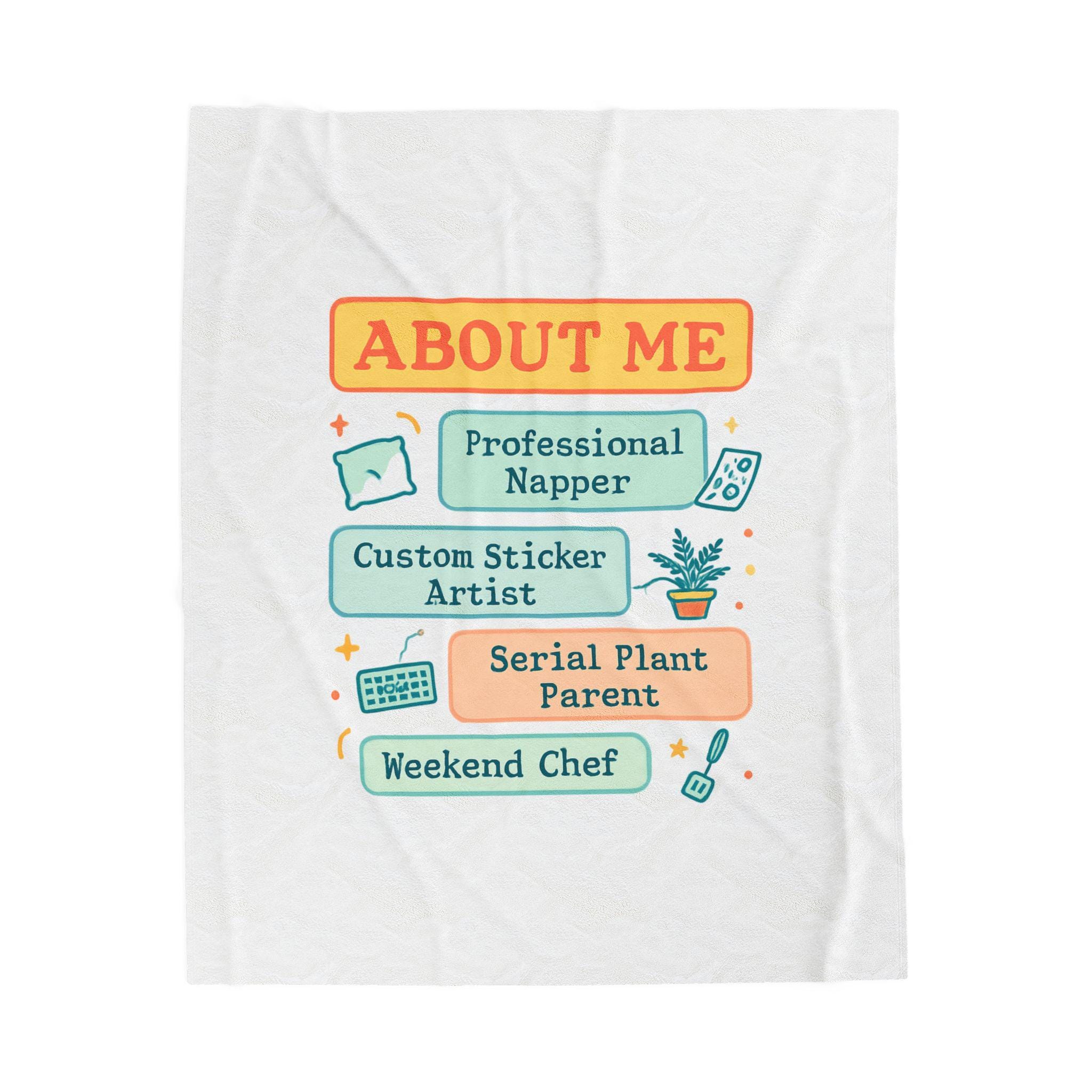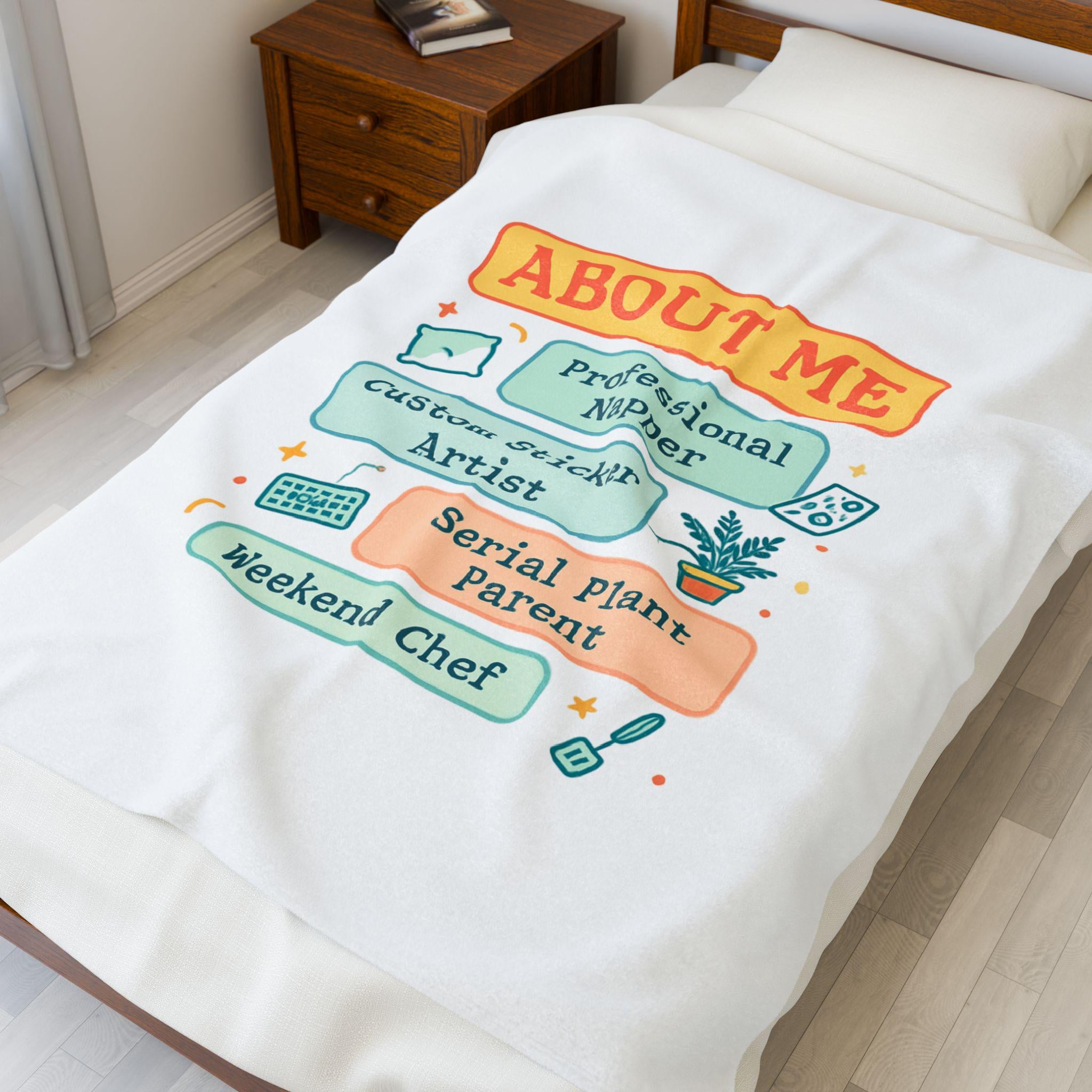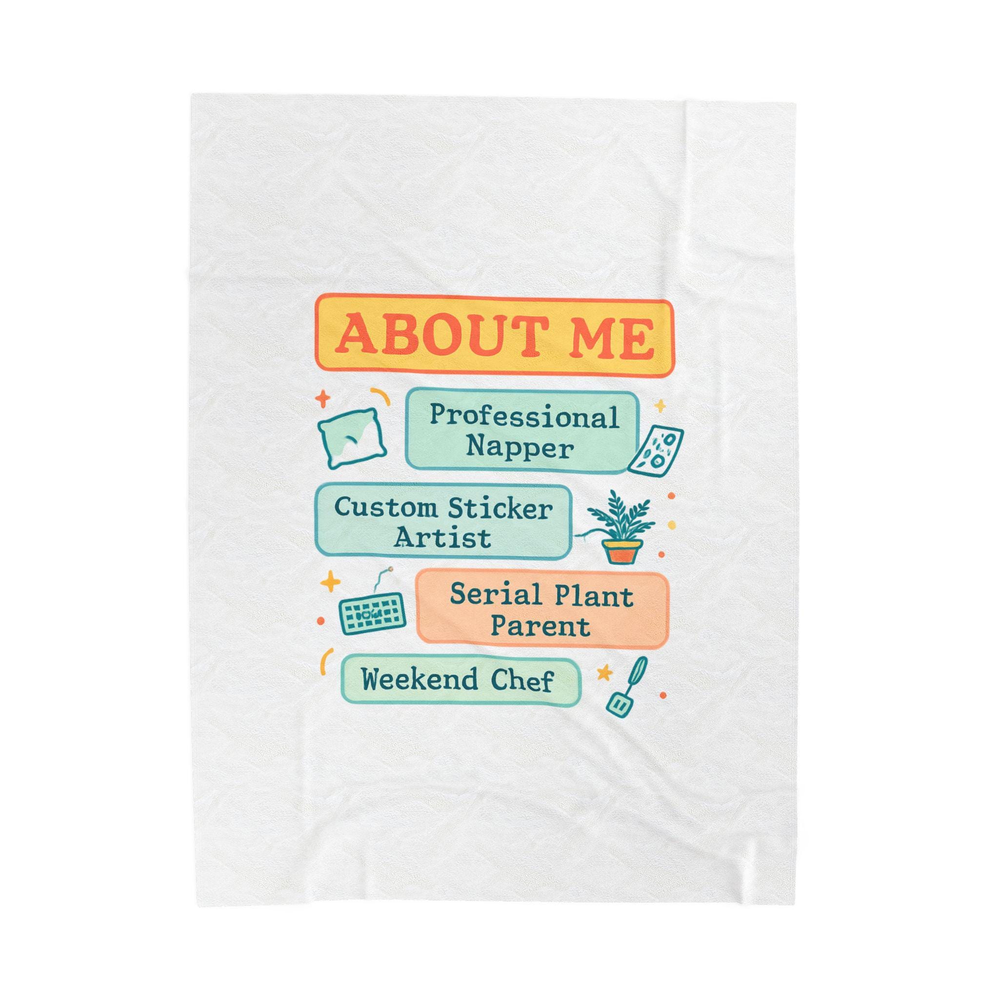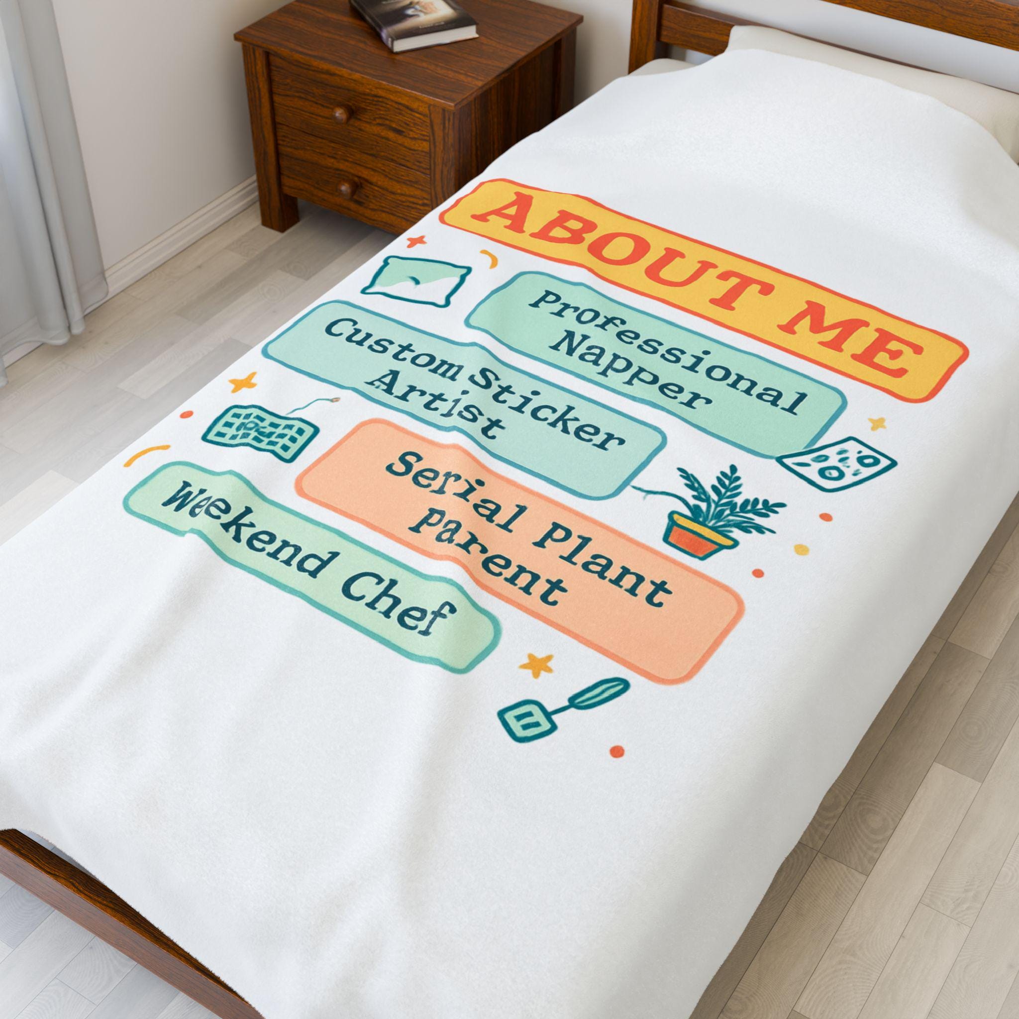 This velveteen plush blanket wraps everyday moments in soft, colorful comfort. Printed on one side with bright, playful lettering and tiny icons, the design reads like a cozy self-introduction—“About Me” followed by fun roles: Professional Napper, Custom Sticker Artist, Serial Plant Parent, Weekend Chef. The medium-heavy polyester has a velvety hand that stays lightweight enough for couch naps or late-night sketching sessions. Machine-finished double-needle stitching keeps the edges neat through repeated washes. It’s made for adults who love small joys, plant care rituals, late-afternoon naps, and making art from home—this blanket feels like a warm, personal accent that sparks smiles and invites relaxation.