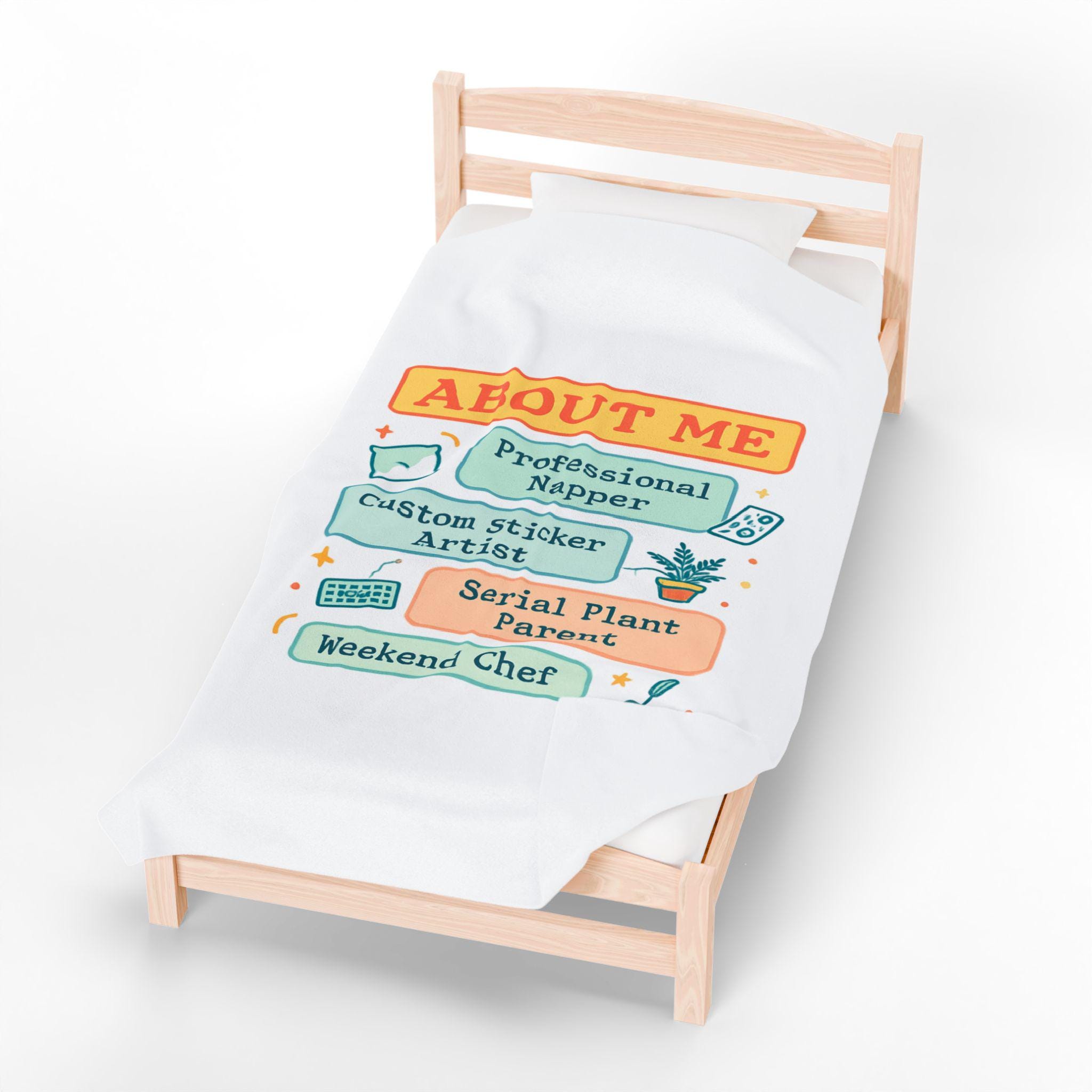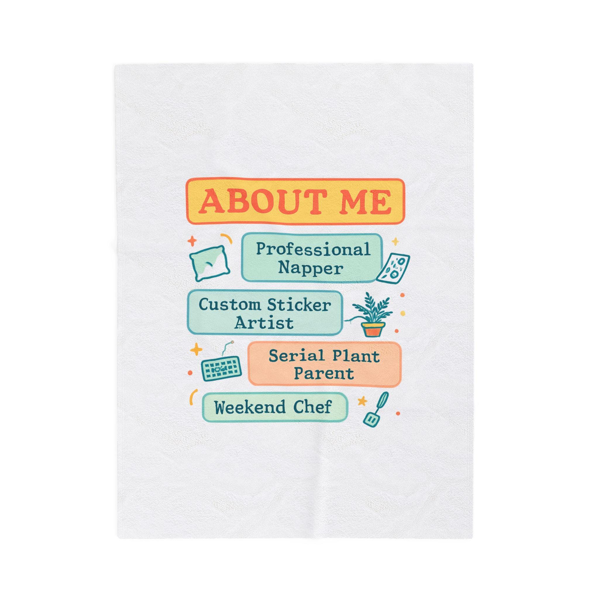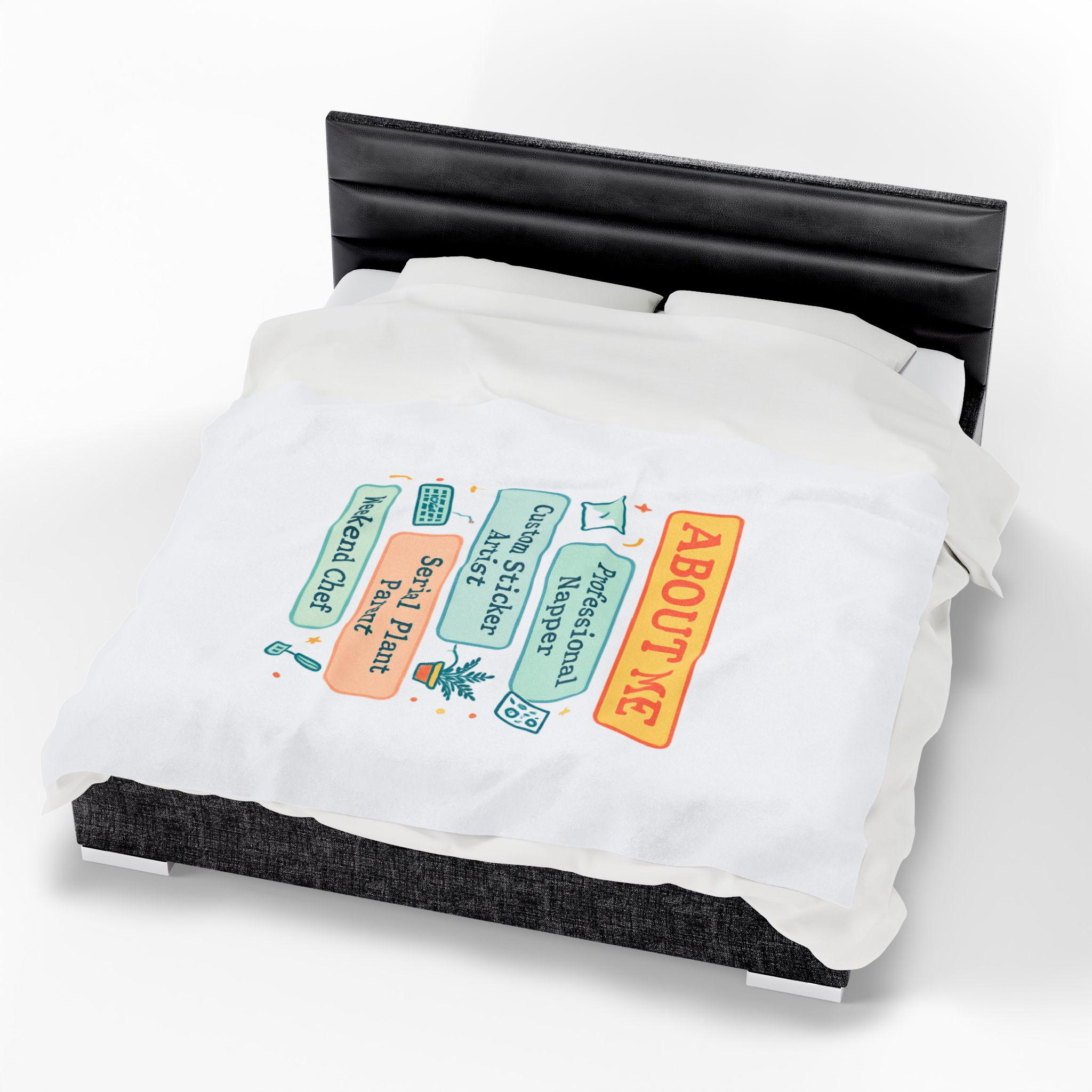 This velveteen plush blanket wraps everyday moments in soft, colorful comfort. Printed on one side with bright, playful lettering and tiny icons, the design reads like a cozy self-introduction—“About Me” followed by fun roles: Professional Napper, Custom Sticker Artist, Serial Plant Parent, Weekend Chef. The medium-heavy polyester has a velvety hand that stays lightweight enough for couch naps or late-night sketching sessions. Machine-finished double-needle stitching keeps the edges neat through repeated washes. It’s made for adults who love small joys, plant care rituals, late-afternoon naps, and making art from home—this blanket feels like a warm, personal accent that sparks smiles and invites relaxation.