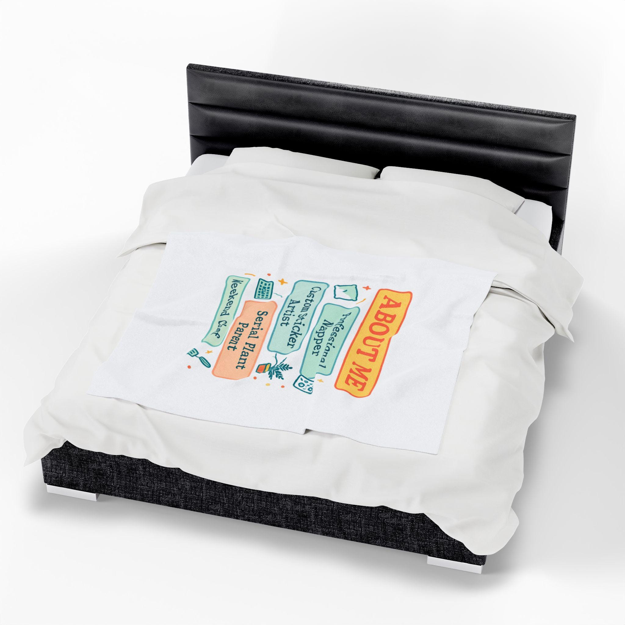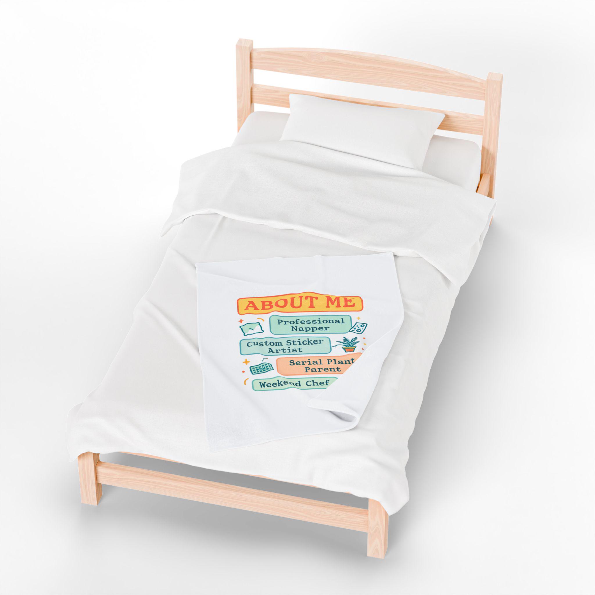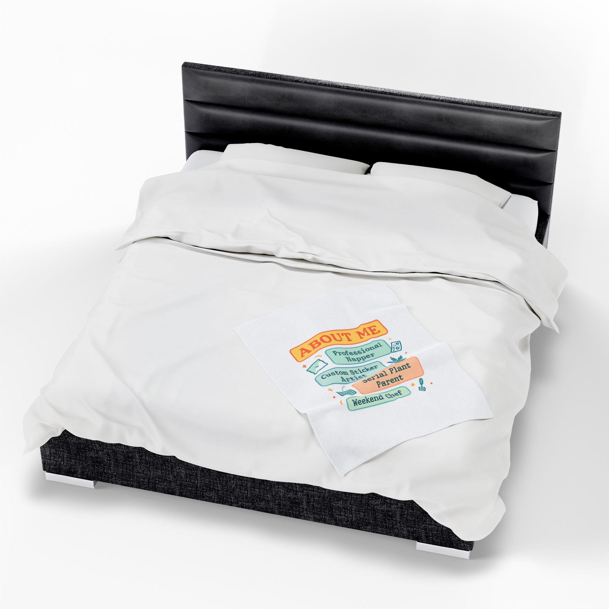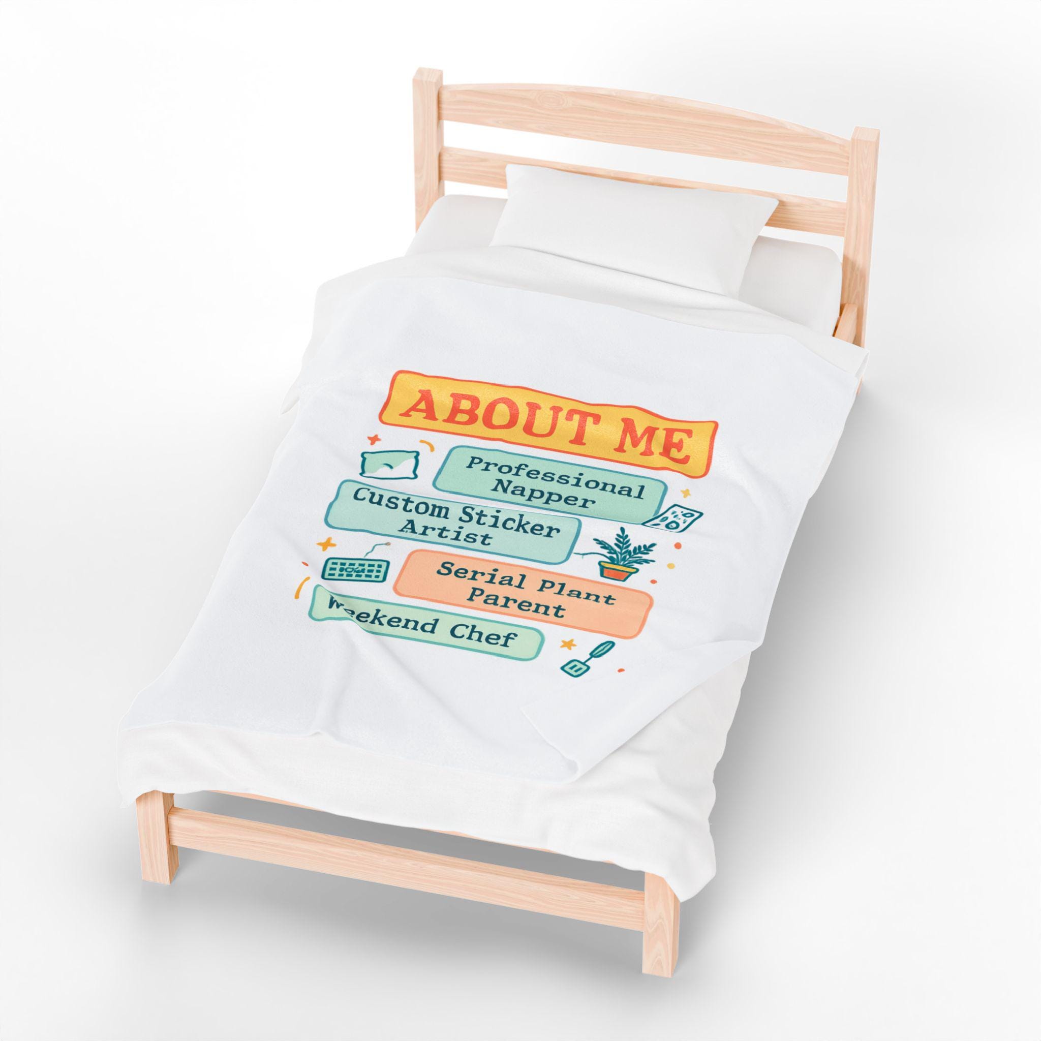 This velveteen plush blanket wraps everyday moments in soft, colorful comfort. Printed on one side with bright, playful lettering and tiny icons, the design reads like a cozy self-introduction—“About Me” followed by fun roles: Professional Napper, Custom Sticker Artist, Serial Plant Parent, Weekend Chef. The medium-heavy polyester has a velvety hand that stays lightweight enough for couch naps or late-night sketching sessions. Machine-finished double-needle stitching keeps the edges neat through repeated washes. It’s made for adults who love small joys, plant care rituals, late-afternoon naps, and making art from home—this blanket feels like a warm, personal accent that sparks smiles and invites relaxation.