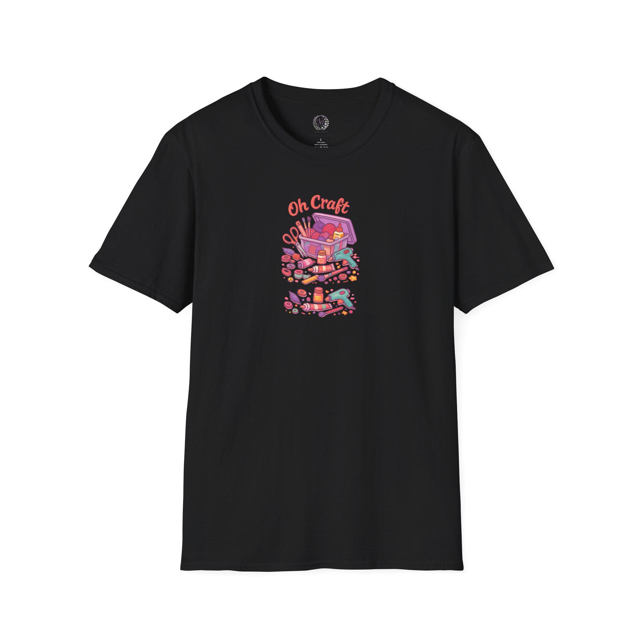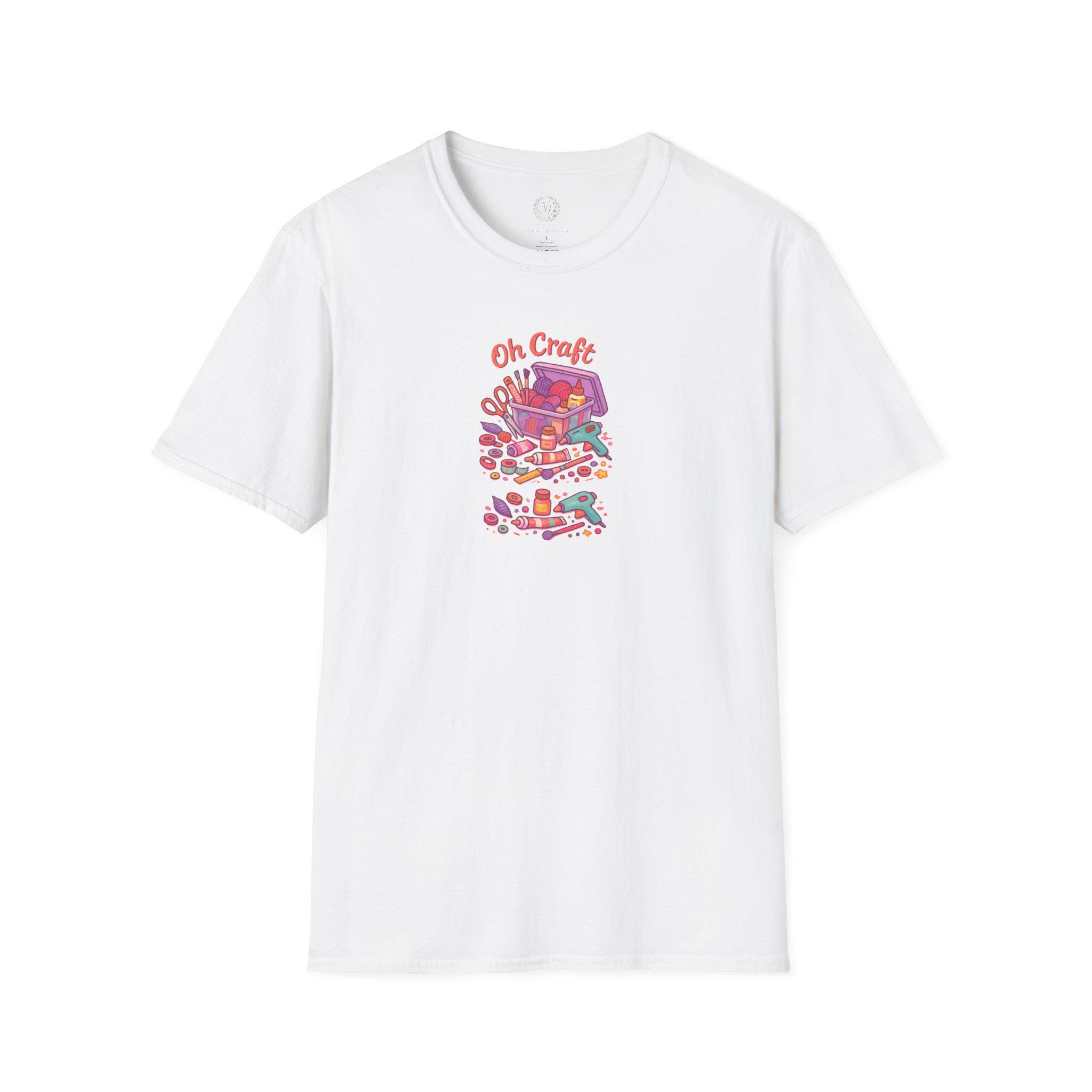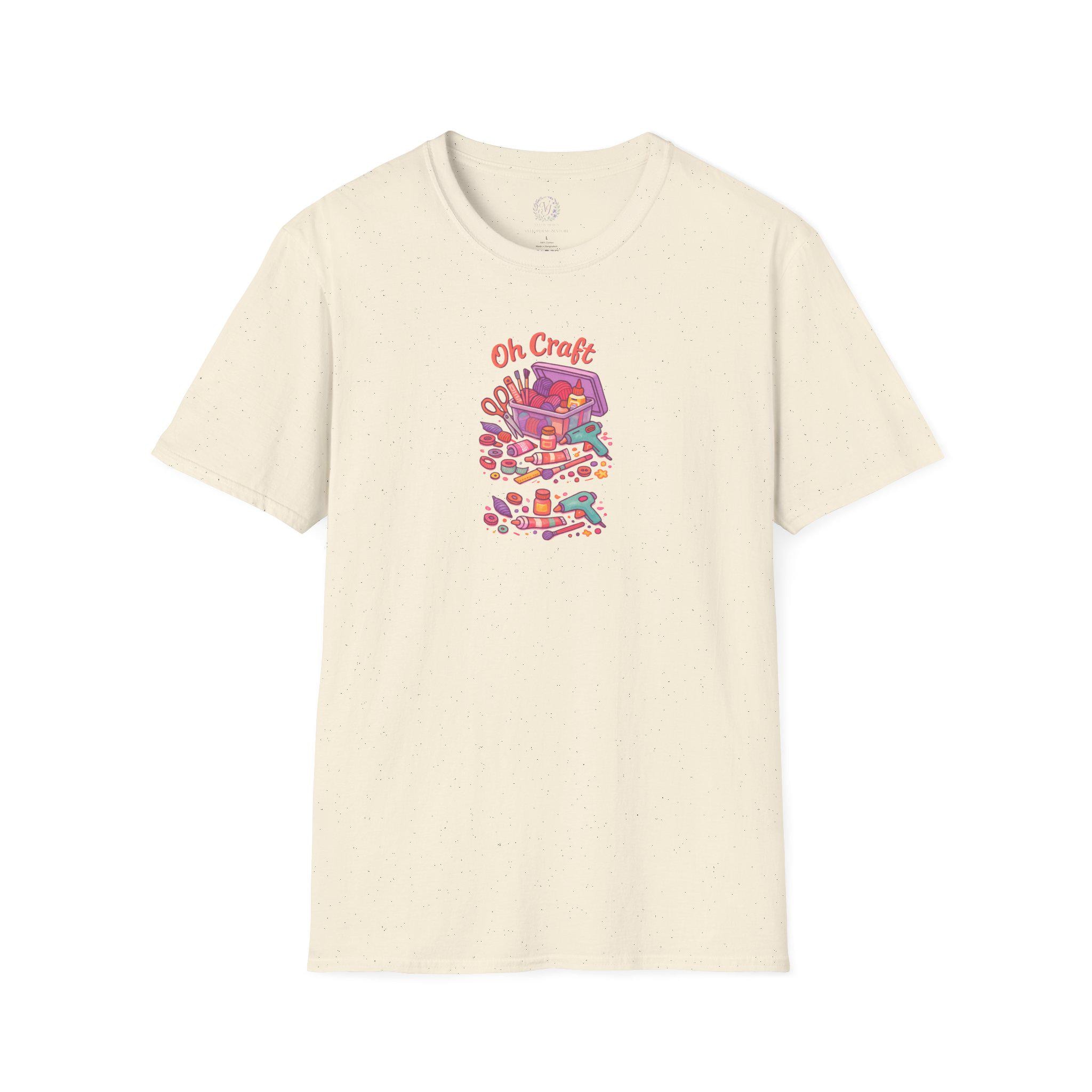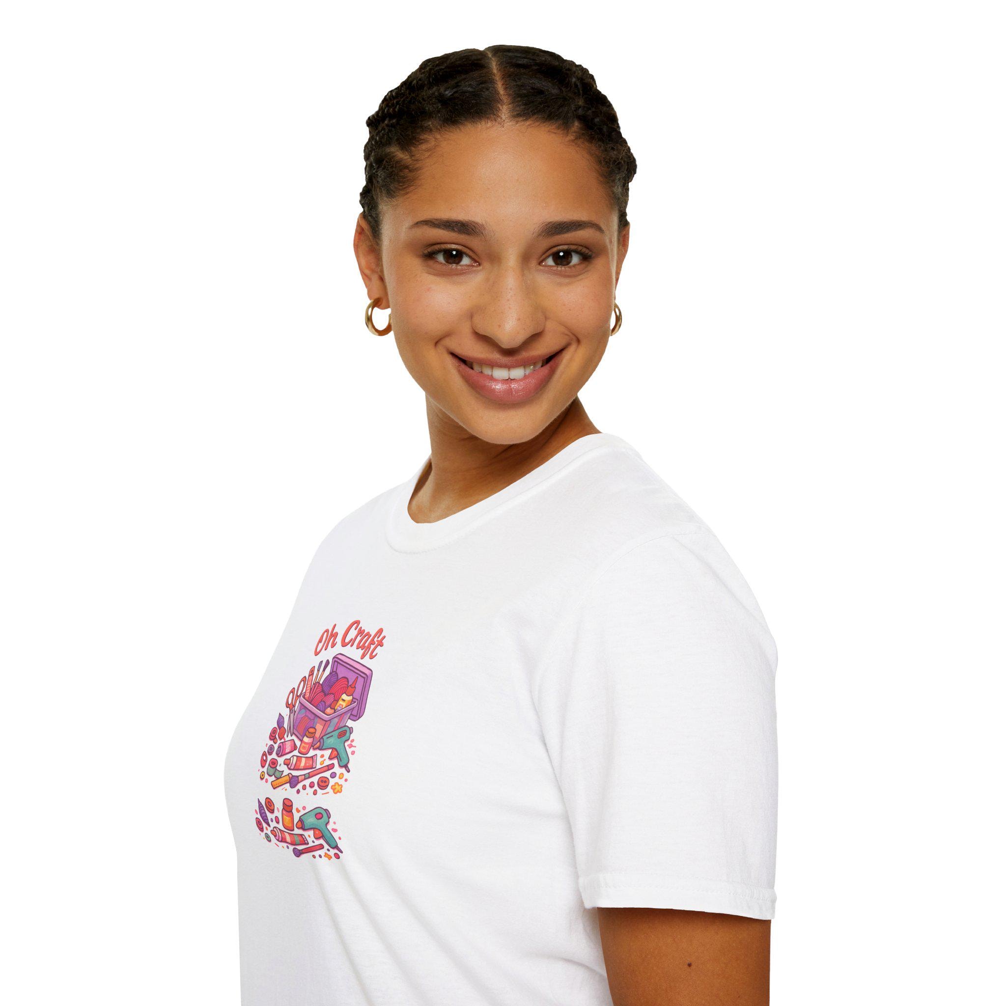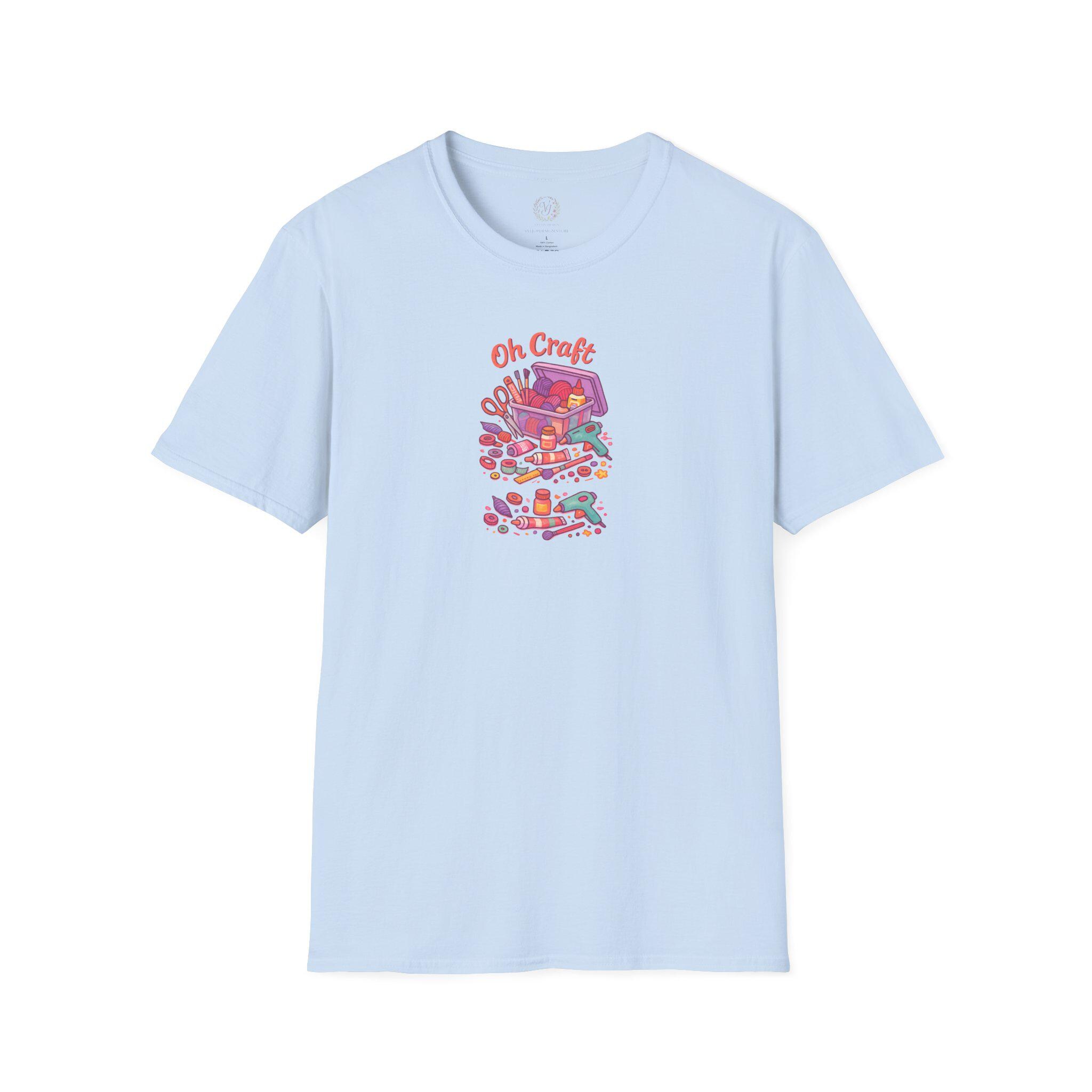 Lightweight, soft, and quietly cheerful — this crew-neck tee carries a small, colorful craft-themed illustration across the chest that feels like a wink to anyone who loves making things by hand. The design shows scattered supplies, a little toolkit and playful lettering that reads “Oh Craft,” so the shirt sits easily between everyday wear and a nod to studio life. It drapes cleanly thanks to a classic cut and tubular knit, so it layers well under a cardigan or stands alone for a casual workshop day. Wear it while sorting supplies, teaching a class, or meeting friends for a crafty meet-up — it’s comfortable enough to move in and subtle enough to start conversations about the things you love to make.