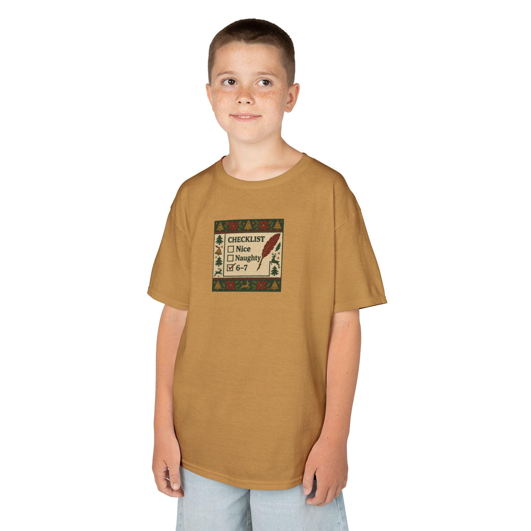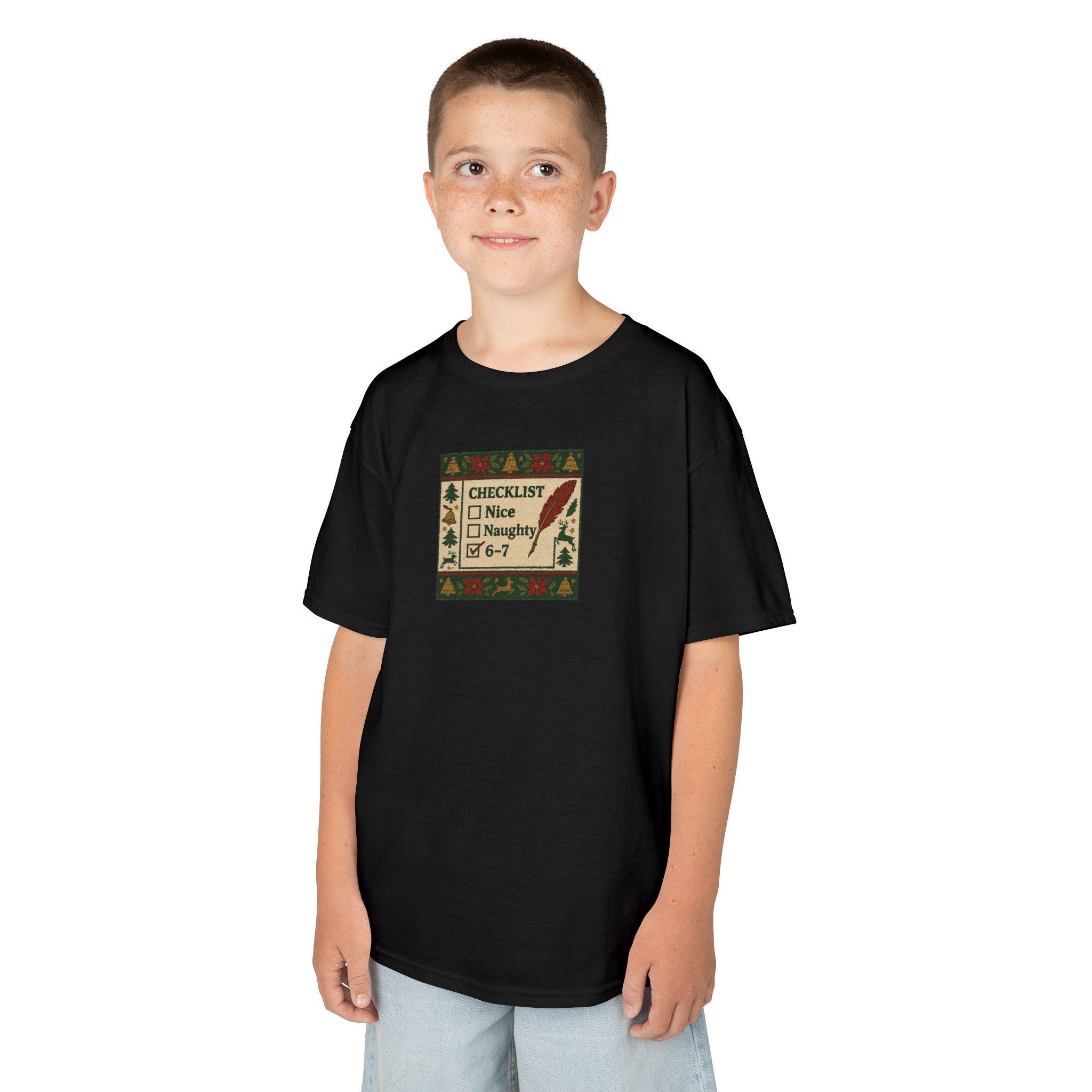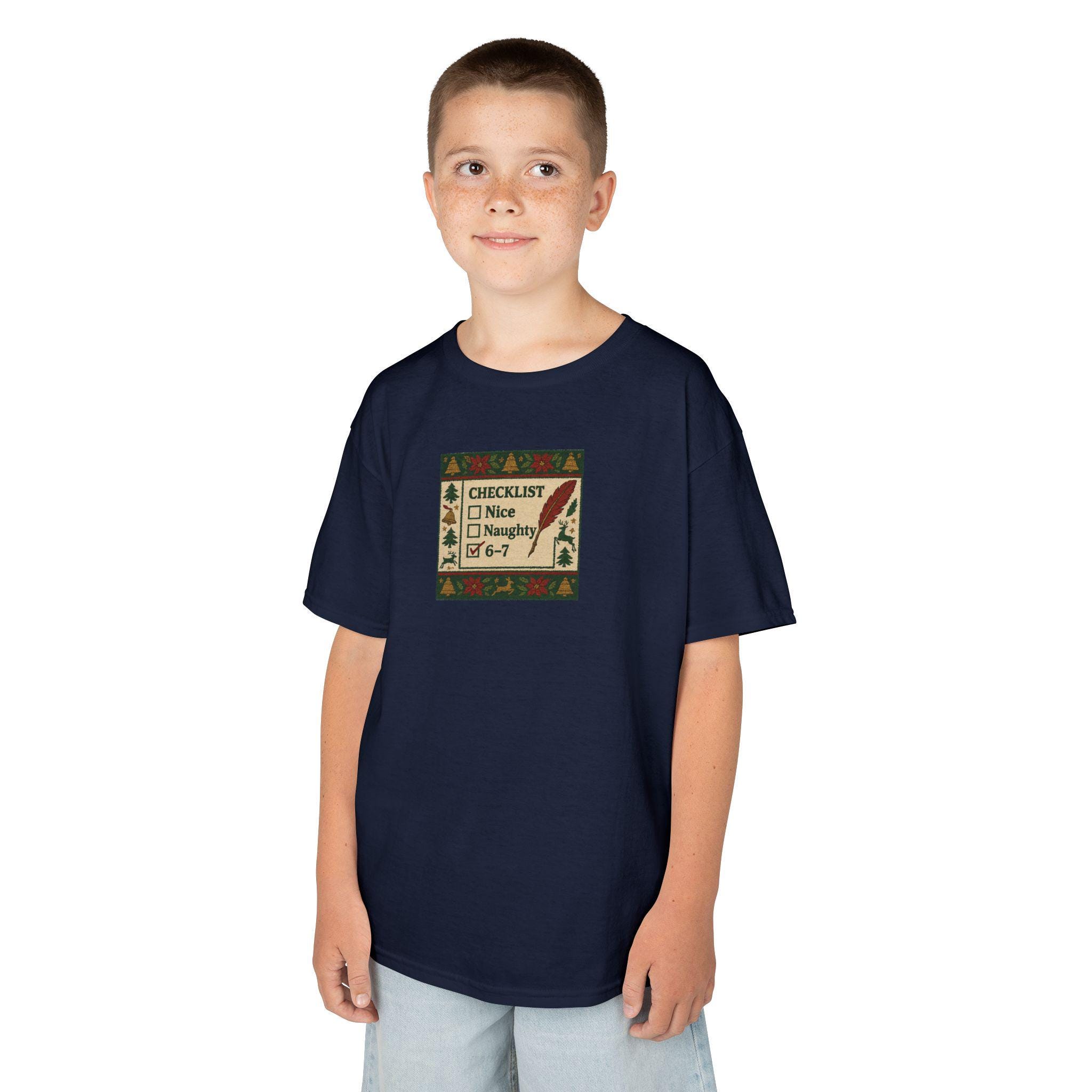 A cozy kids' tee that brings playful holiday mischief to everyday wear. The small, centered design looks like a vintage checklist with festive icons — trees, stockings and holly — and a cheeky checked box for “6-7” that hints at extra naughty fun. Lightweight midweight cotton keeps little ones comfortable through school days and family gatherings while the snug crew neckline and classic fit make it easy to layer under sweaters or wear alone. Soft to the touch and responsibly grown, this shirt wears well and washes clean without losing shape.
