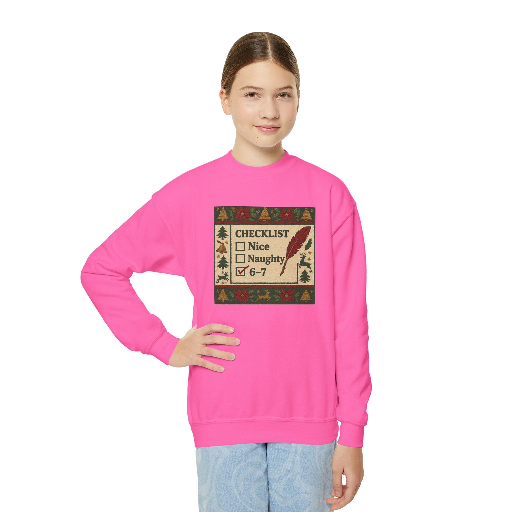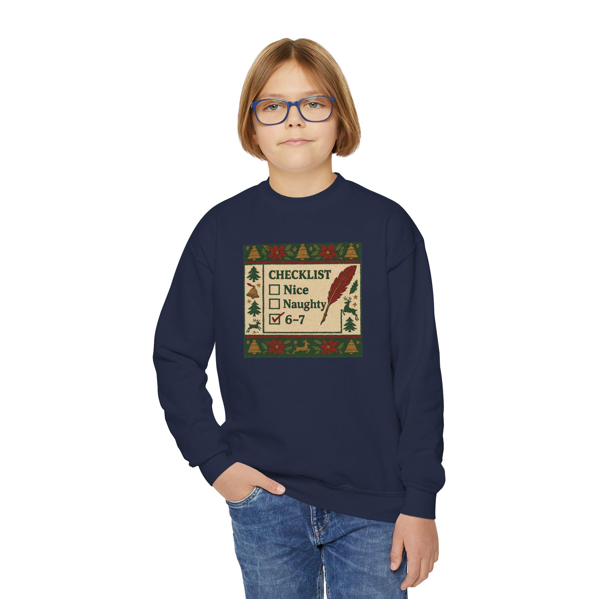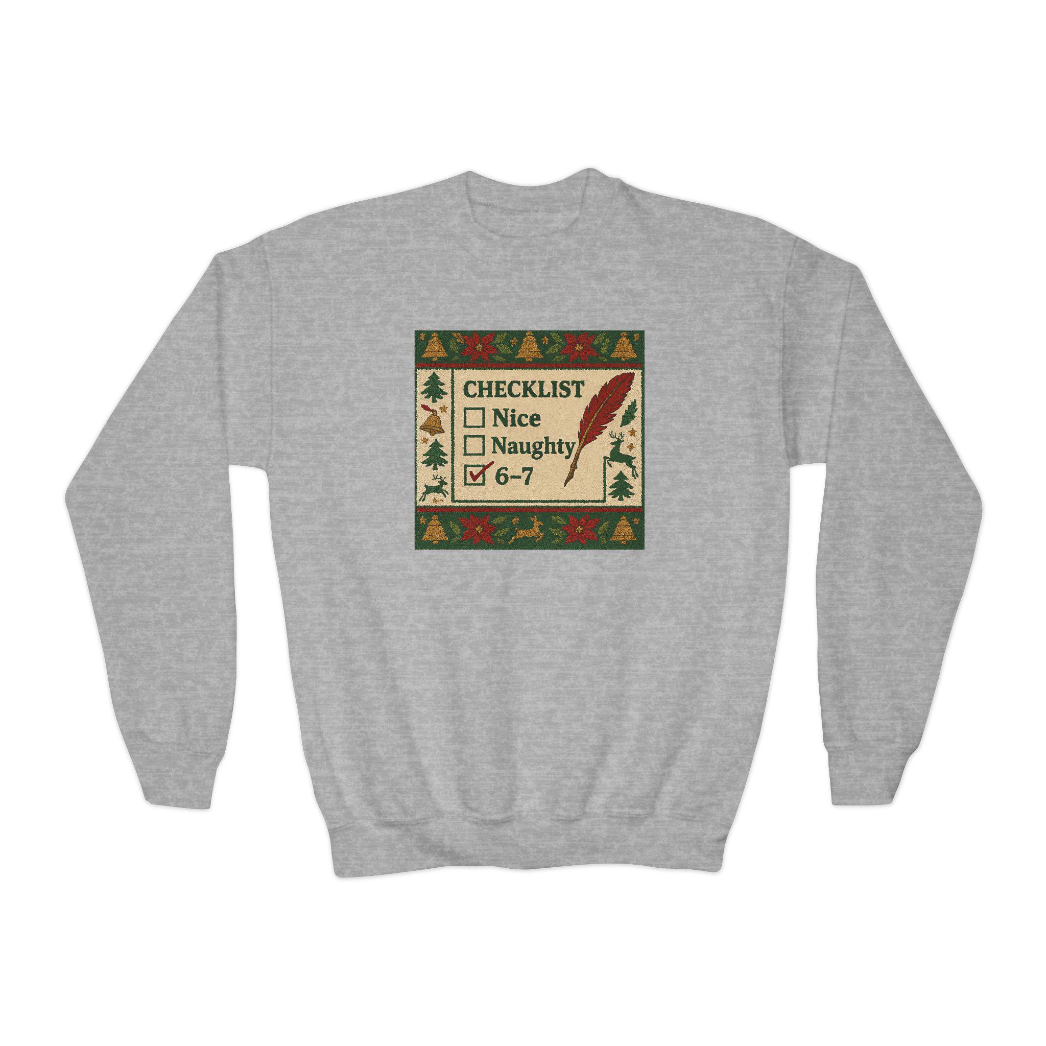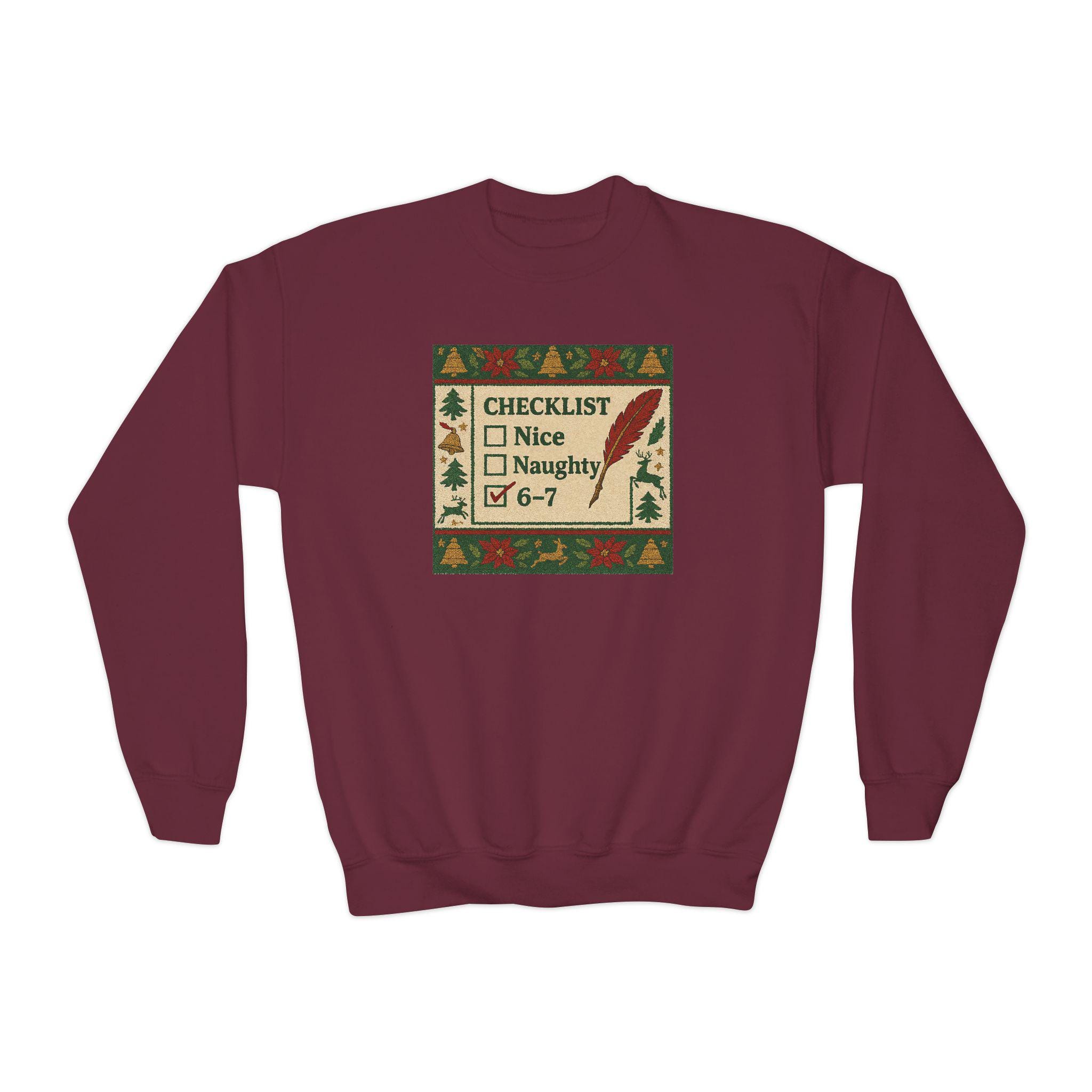 This cozy youth crewneck sweatshirt brings playful holiday spirit to chilly days. A stitched-style “Checklist” design sits at the chest, complete with checkboxes for Nice, Naughty, and a mischievous middle box marked “6-7” — finished with evergreen border motifs and a red feather quill that looks hand-signed. The medium-heavy knit feels substantial without being bulky, and the loose fit lets kids move freely during winter play or holiday gatherings. Durable cotton-poly blend holds color and print, while ribbed collar and cuffs keep shape through repeated wear. Embroidery placement options give a tactile, handcrafted look on the chest. Comfortable, compliant, and designed for everyday kid adventures around the holiday season.