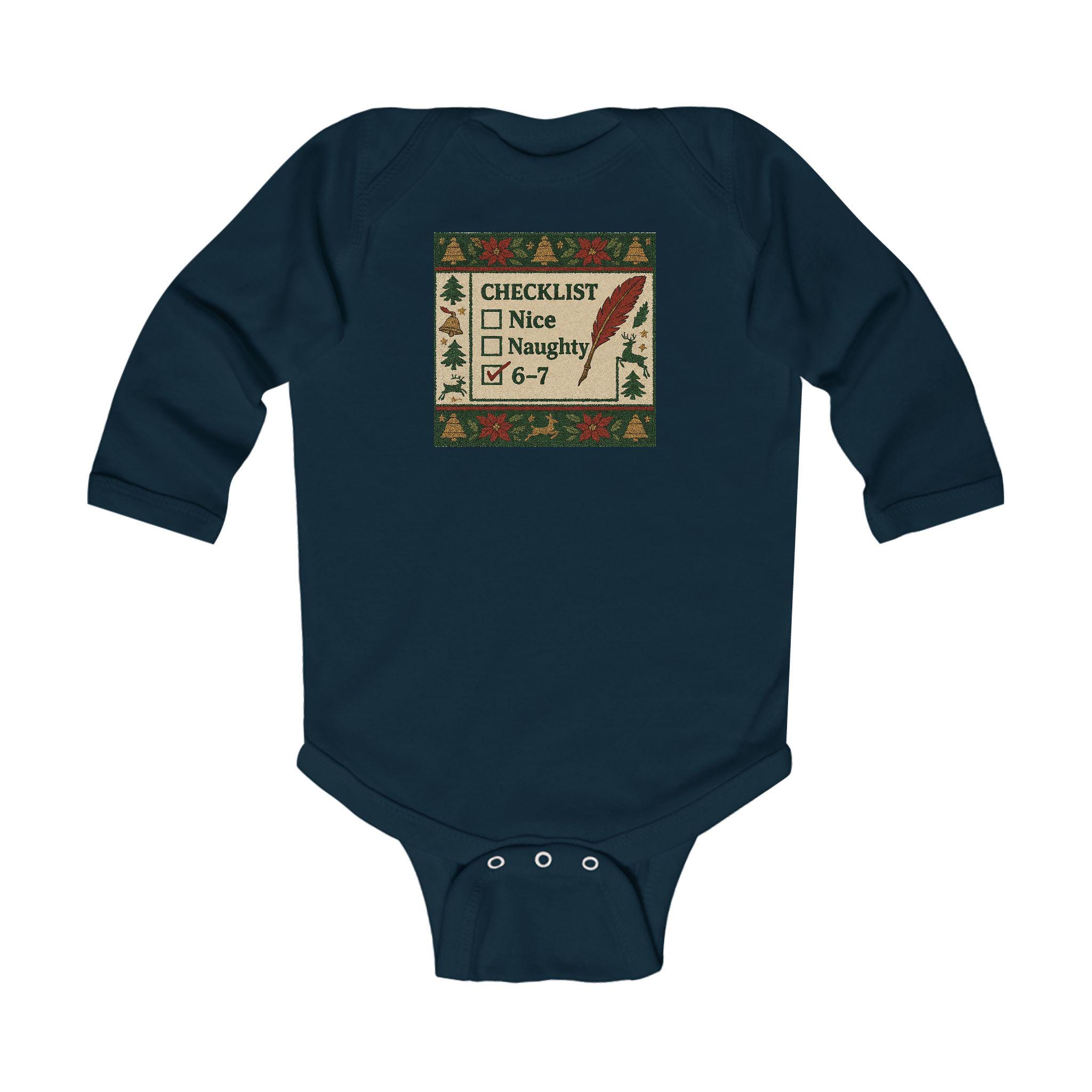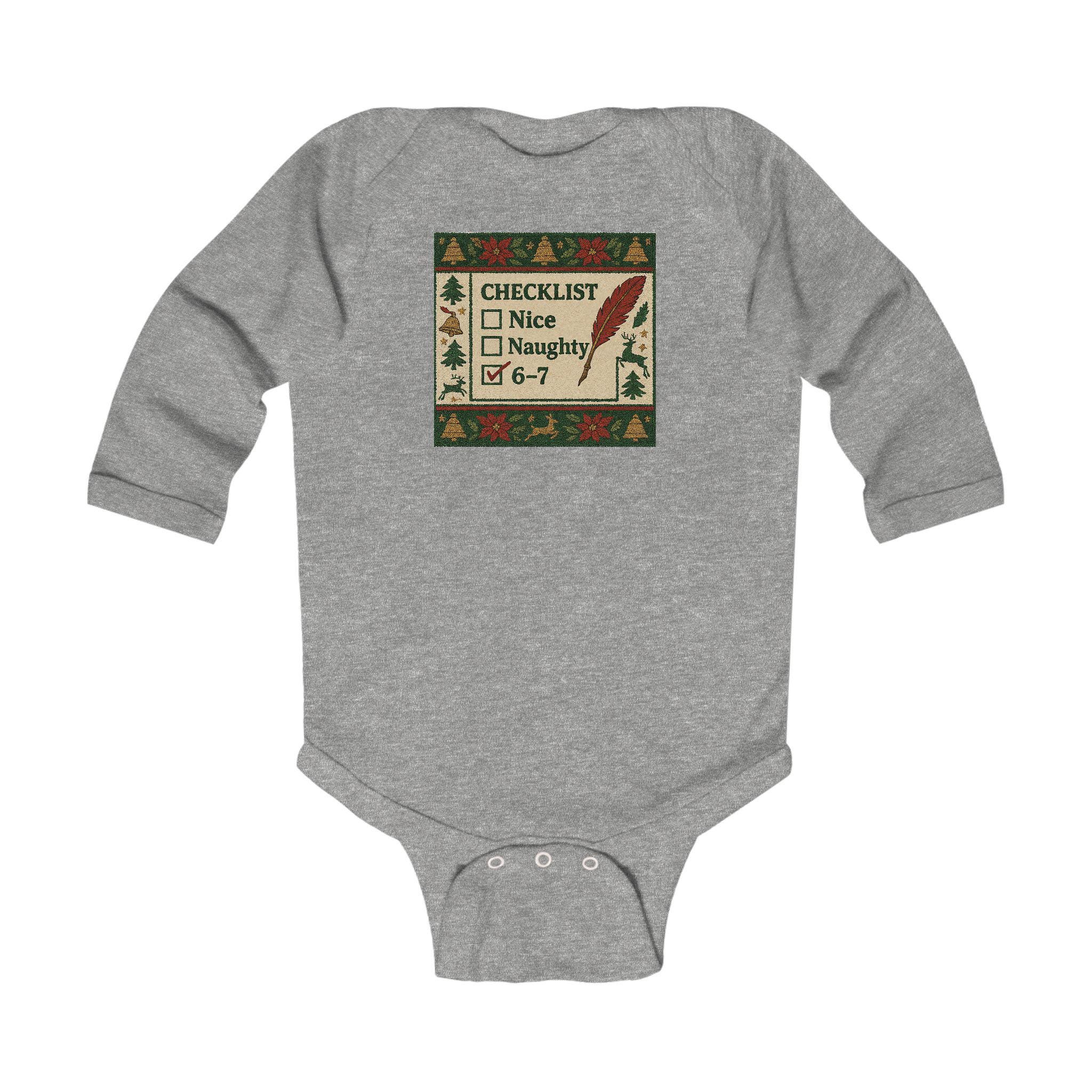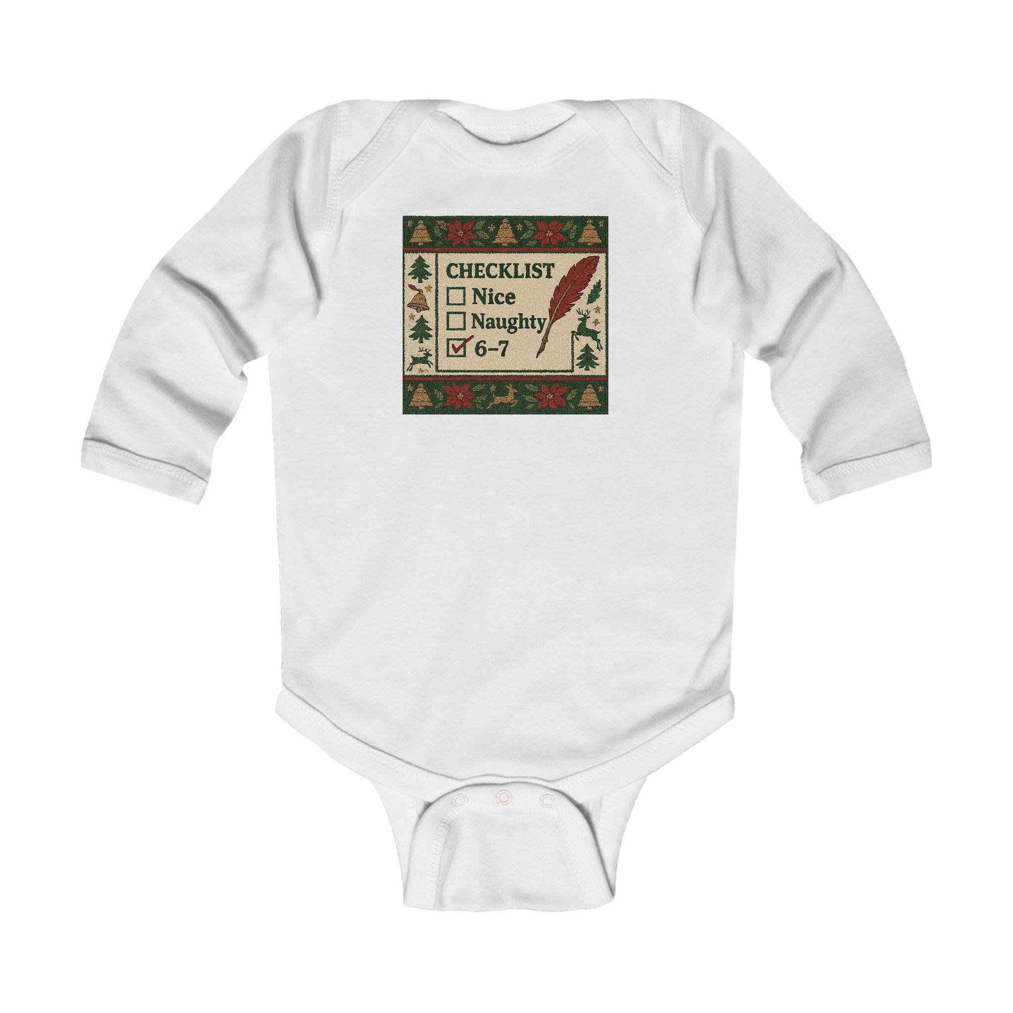 A cozy long-sleeve infant bodysuit with a playful, stitched-style holiday design at the chest. Soft white fabric carries a vintage-inspired checklist graphic framed by tiny Christmas trees, stockings, and holly. The graphic reads “Checklist” with boxes for “Nice,” “Naughty,” and a cheeky checked line for ages “6–7,” giving the piece a tongue-in-cheek, family-friendly vibe. Lightweight and breathable, this bodysuit layers easily under sweaters or wears alone for indoor holiday photos and cozy mornings at home. It’s made to move with your little one and to bring a warm, amused smile to any family gathering during the festive season.