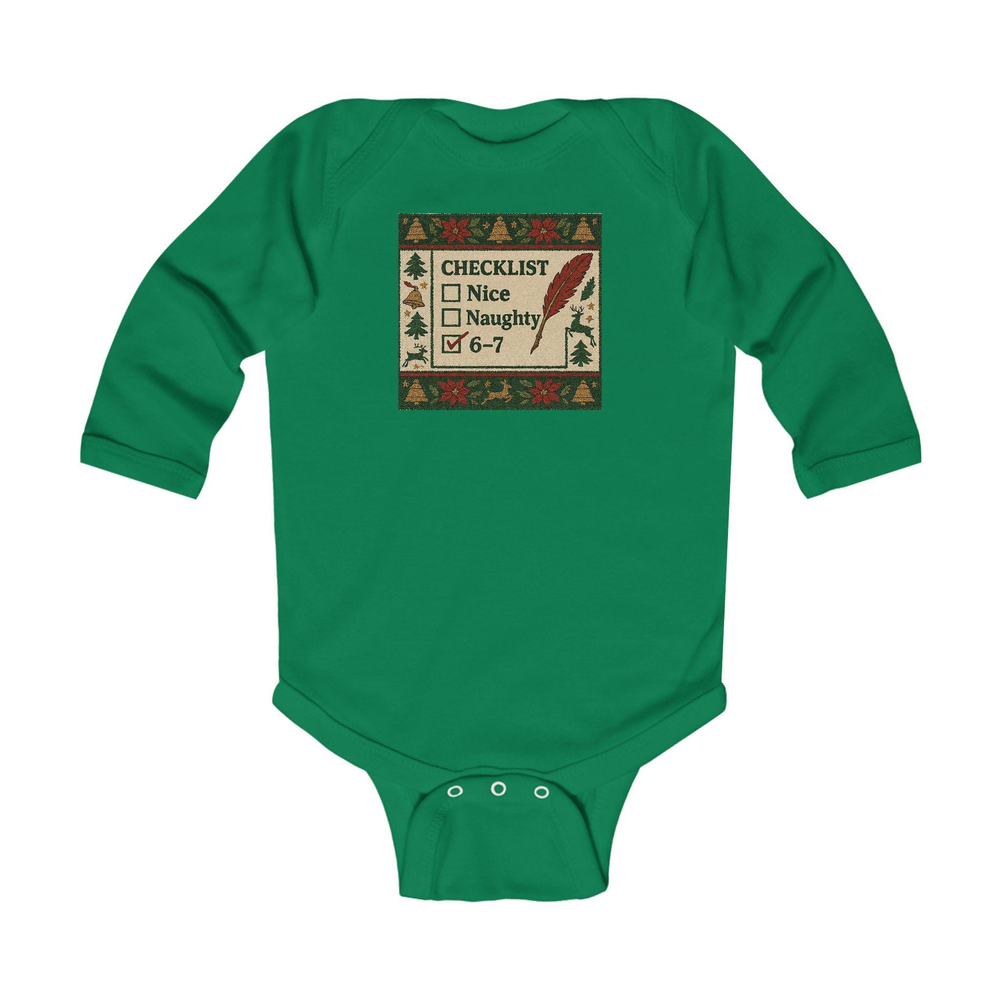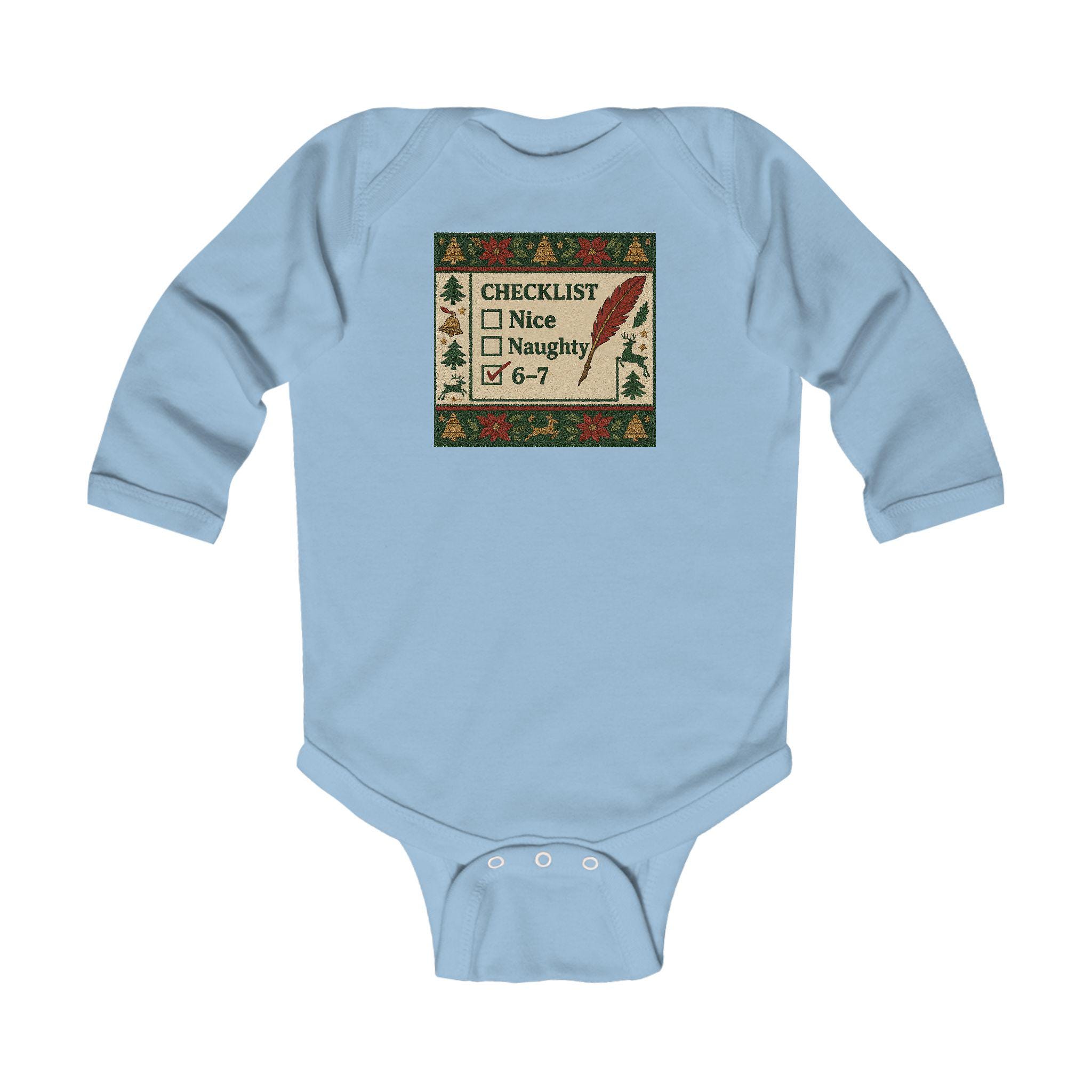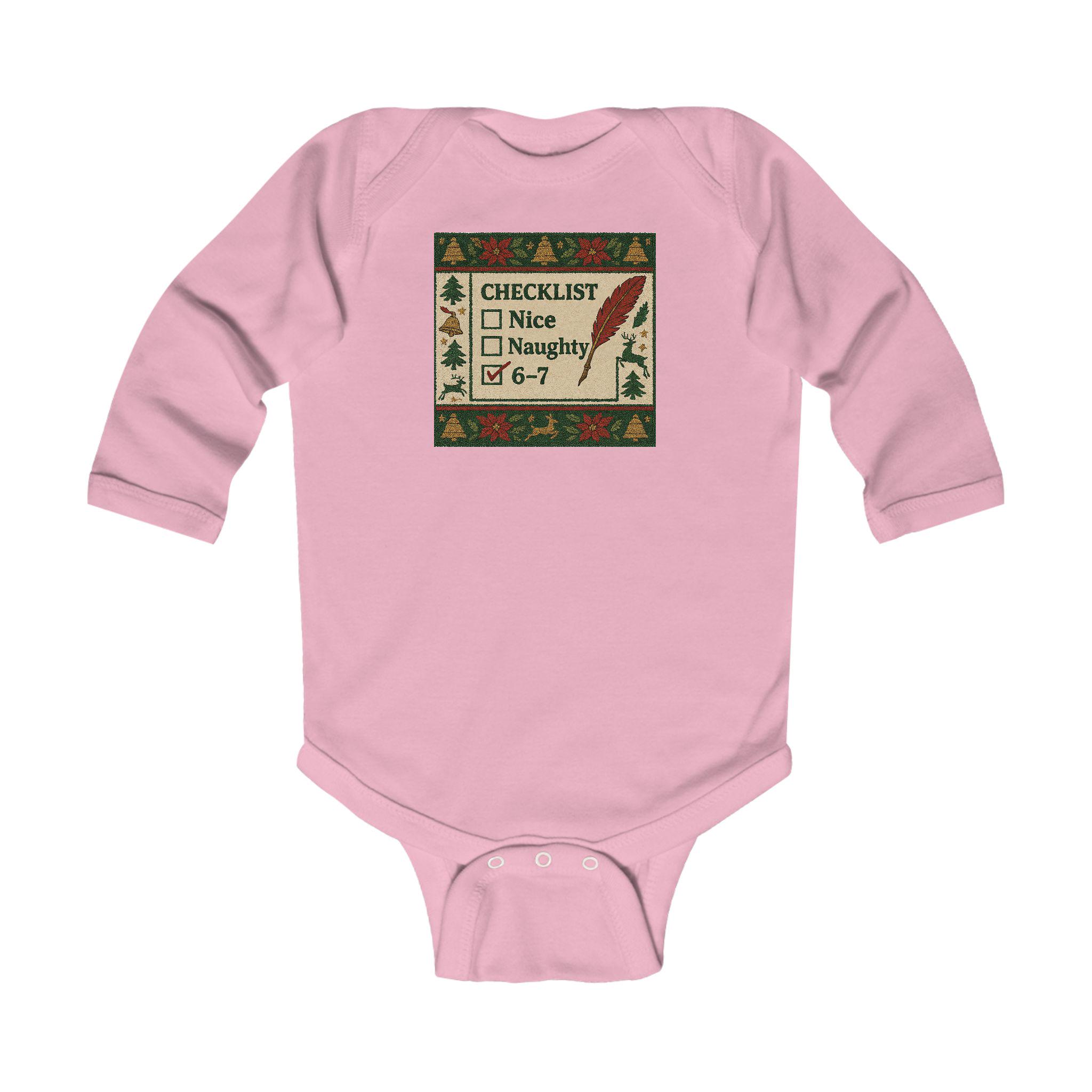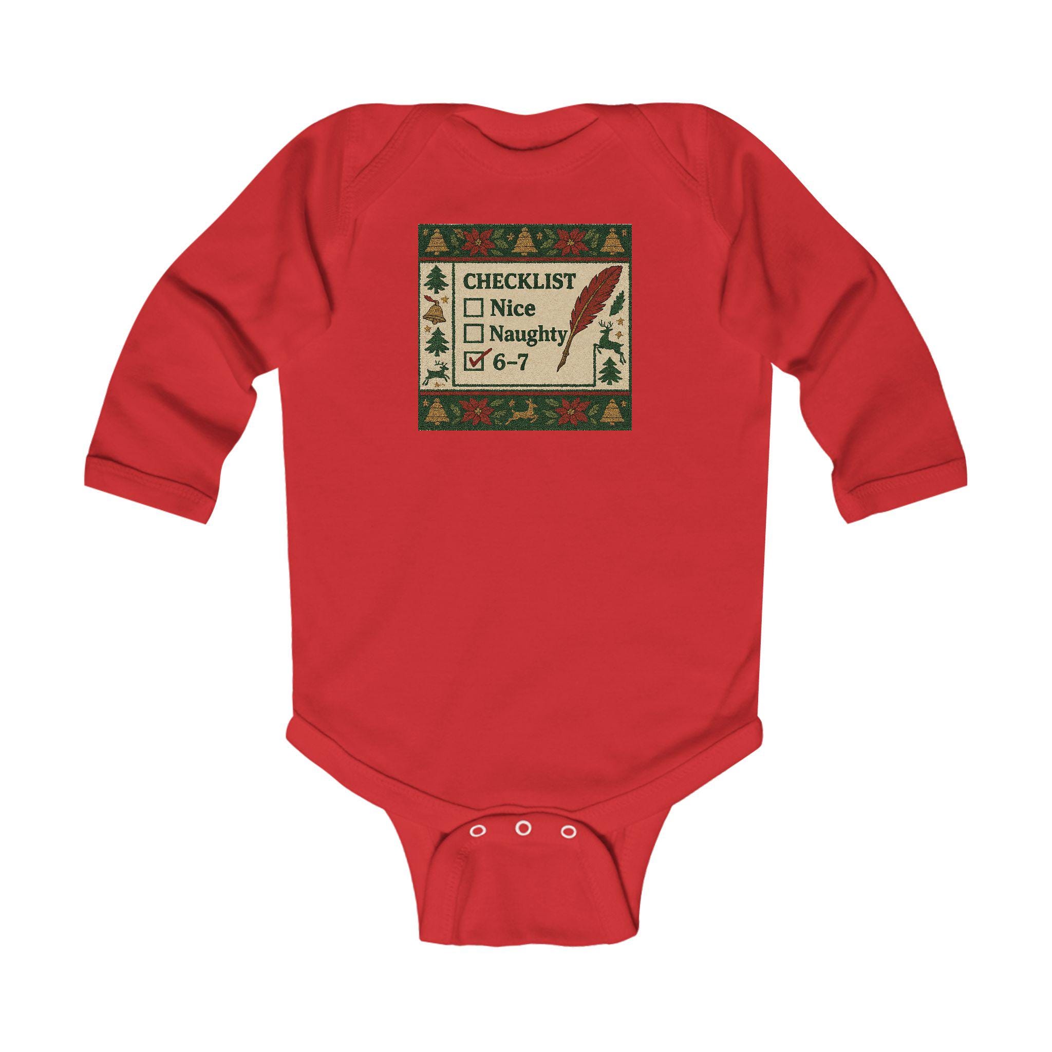 A cozy long-sleeve infant bodysuit with a playful, stitched-style holiday design at the chest. Soft white fabric carries a vintage-inspired checklist graphic framed by tiny Christmas trees, stockings, and holly. The graphic reads “Checklist” with boxes for “Nice,” “Naughty,” and a cheeky checked line for ages “6–7,” giving the piece a tongue-in-cheek, family-friendly vibe. Lightweight and breathable, this bodysuit layers easily under sweaters or wears alone for indoor holiday photos and cozy mornings at home. It’s made to move with your little one and to bring a warm, amused smile to any family gathering during the festive season.