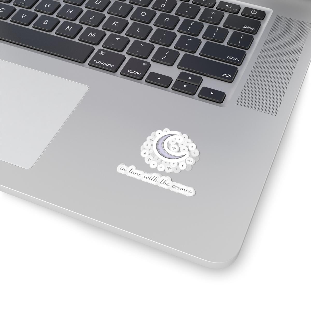 Delicate crescent and scattered stars rendered in a muted lavender-gray on a clean cream background, paired with a small, handwritten-style caption that reads like a quiet mantra. The composition leans into celestial minimalism—fine lines, centered layout, and ample negative space—so it reads as subtle astrology decor rather than a loud graphic. Sized and finished as a glossy kiss-cut sticker, it suits night-inspired, contemplative aesthetics and blends with navy, black, or neutral surfaces.