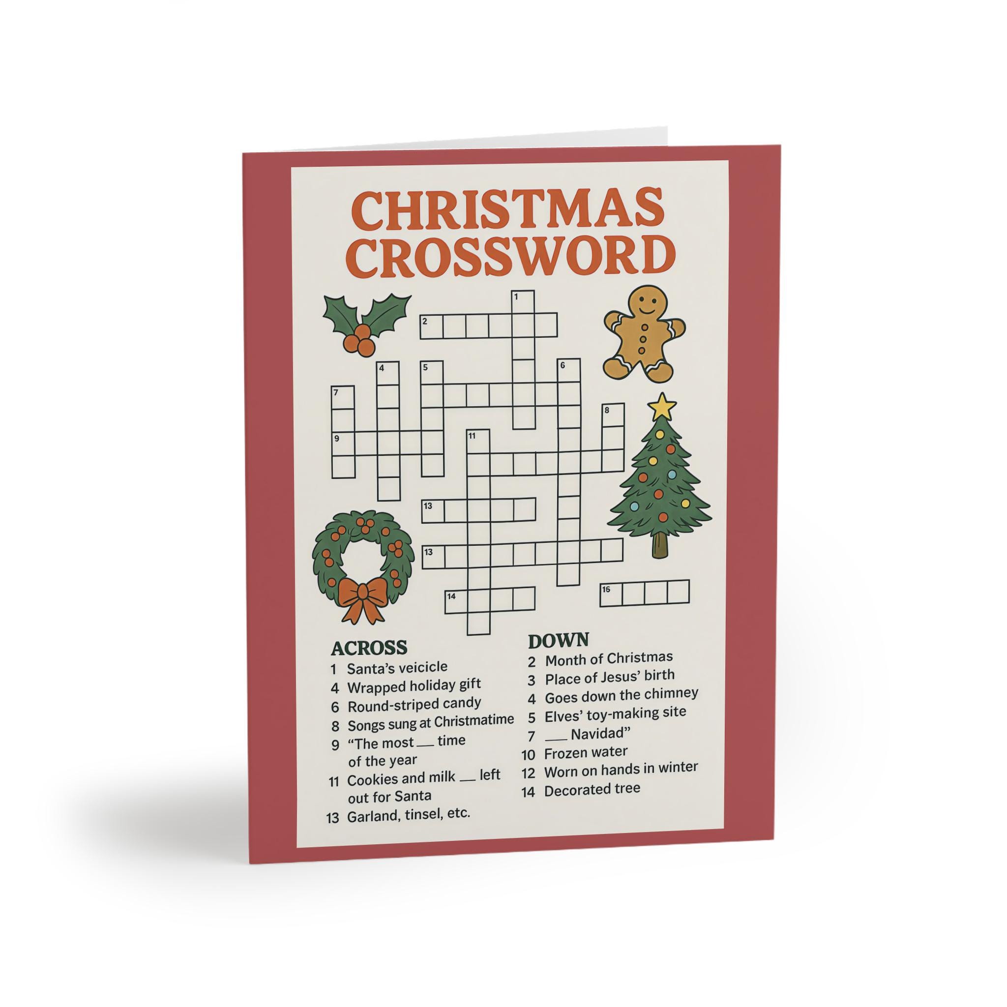 A set of cheerful Christmas crossword greeting cards that bring playful holiday spirit to your mailings. Each card features a vintage-style puzzle layout with warm, retro colors and charming illustrations — a Christmas tree, gingerbread, wreath and holly — inviting recipients to pause, solve and smile. The matte finish keeps colors soft and elegant while the included white envelopes make them ready to send. Choose packs of 8, 16, or 24 to fill stockings, letters, or table-place surprises during cozy gatherings and holiday mail days.