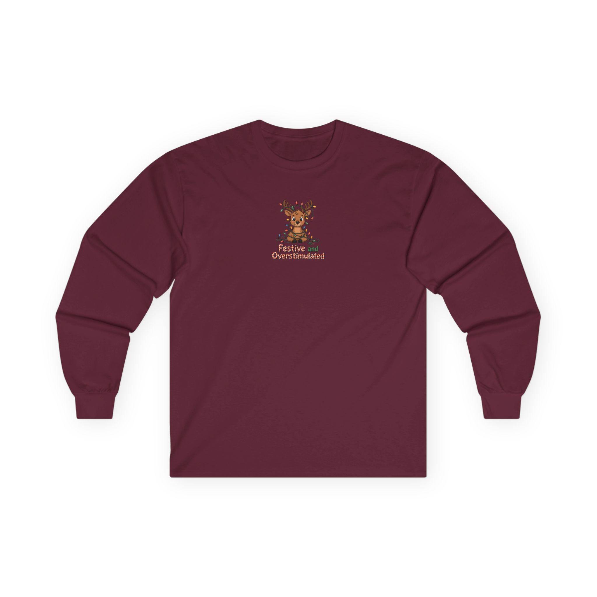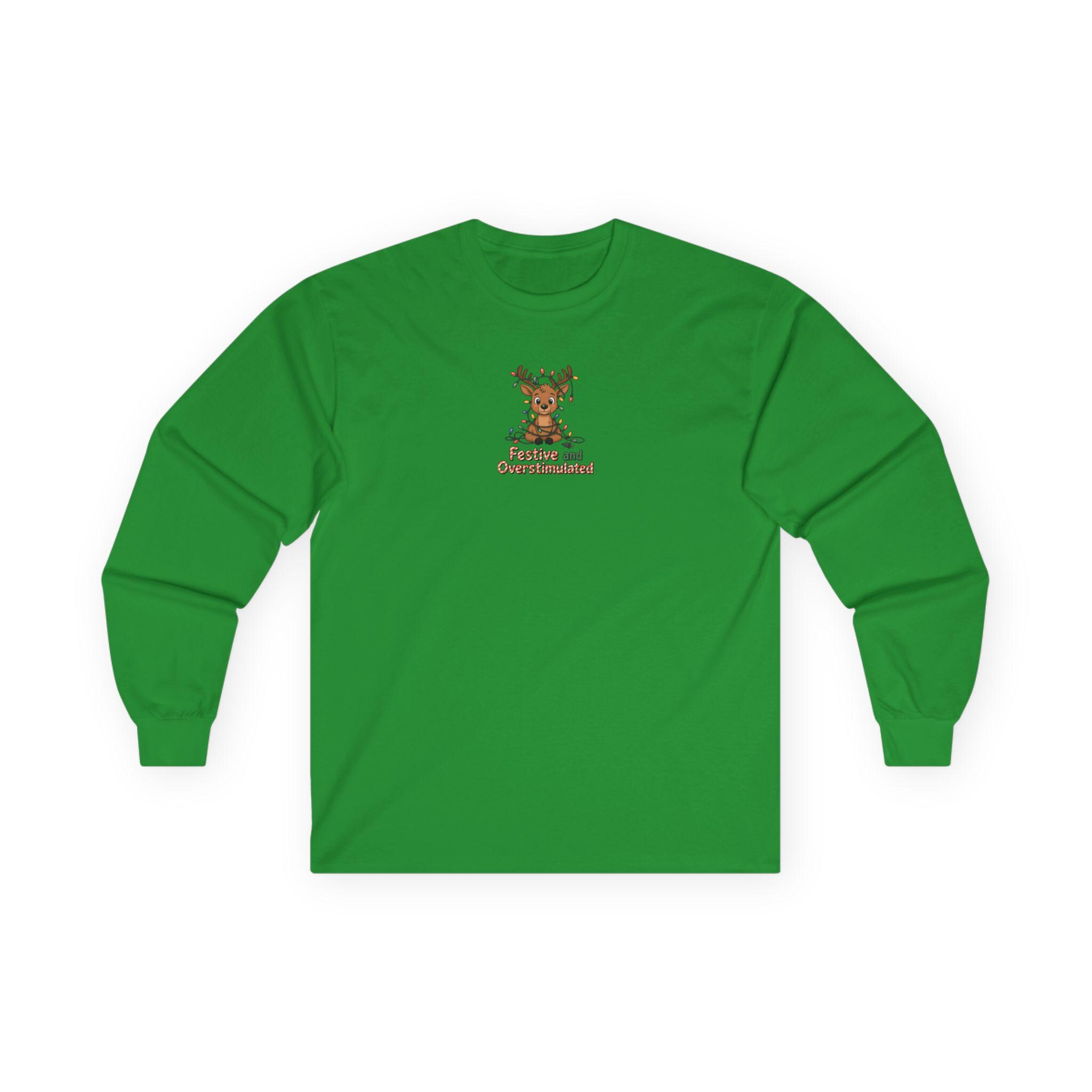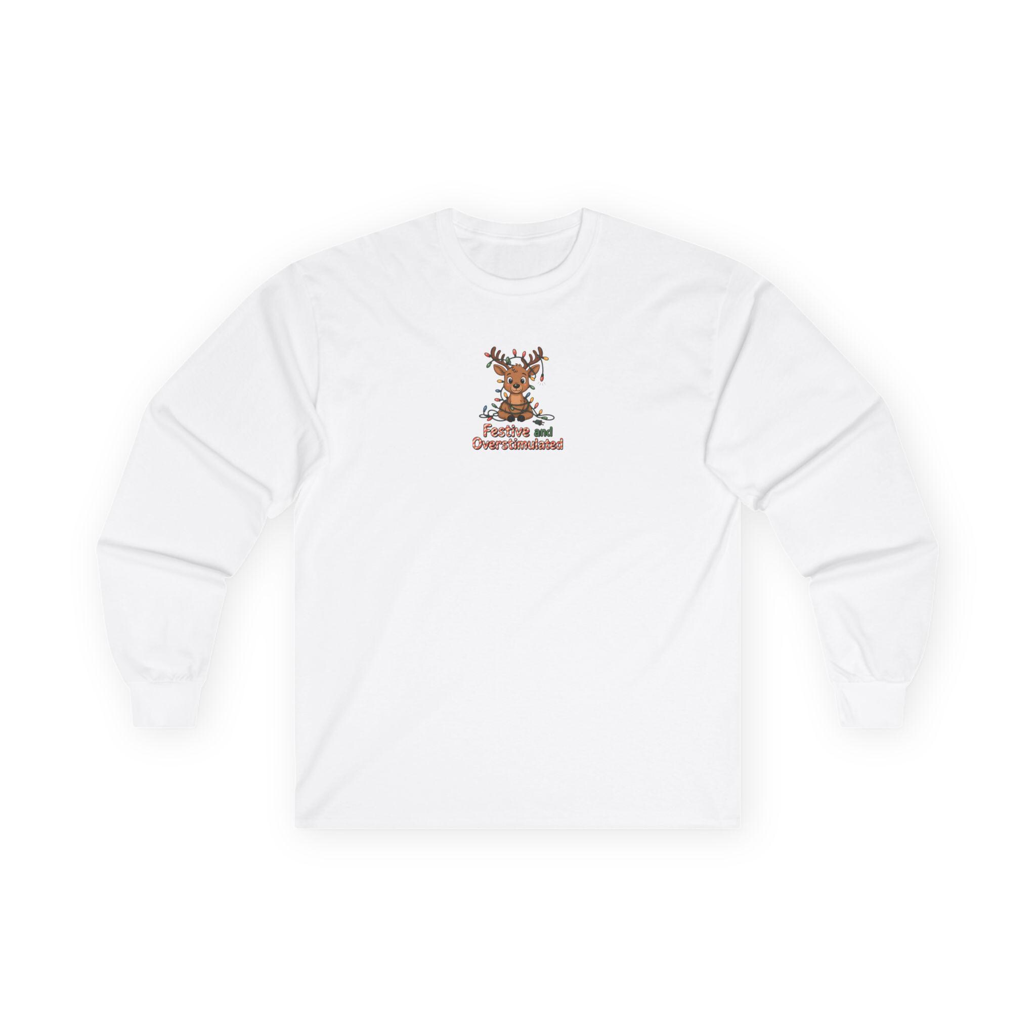 This long sleeve tee channels holiday overstimulation with a wink — the kind of shirt you reach for when twinkling lights, crowded kitchens, and loud laughter are all part of the plan. The slightly vintage, thicker cotton feels grounded against the skin while the relaxed classic fit lets you move through prepping, mingling, and lounging without fuss. Subtle details like a ribbed collar and shoulder tape keep the silhouette tidy after multiple wears. Say it with a grin: you came for the chaos and stayed for the cocoa. Wear it to late-night wrapping sessions, family movie marathons, or neighborhood light walks to lean into the messy, bright pulse of the season.