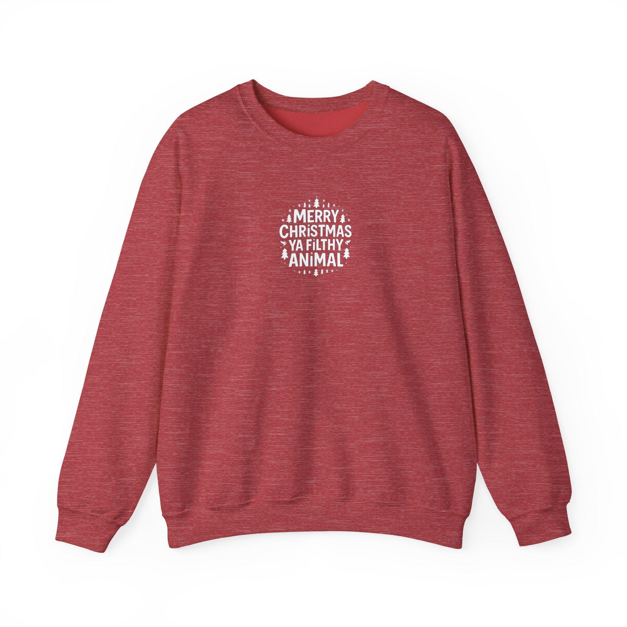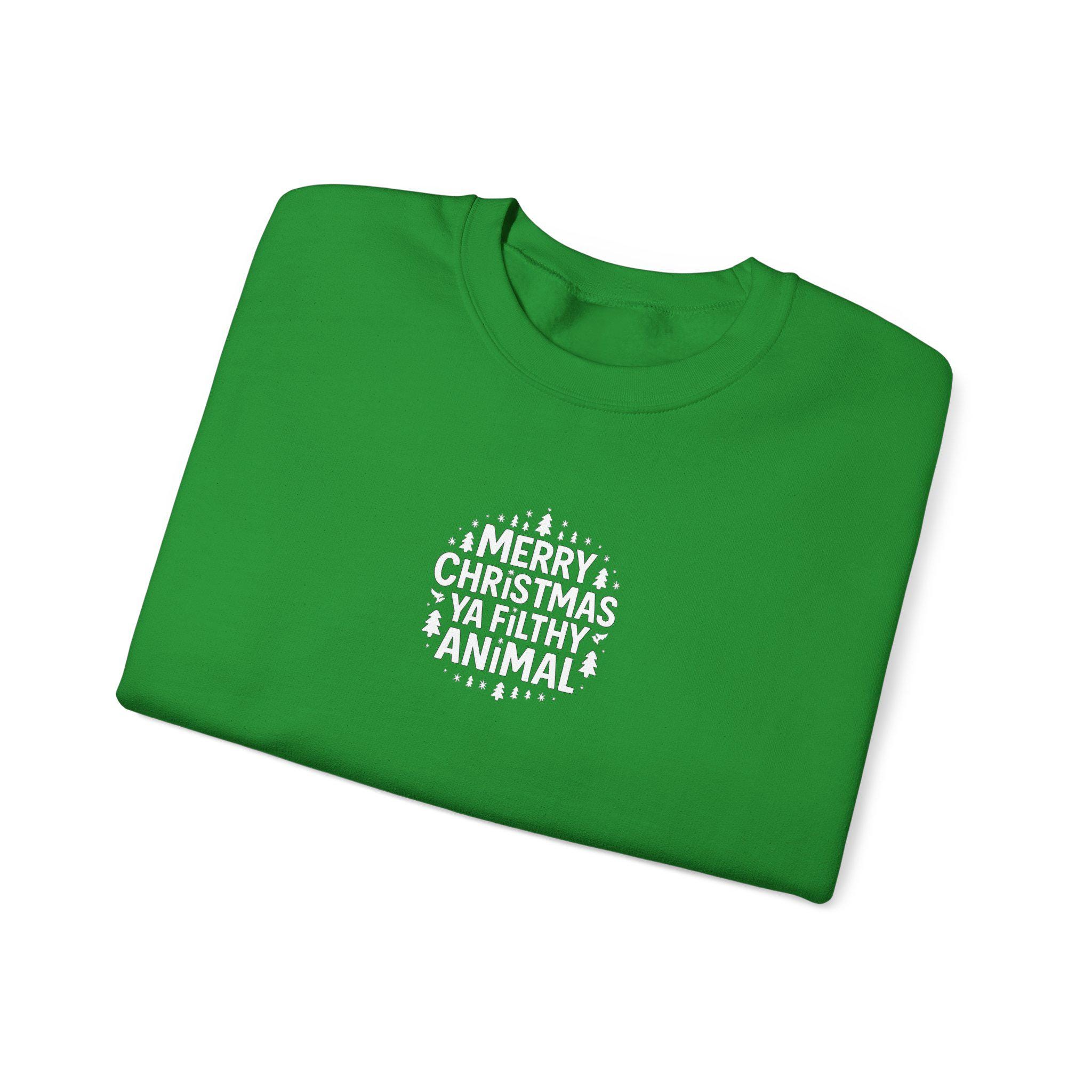 This cozy crewneck sweatshirt brings a wink of nostalgia and holiday mischief to cold evenings. The playful “Merry Christmas Ya Filthy Animal” line recalls the cheeky humor of classic home-alone movie nights, making the sweatshirt feel like the wearable version of a warmly lit living room, popcorn bowl in hand. It’s substantial enough to ward off winter drafts yet soft against the skin, so you’ll reach for it during late-night movie marathons, casual neighborhood caroling, or relaxed holiday gatherings. Embroidered or printed accents add texture and a handcrafted touch that reads like a little inside joke among friends and family. Built to last and responsibly made, this sweatshirt settles into your rotation — the one you grab when you want to be comfortable, a little silly, and fully in the holiday spirit.