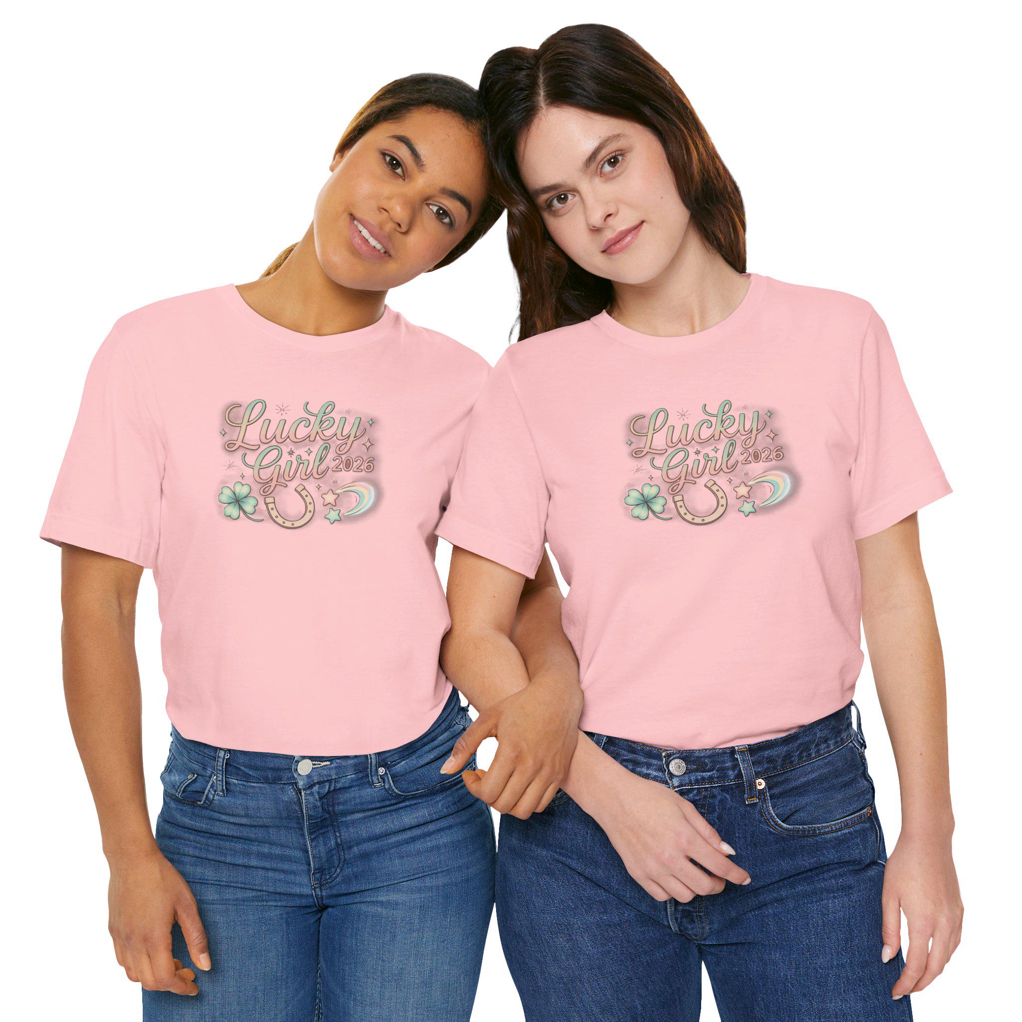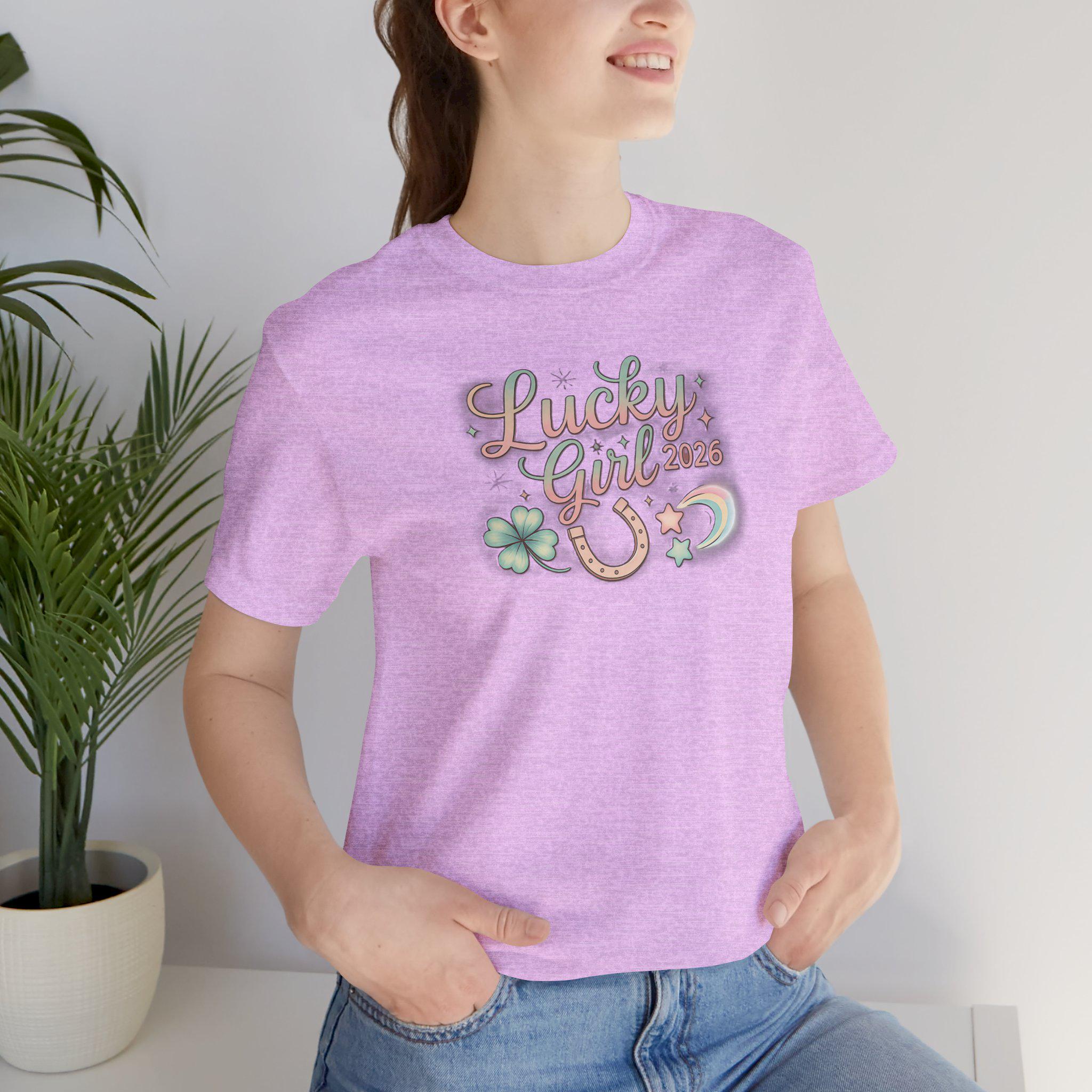 Soft, whimsical 'Lucky Girl 2026' artwork rendered in a pastel, metallic-accent palette — a playful, manifest-luck design featuring clover, horseshoe, tiny stars and a soft rainbow that reads like a wearable charm. The gentle script and sparkly accents fit the Lucky Girl 2026 trend vocabulary (manifest luck, lucky charms, angel number) while keeping a light, celebratory feel for late-December and New Year styling. On a breathable, lightweight unisex jersey tee, the motif reads as an optimistic mantra you can layer under a cardigan or wear solo for casual days when you want a subtle, hopeful statement.