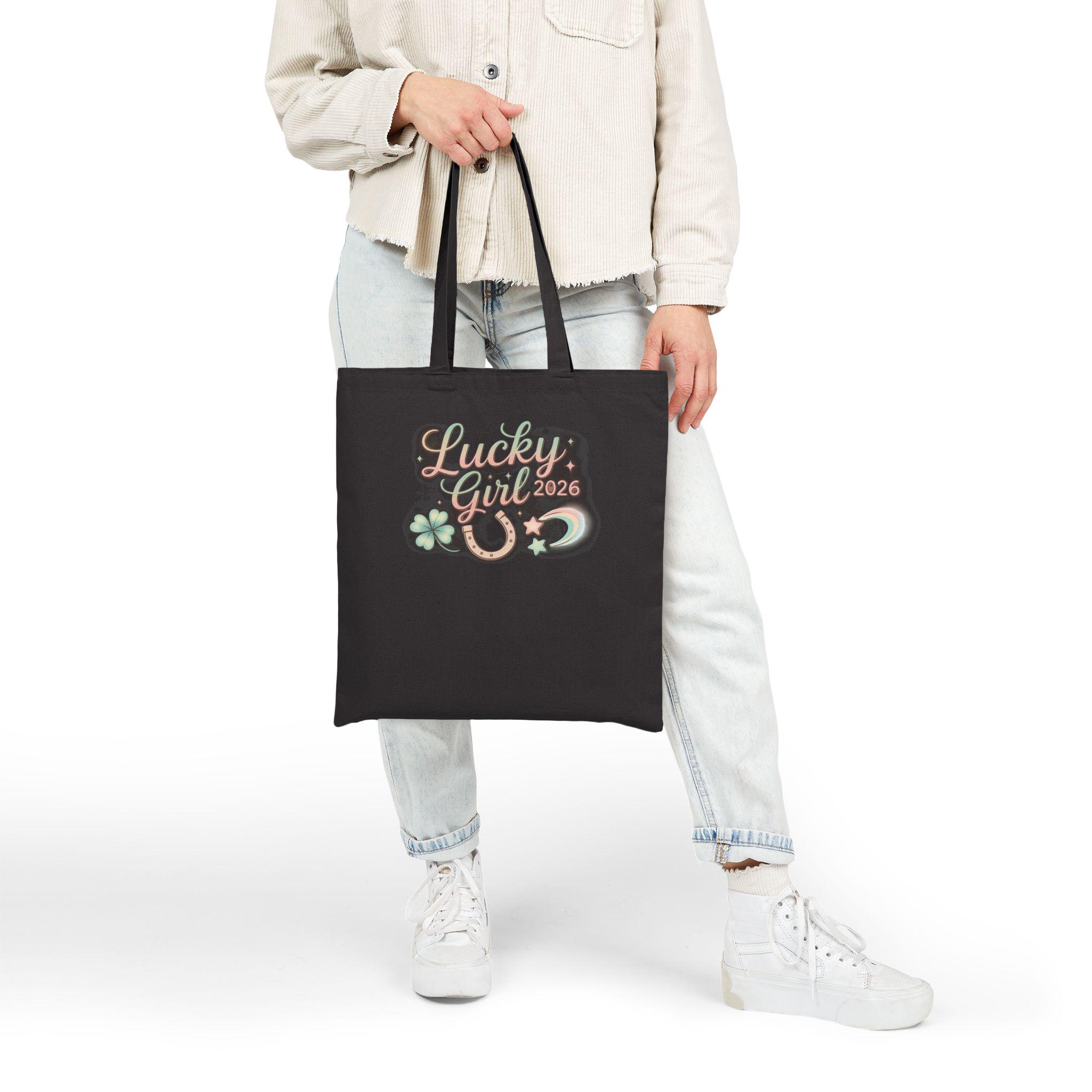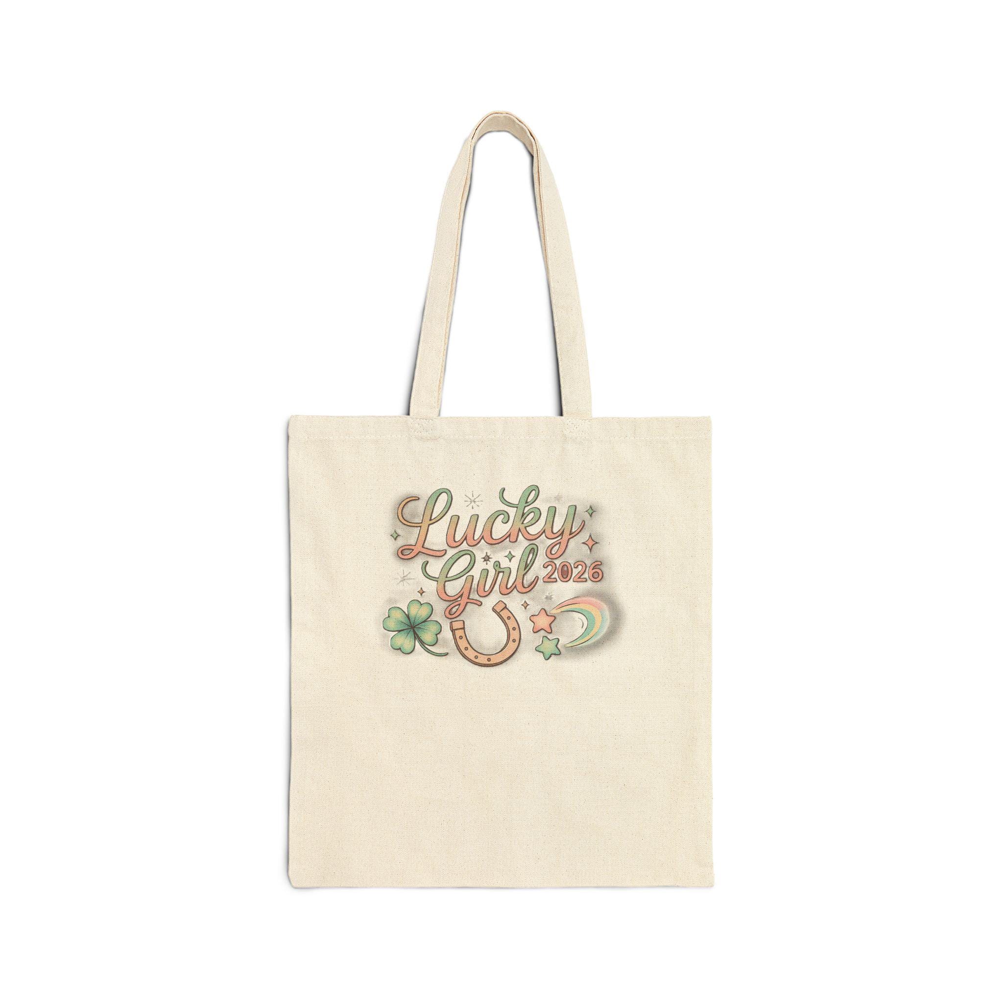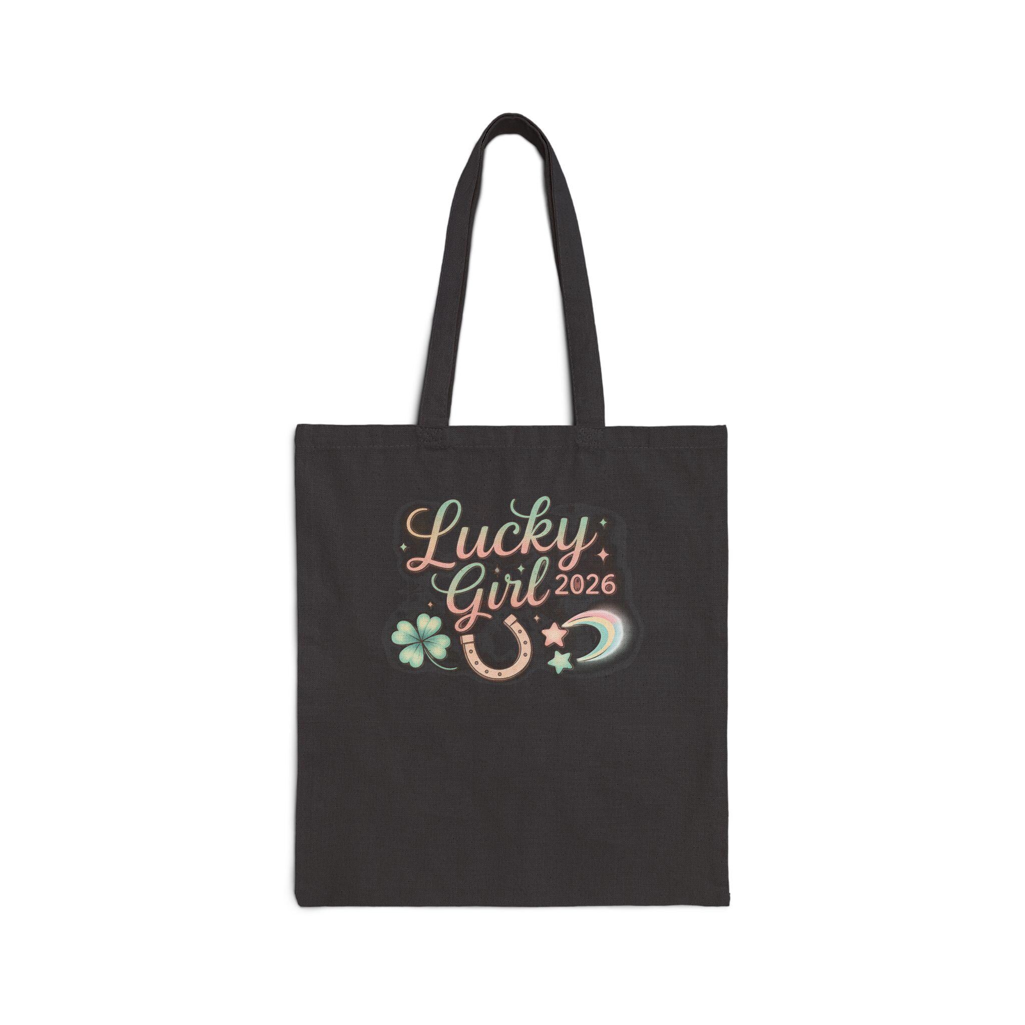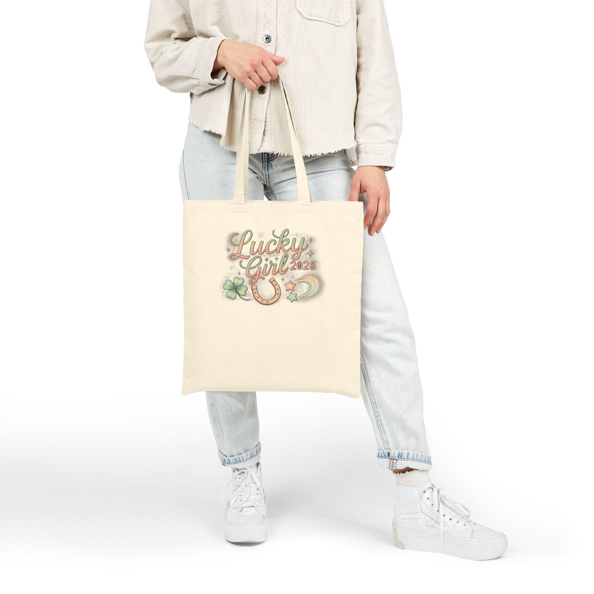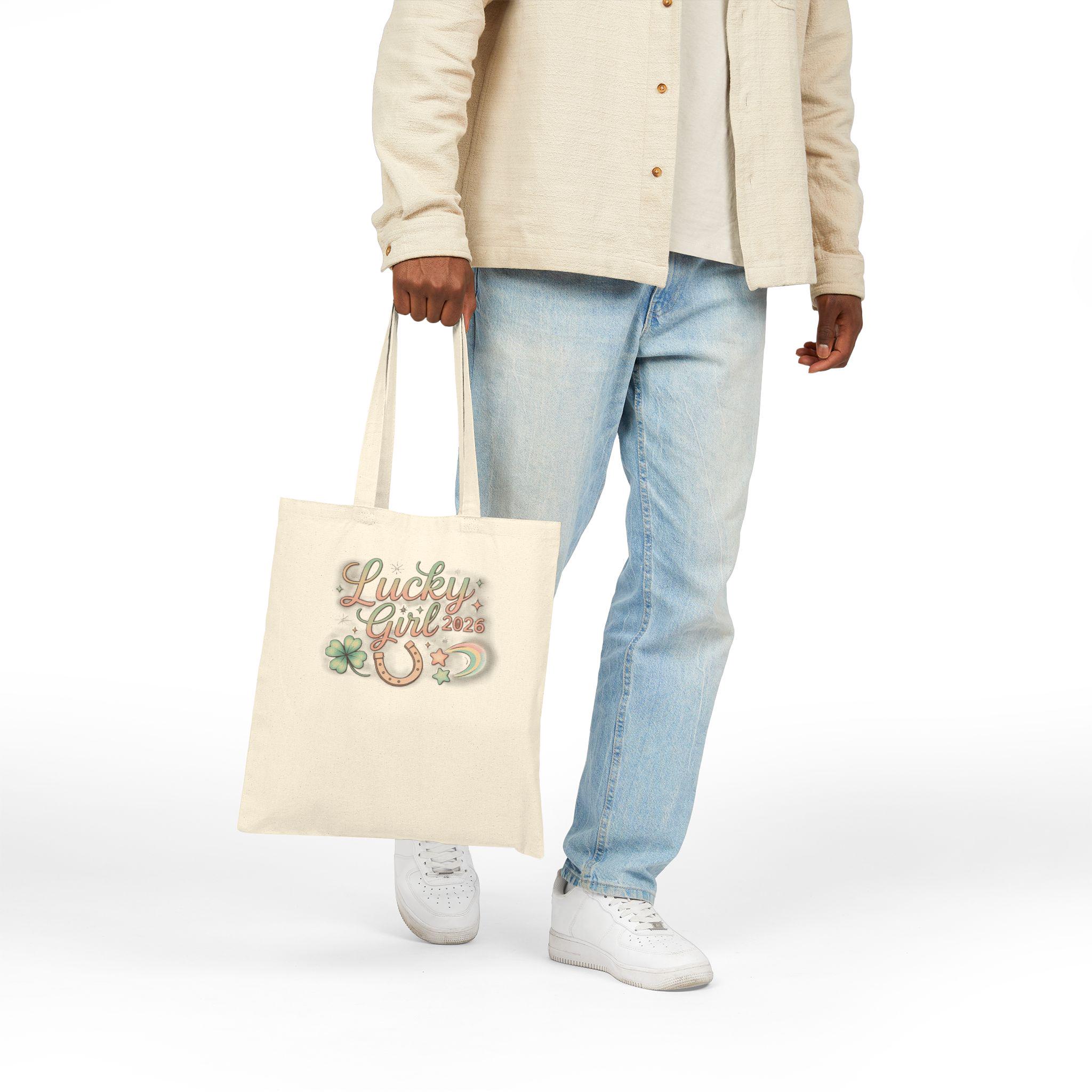 Soft, whimsical tote printed with a pastel metallic-accented “Lucky Girl 2026” charm motif — small script lettering surrounded by a horseshoe, clover, crescent, and star accents. The design leans into the Lucky Girl 2026 manifest-luck trend with a glowy, feminine vibe that reads like a wearable affirmation: subtle sparkle details and airy colors make the artwork feel like a personal charm that travels with you. Lightweight enough for market runs and sturdy for everyday carry, it complements outfits that favor soft, glowy palettes and manifesting-style accessories.