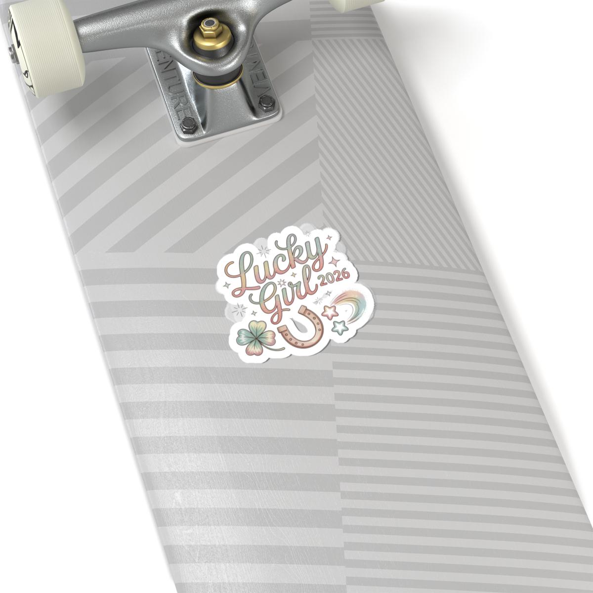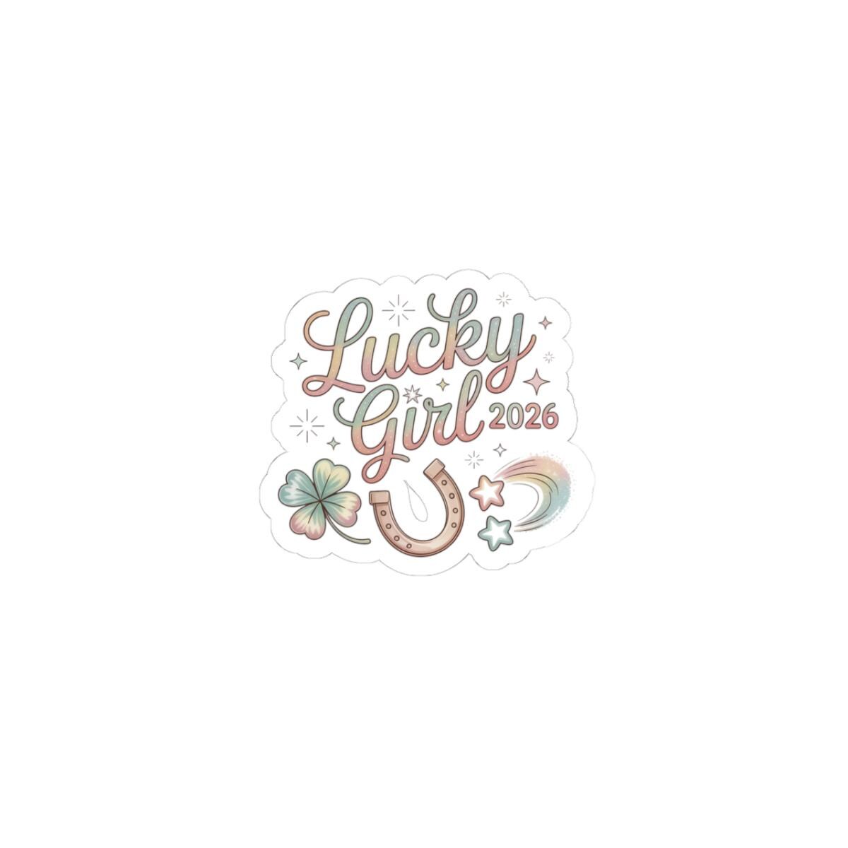 Soft pastel charm sticker set blending lucky symbols with a glowy, feminine manifesting vibe. The artwork pairs cursive, sparkly lettering with a four-leaf clover, horseshoe, shooting star and subtle metallic accents to read as an upbeat 2026 manifestation charm. Fits the ‘Lucky Girl 2026’ trend by offering a playful, optimistic deco piece shoppers use to keep a small daily affirmation visible.