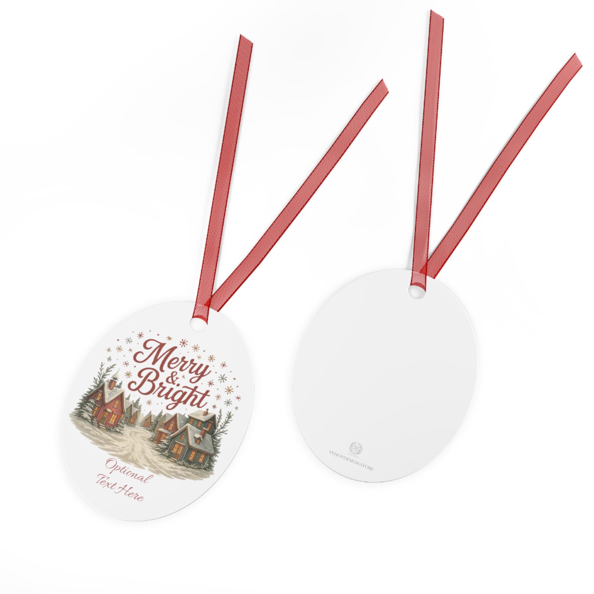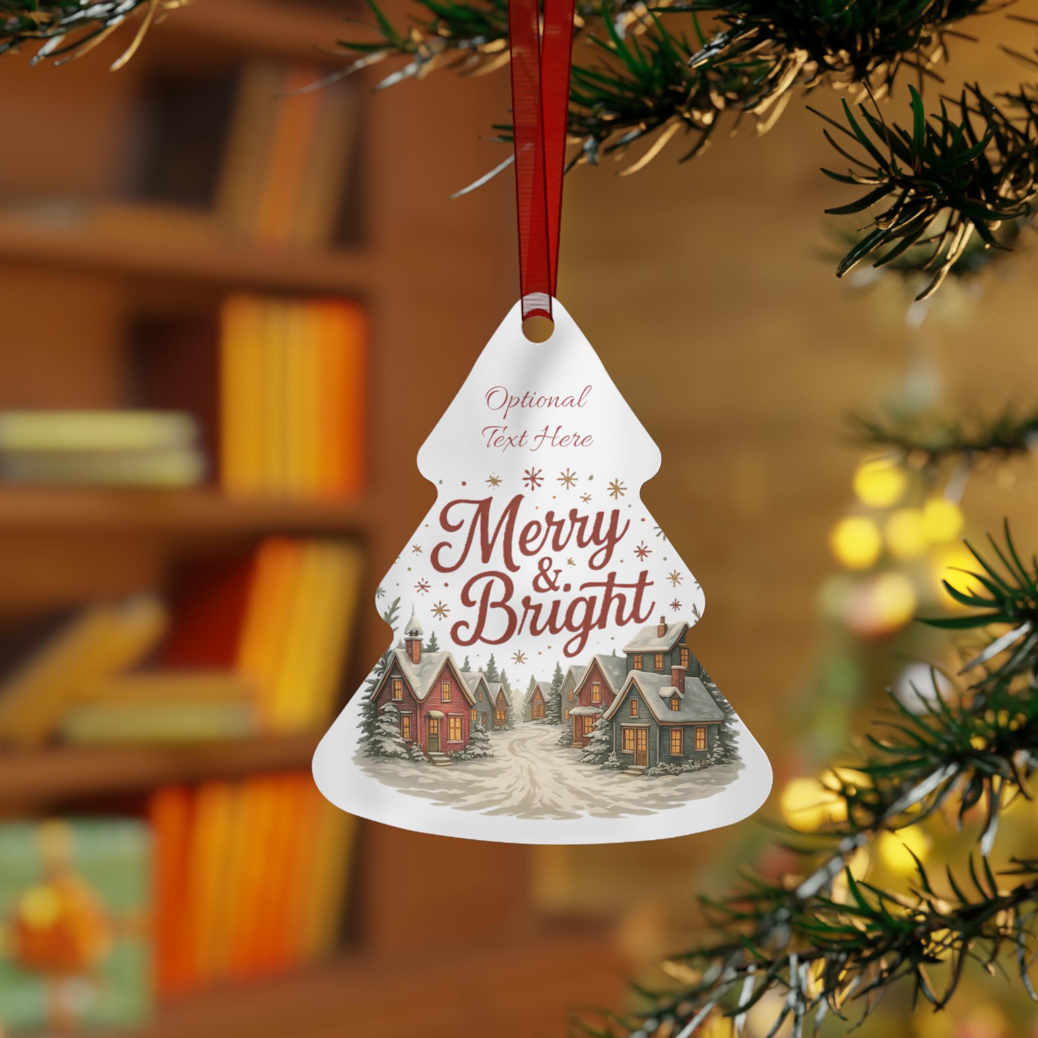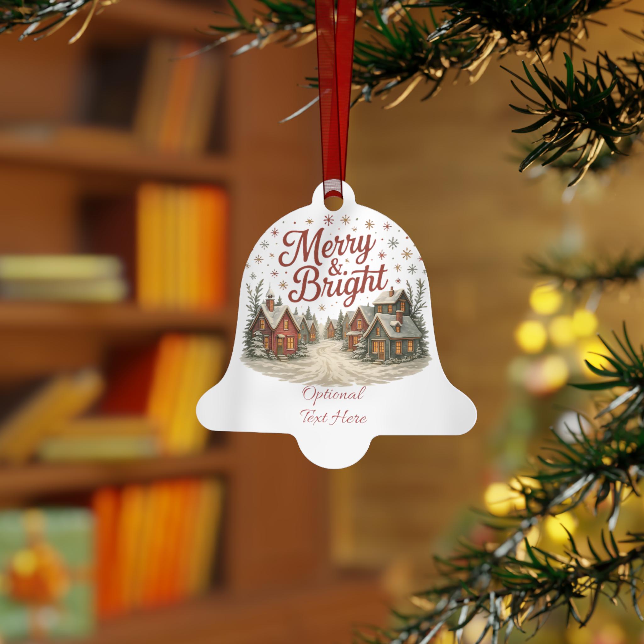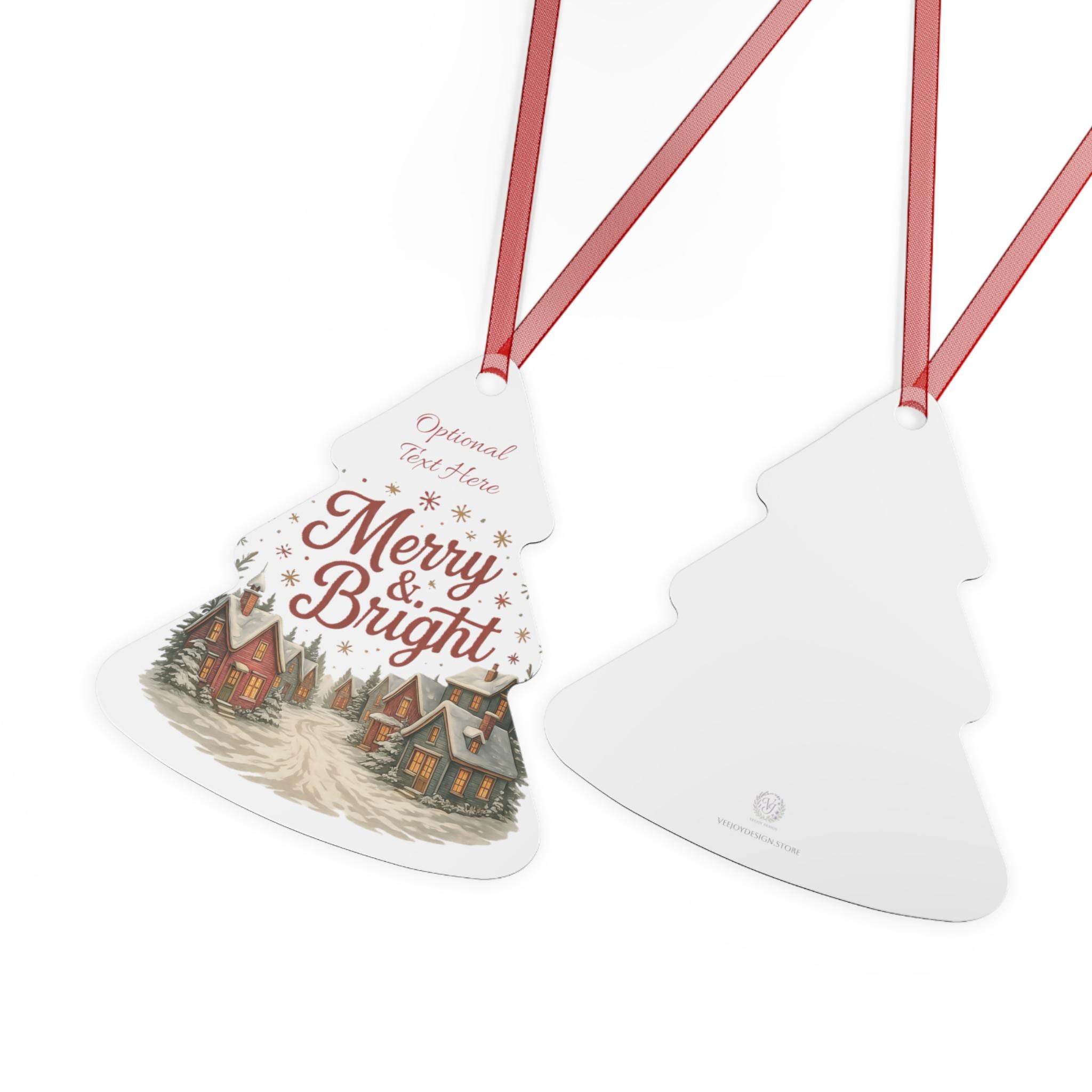 These glossy metal ornaments bring a warm, storybook holiday scene to your tree. Each lightweight aluminum piece features bright, long-lasting prints on both sides and arrives with a red ribbon threaded through a ready-made hole — hang it straight from a branch or loop it into a garland. The bell-shaped example carries a nostalgic village illustration and space for optional text, lending a personal, homey touch to mantel displays, gift tags, or memory trees. Durable and scratch-resistant, they keep their color year after year and clean up easily so the scene stays fresh through every season of celebration.