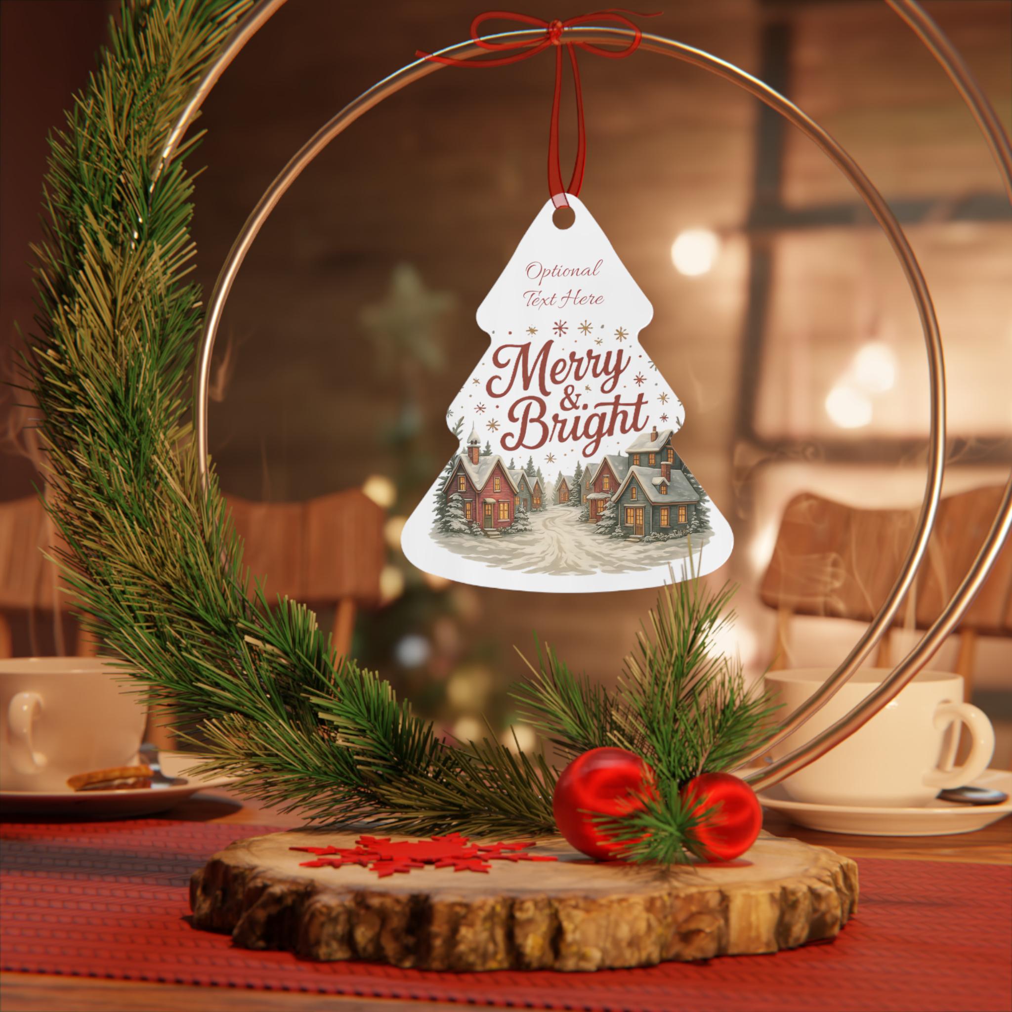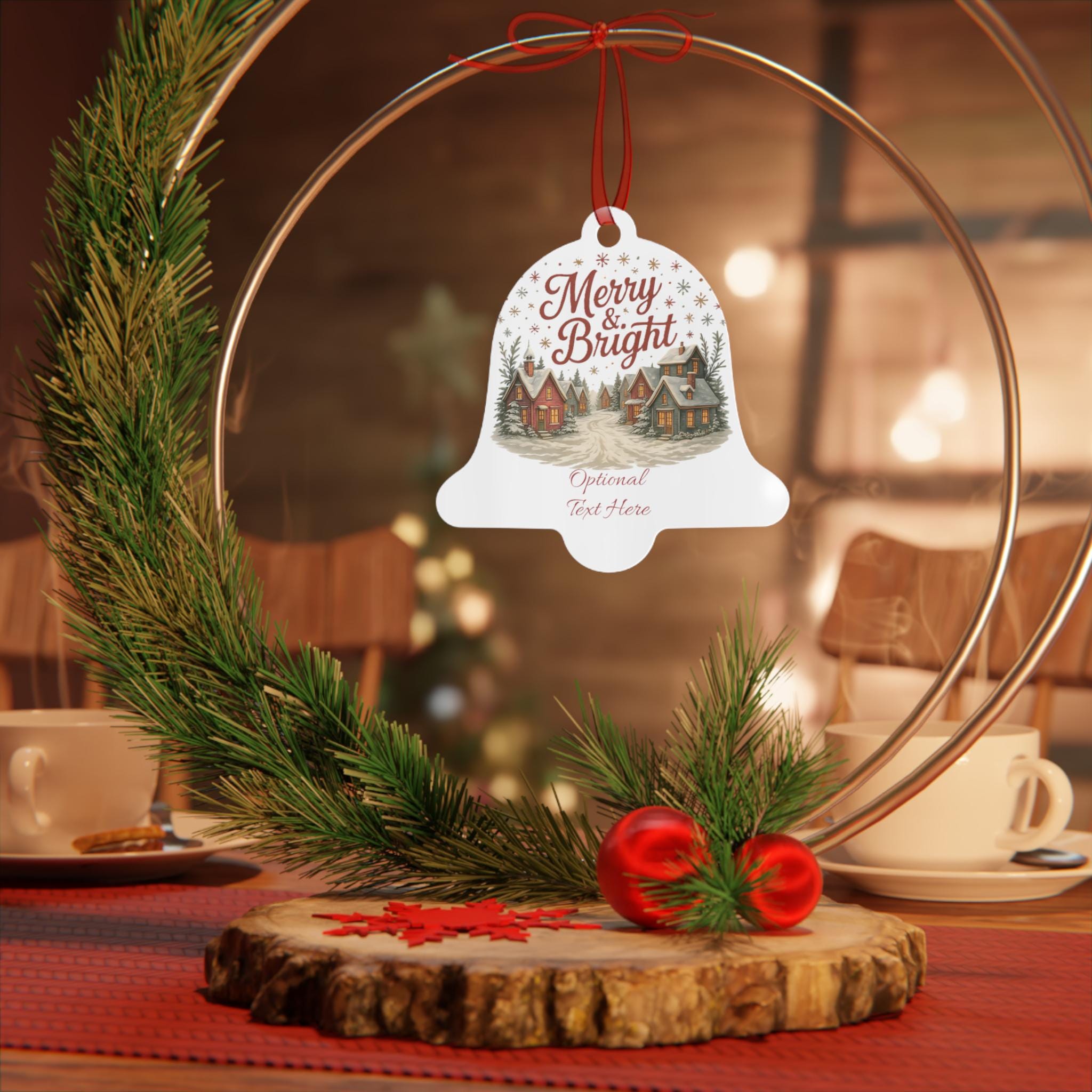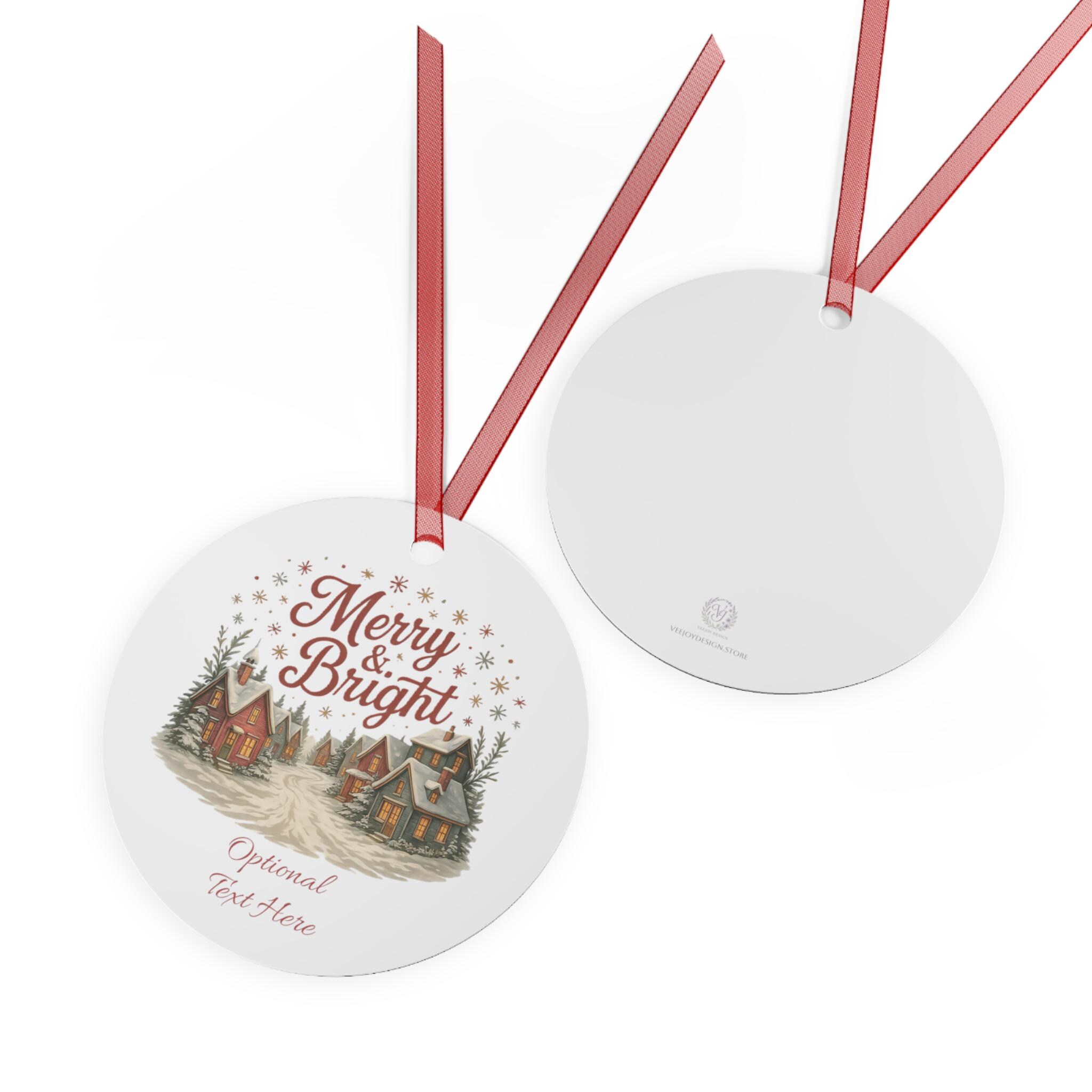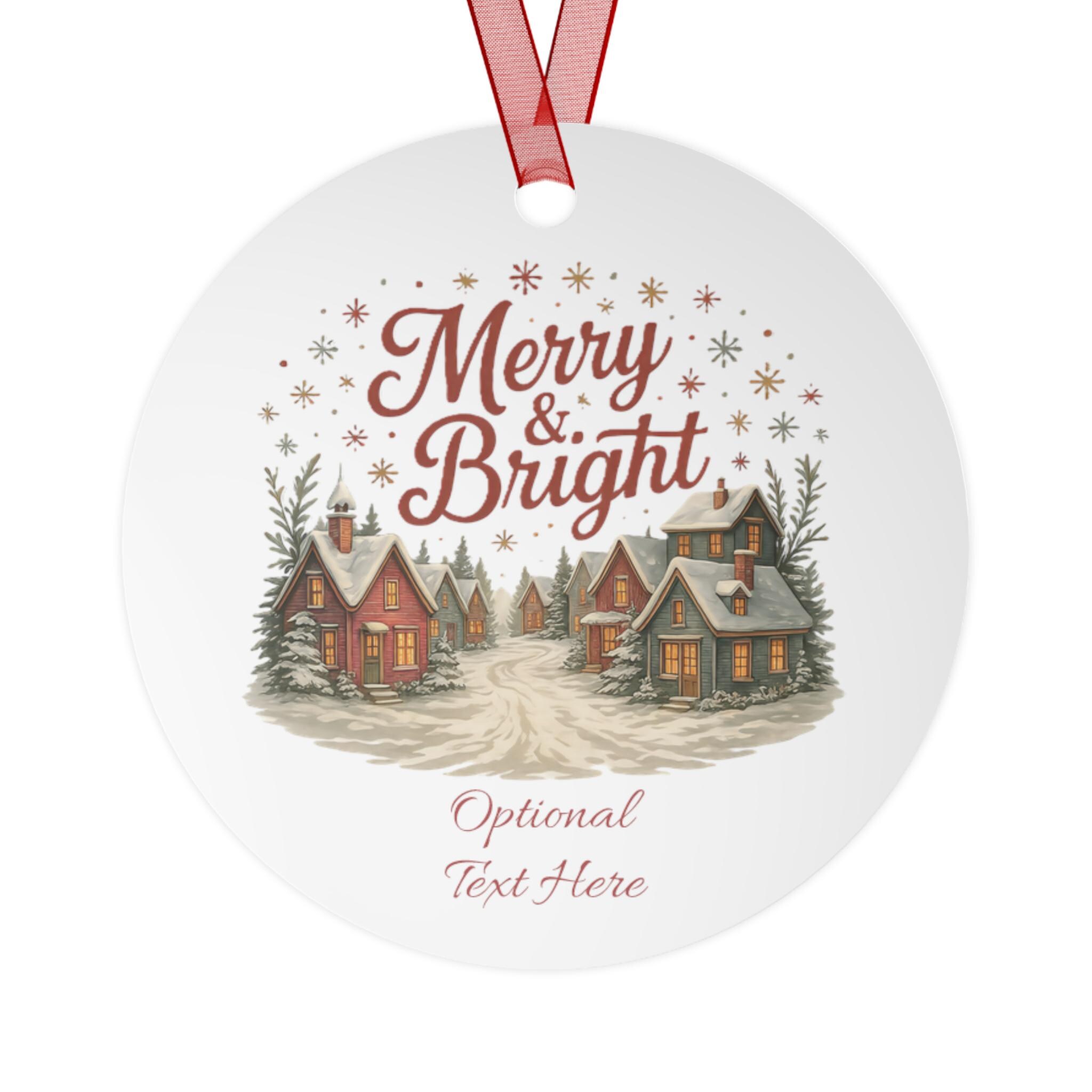 These glossy metal ornaments bring a warm, storybook holiday scene to your tree. Each lightweight aluminum piece features bright, long-lasting prints on both sides and arrives with a red ribbon threaded through a ready-made hole — hang it straight from a branch or loop it into a garland. The bell-shaped example carries a nostalgic village illustration and space for optional text, lending a personal, homey touch to mantel displays, gift tags, or memory trees. Durable and scratch-resistant, they keep their color year after year and clean up easily so the scene stays fresh through every season of celebration.