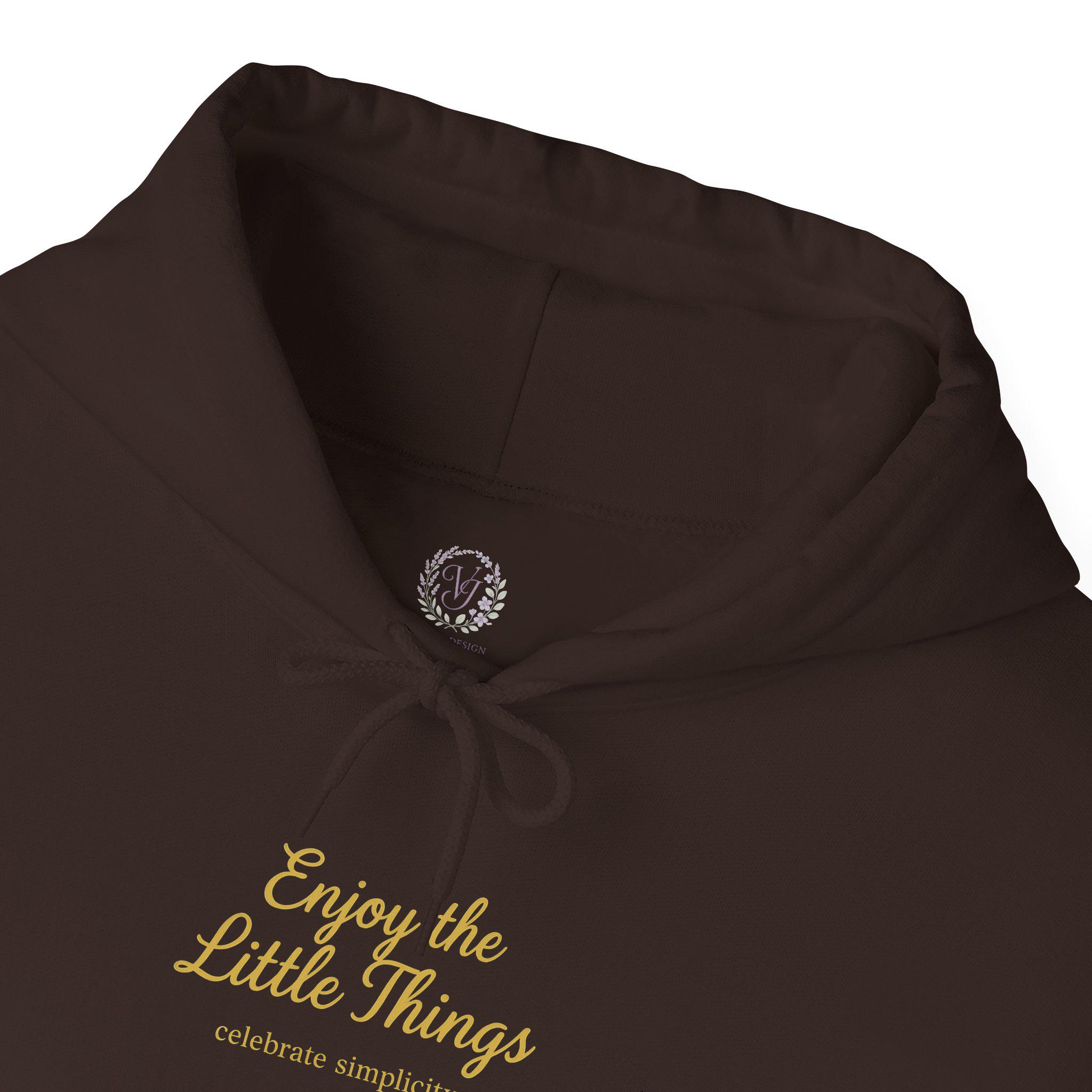 This gold-script hoodie is quietly luxurious — a soft, warm layer that reads like a personal reminder to slow down. The minimalist gold typography whispers, "Enjoy the little things," catching light without shouting. Wear it on slow mornings with coffee on the porch, on chilly walks through neighborhood streets, or layered for low-key gatherings when you want comfort that still feels thoughtfully curated. The roomy kangaroo pocket soothes cold hands; the double-lined hood and color-matched drawcord give a tailored, elevated look. It ages into a lived-in favorite that keeps the message close: notice small joys and carry them with you.