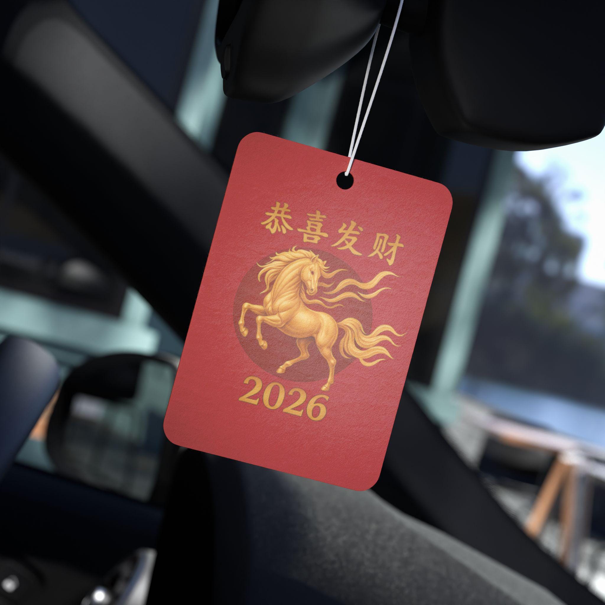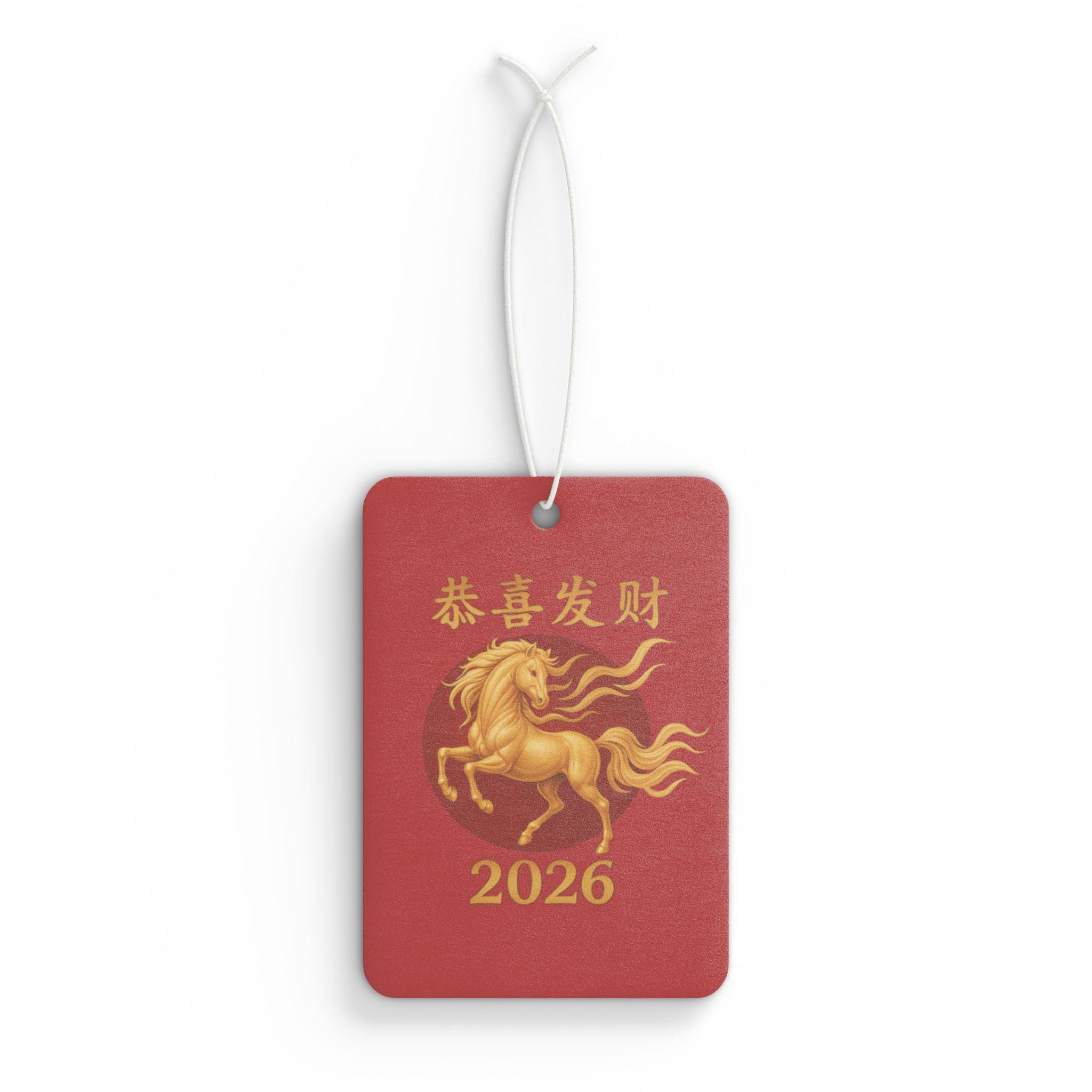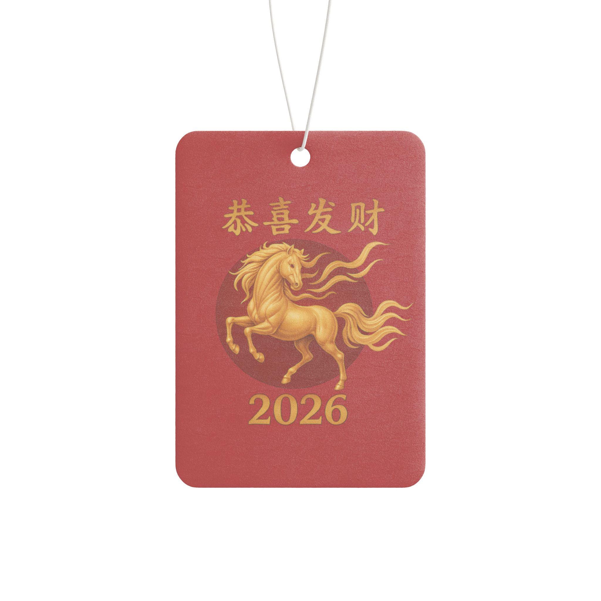 Carry a little celebration into every drive. This richly colored car air freshener pairs a warm red backdrop with a gold galloping horse and 2026 — a small, elegant reminder of prosperity and new beginnings. Choose from three distinct scents: the crisp, modern crispness of New Car with green and leather notes; the cool, forest-fresh Pine with balsam fir and apple; or the bright, invigorating Black Ice with citrus lifts. Lightweight and printed on sturdy 80 pt. paper board, the design appears on both sides so the motif reads from every angle. Hang it from your rearview, tuck it by the vents, or gift it to someone who loves a little symbolic charm in their commute.