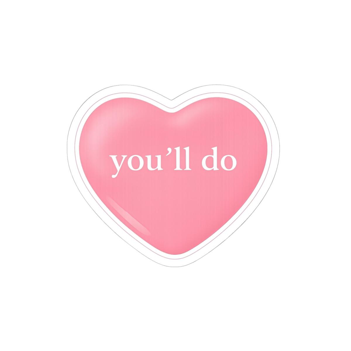 A glossy kiss-cut sticker that reads “You'll Do” inside a warm, hand-drawn heart — made to stick love notes where they’ll be seen. The vibrant, eco-solvent printed colors pop against laptops, journals, or the window by your desk, catching sunlight and sparking a quiet smile. The vinyl face and permanent acrylic adhesive hold fast on smooth, flat surfaces while the scratch-resistant finish keeps the art bright through everyday use. Sized choices and white or transparent backgrounds let you place it on dark or light surfaces without losing contrast. These stickers bring a little valentine’s warmth to someone’s daily routine — a small, tactile reminder of affection that fits into the rhythm of gift exchanges, card swaps, or cozy valentines displays.