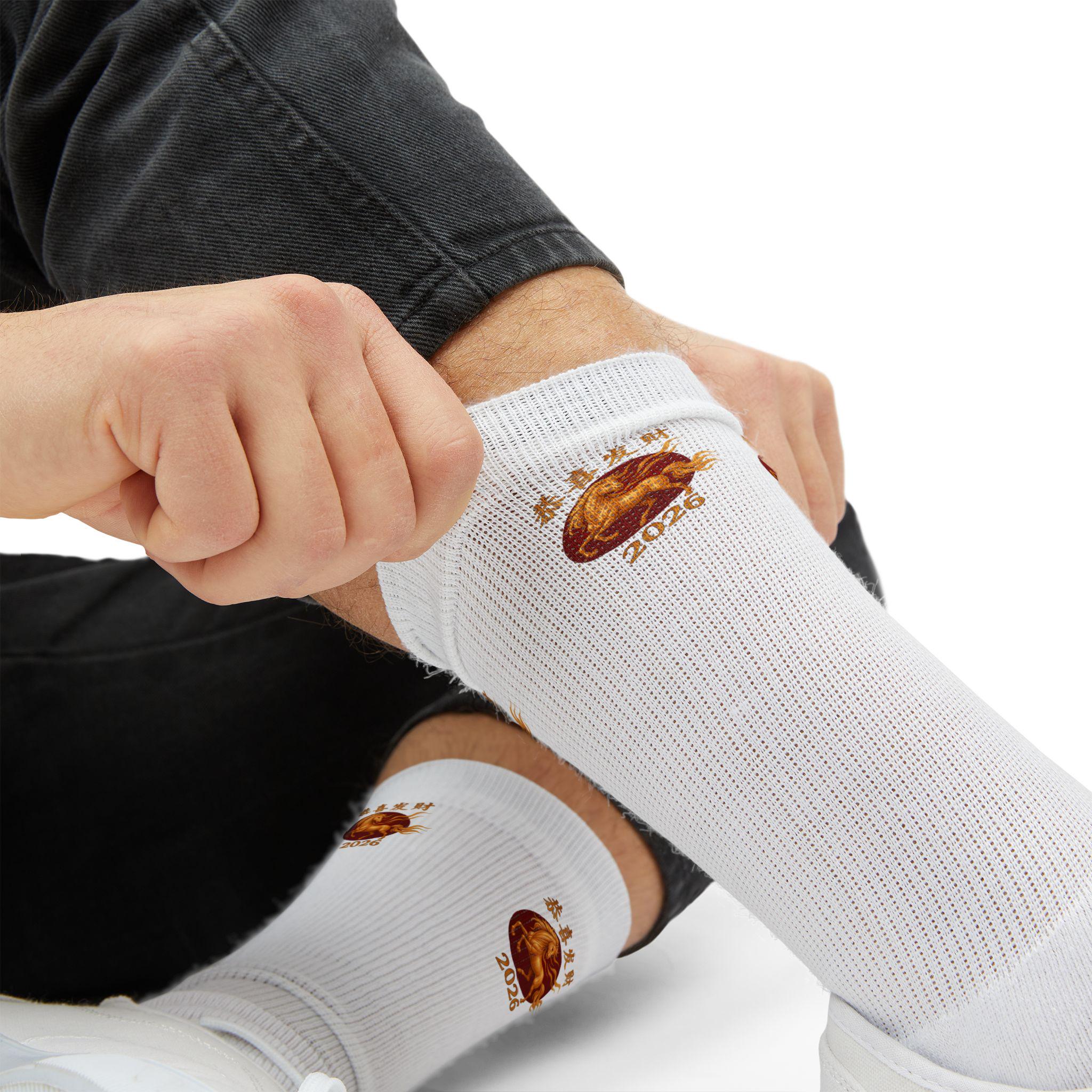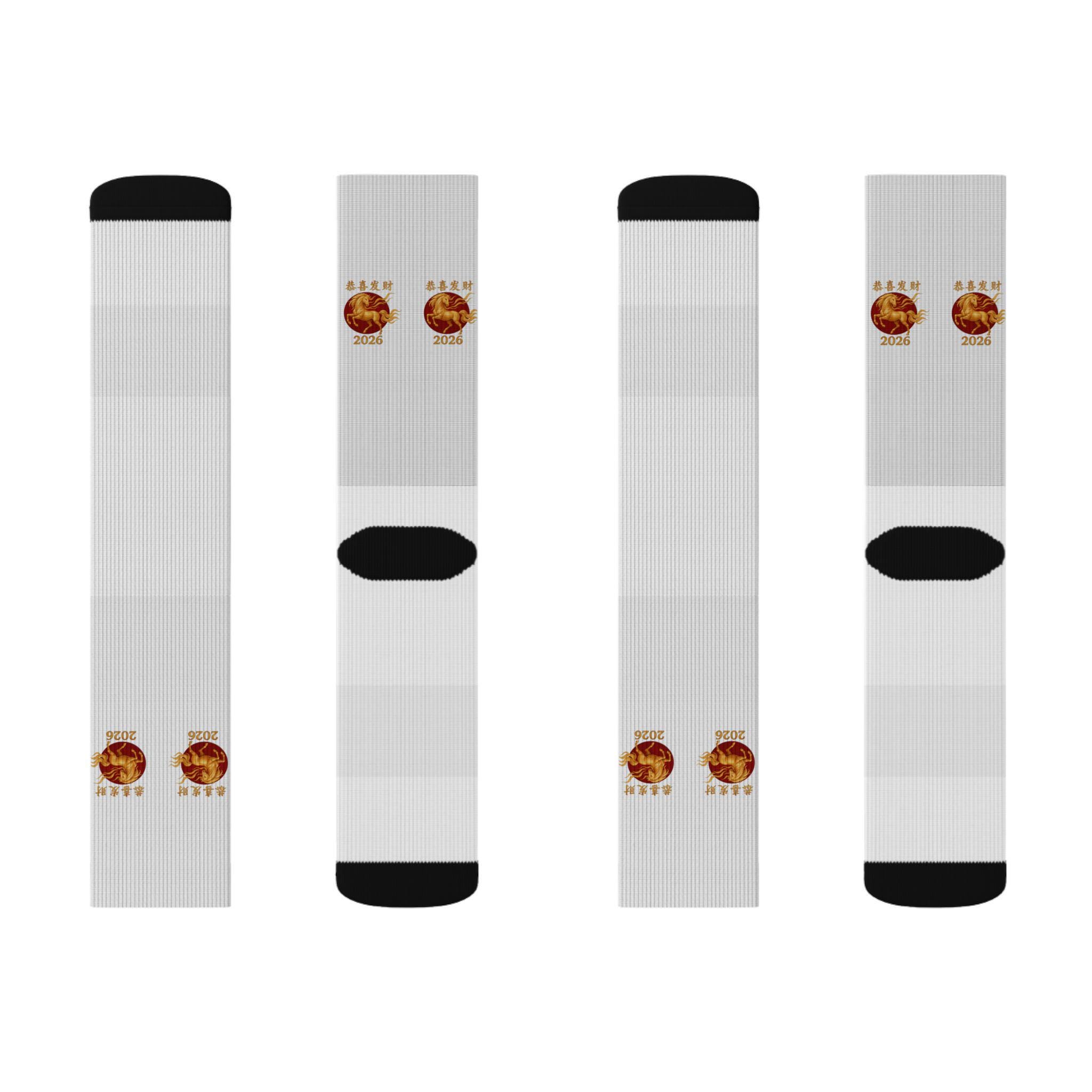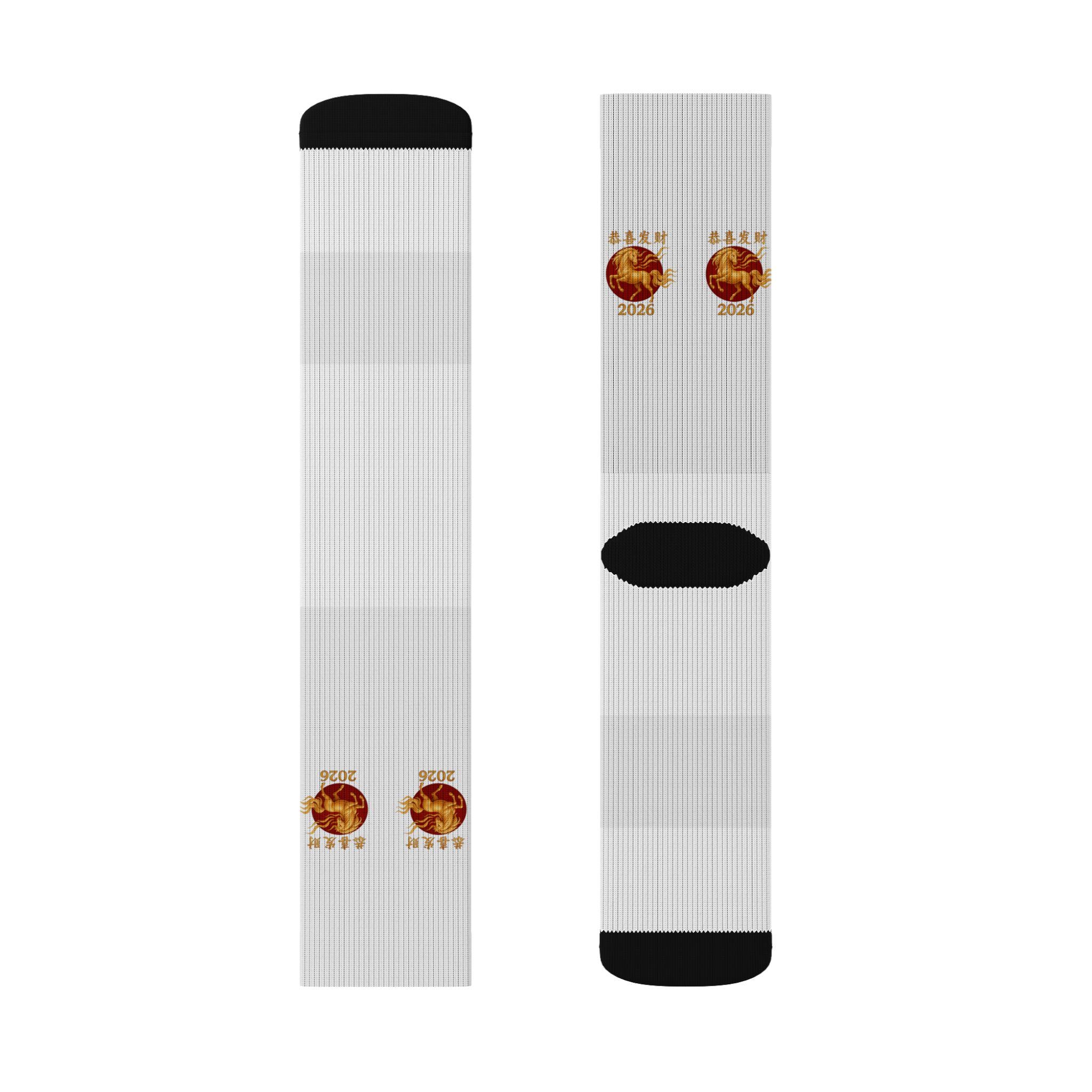 Celebrate Lunar New Year 2026 with these vibrant horse-themed crew socks. Soft fleece cushions your steps while the all-over sublimation print wraps the sock in bold lunar motifs — a lively nod to the Year of the Horse. The mid-calf length and ribbed tube hold the socks comfortably in place, while cushioned bottoms and a stretchy polyester-spandex blend keep them cozy through chilly mornings and crowded festival streets. Made in three sizes with a unisex fit, these socks are built to be worn during family gatherings, temple visits, or late-night walks under lantern-lit skies. Note the flat sublimation process may show slight color variation at the side seams, which adds to each pair’s unique character.