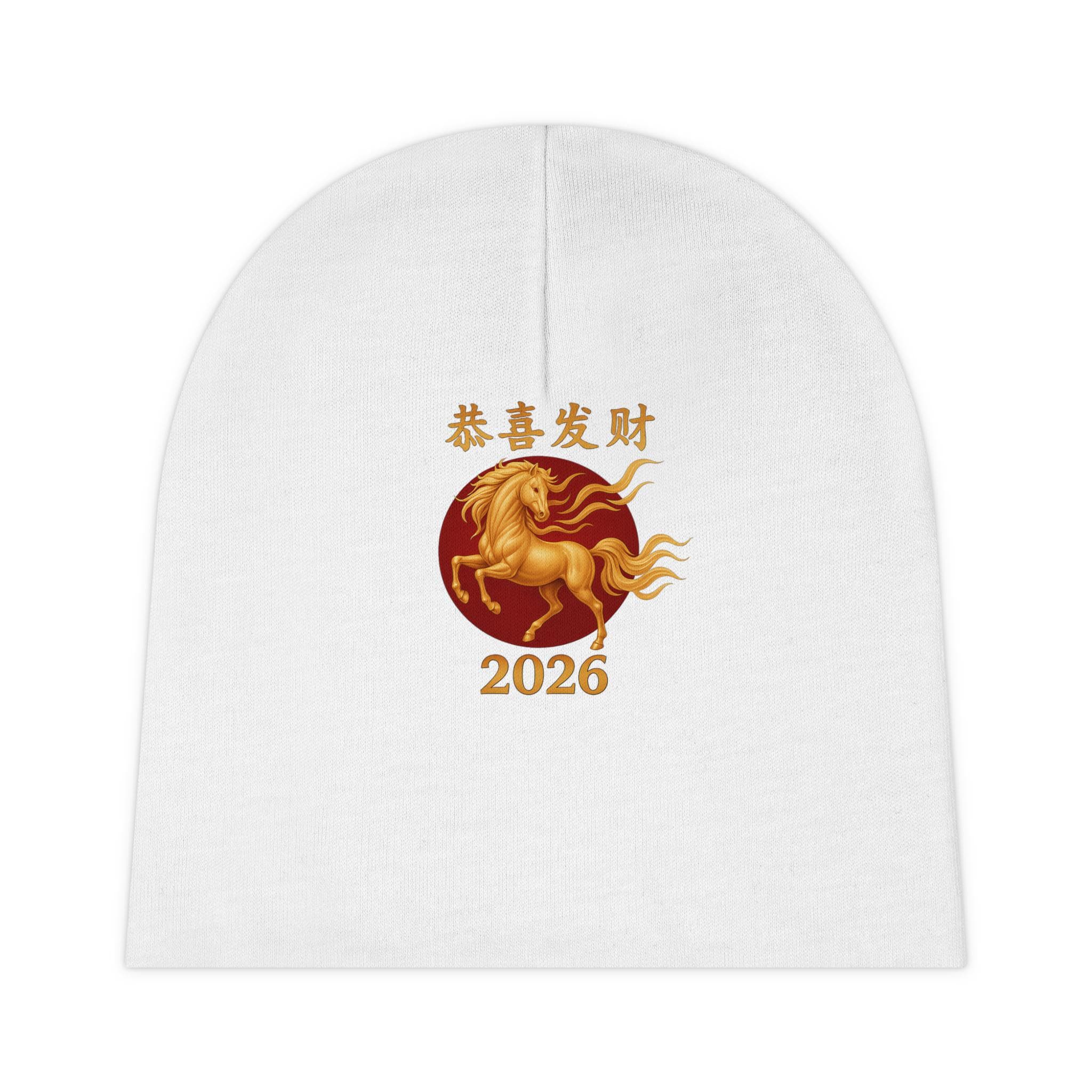 A soft, stretchy baby beanie crafted for little heads and festive beginnings. The lightweight interlock knit holds its shape while offering gentle stretch for newborns. A warm golden horse emblem sits against a deep red medallion, with the year 2026 and auspicious Chinese characters above — a subtle nod to tradition and celebration. It’s breathable and quick-drying, with the design printed on both sides so the motif shows whether the hat shifts or stretches. Wear it at family gatherings, Lunar New Year visits, or quiet moments at home when you want a tiny touch of good fortune and cultural charm.