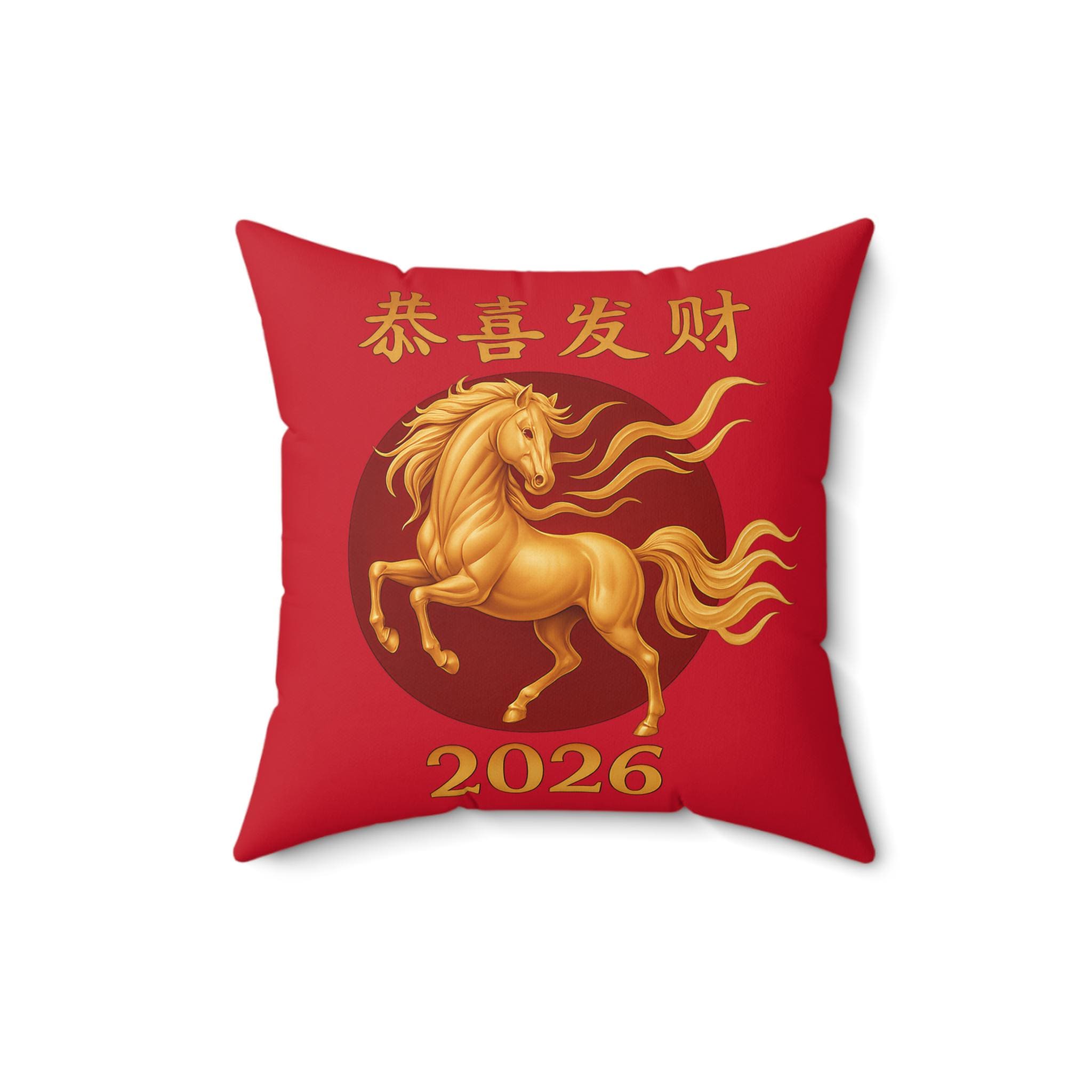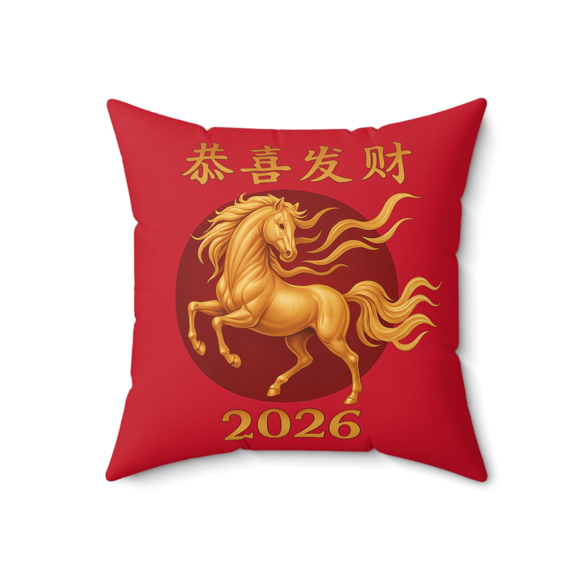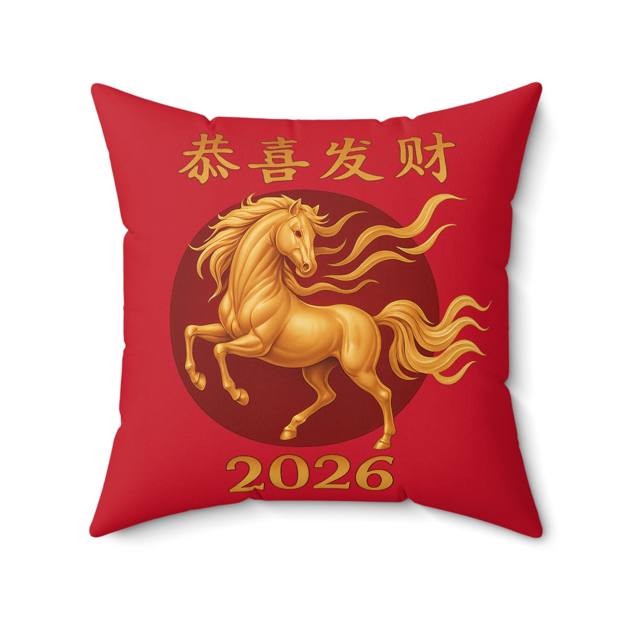 Bring bold luck and warm color into a living room or entryway with this vibrant square pillow. The double-sided print features a flowing golden horse set against a deep red background, with traditional Chinese characters and the year 2026 in gold—an energetic symbol that speaks to celebration, prosperity, and forward motion. The spun polyester cover keeps the surface smooth and wrinkle-free, while the recycled polyester insert ships separately and expands inside the cover to create a plump, full look. It’s a statement accent that layers easily with neutral sofas or more colorful seasonal decor.