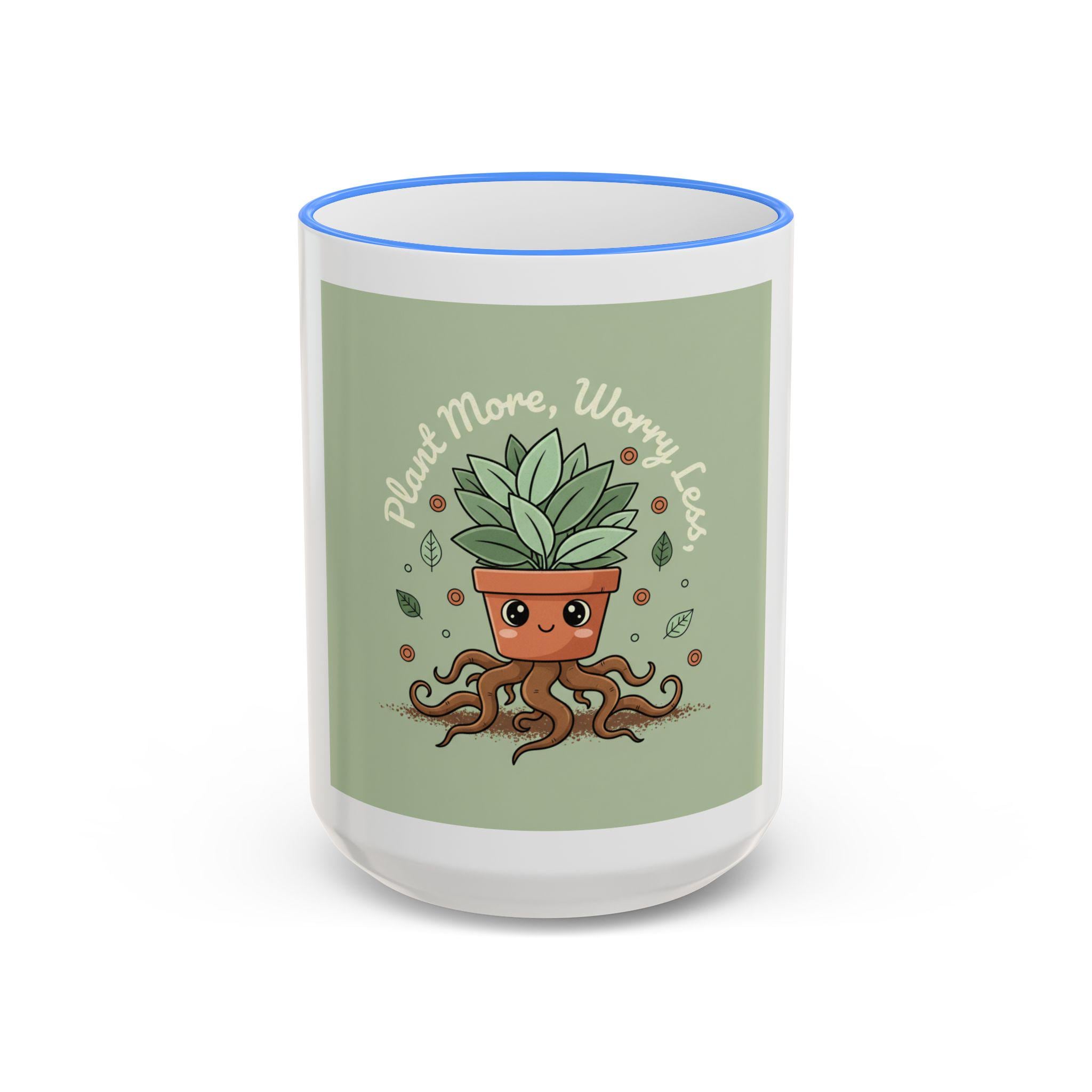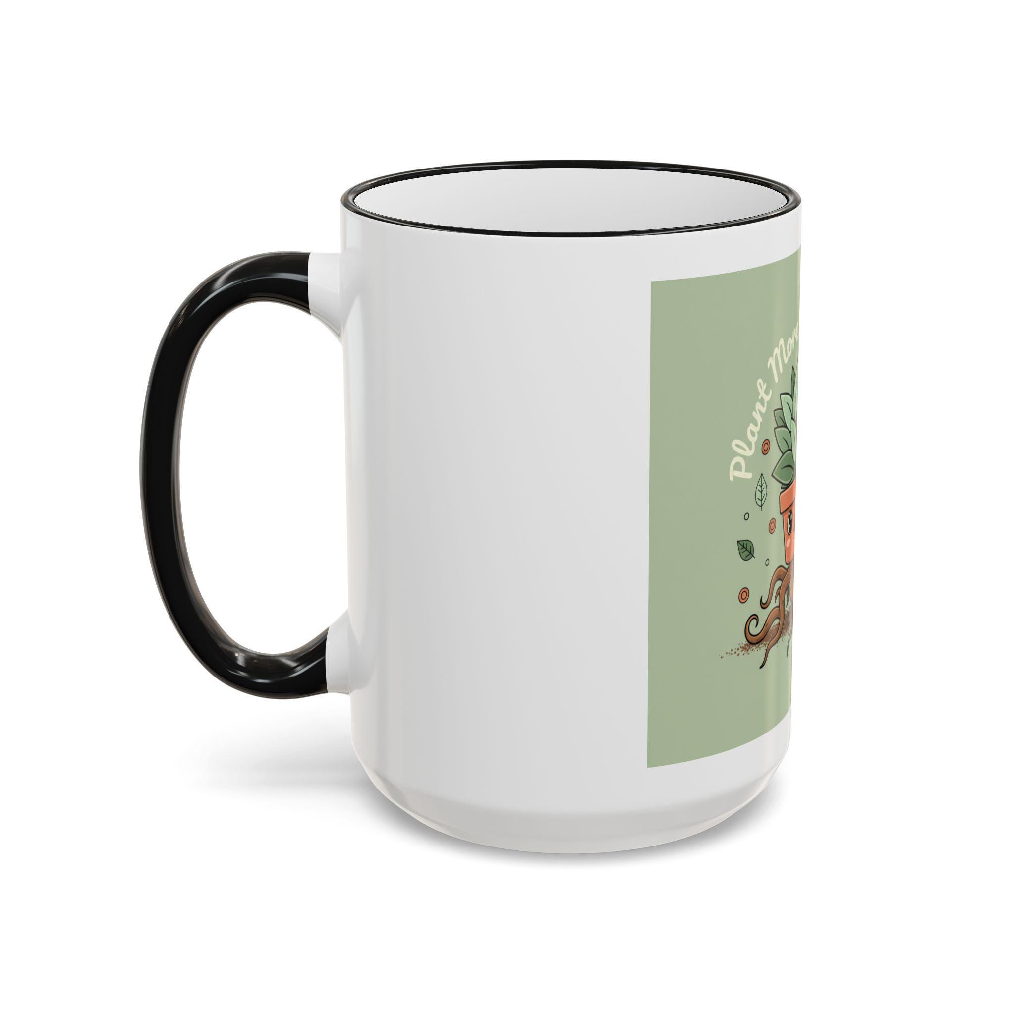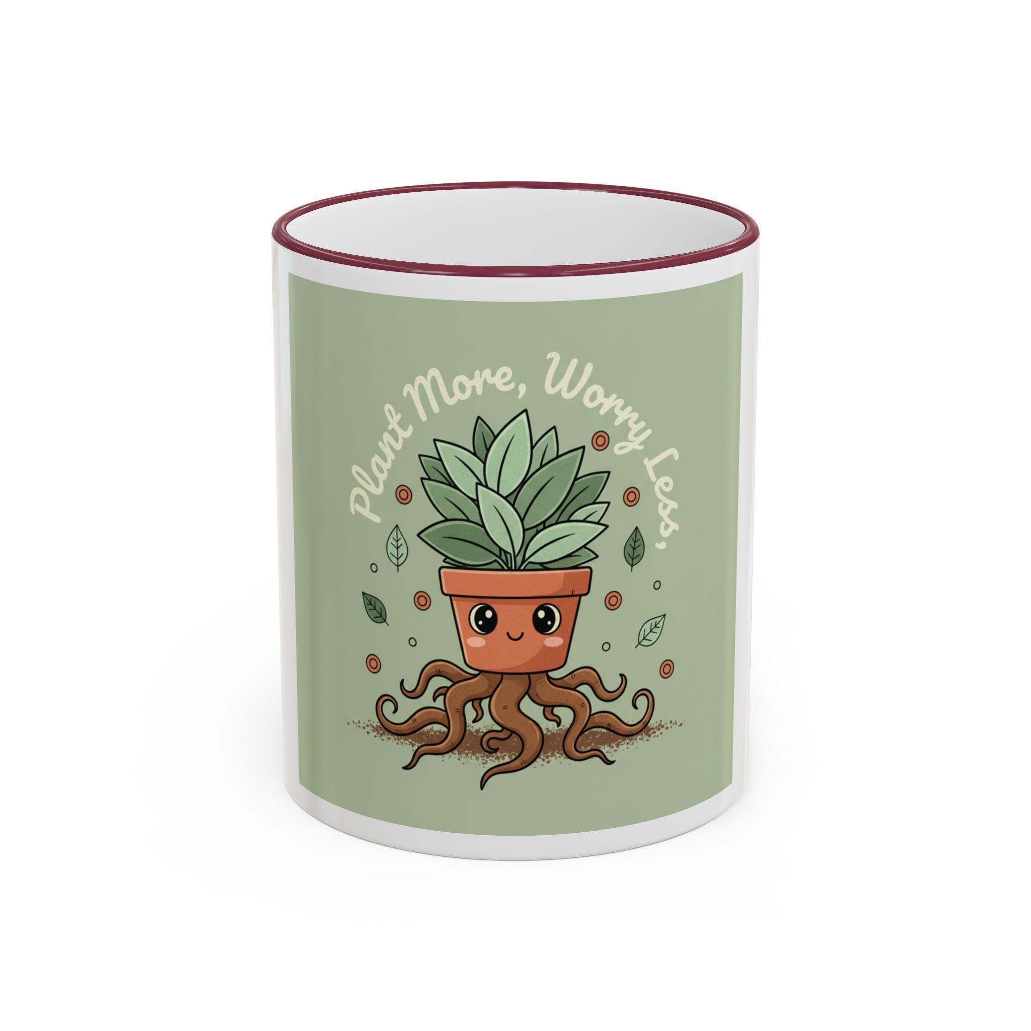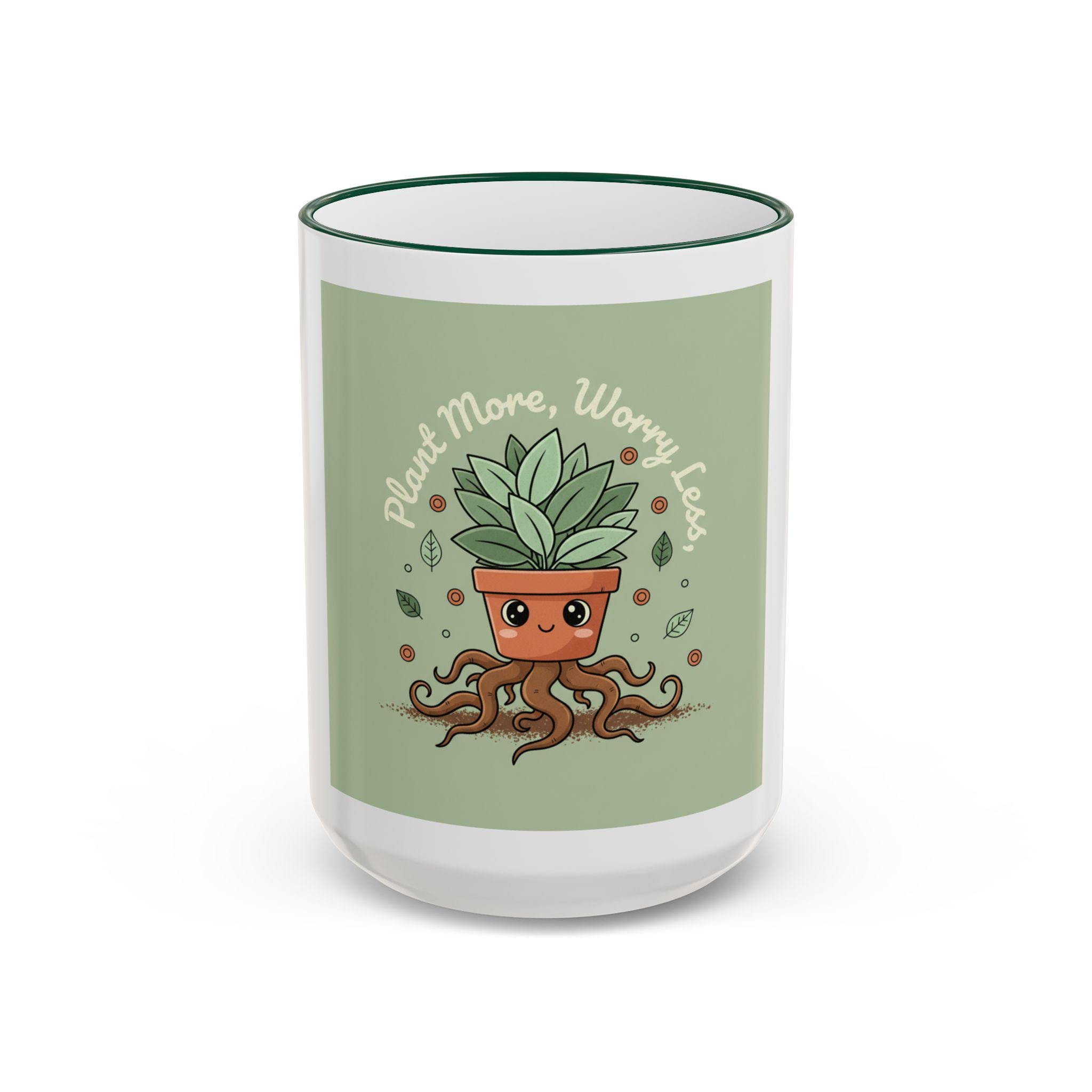 A cheerful accent-rim mug that brings a little green joy to slow mornings and busy desks. The glossy white ceramic body frames a playful plant-pot illustration with rooting, animated tendrils and the uplifting line “Plant More, Worry Less.” The colored rim and handle add a subtle pop that ties the artwork into the rest of your kitchenware. Warm tea, strong coffee, or an afternoon matcha — this mug feels like a small ritual: comforting, grounded, and gently encouraging. It’s lighthearted enough to make coworkers smile and sturdy enough to become part of a daily routine.